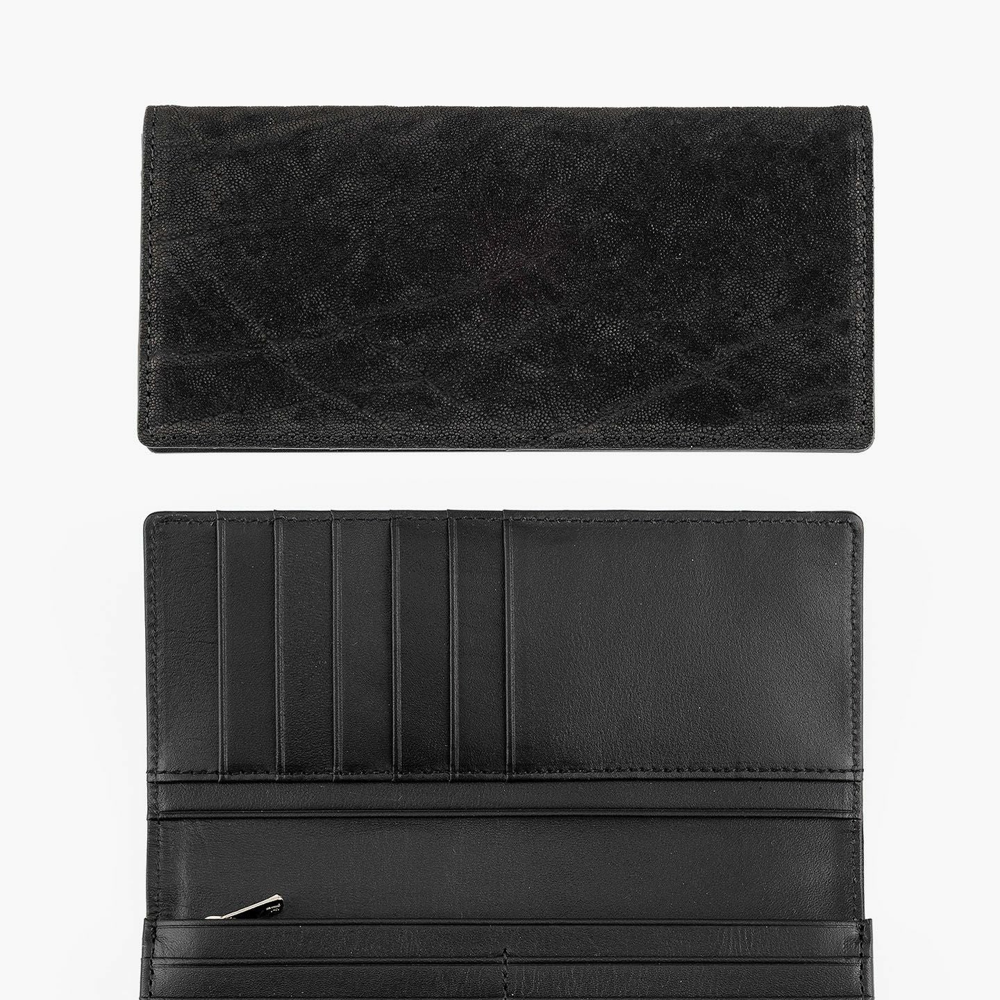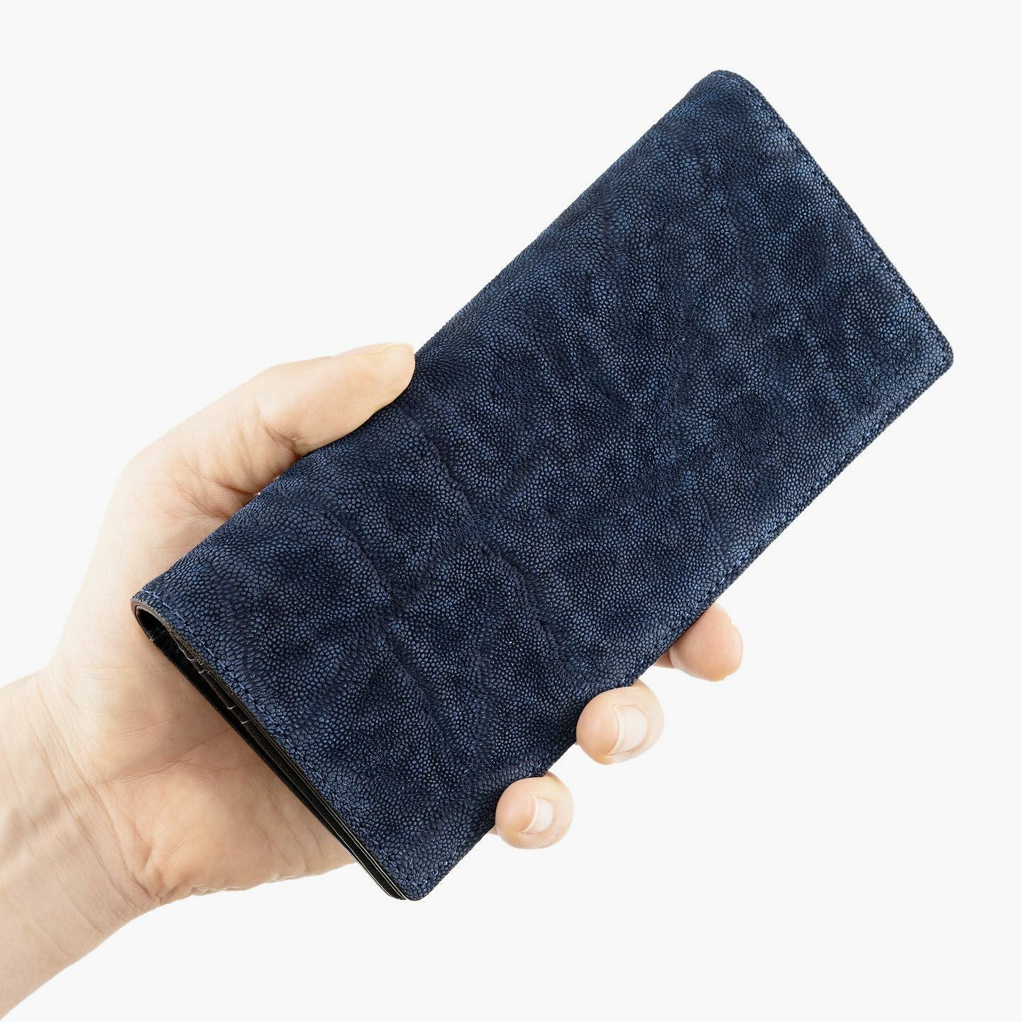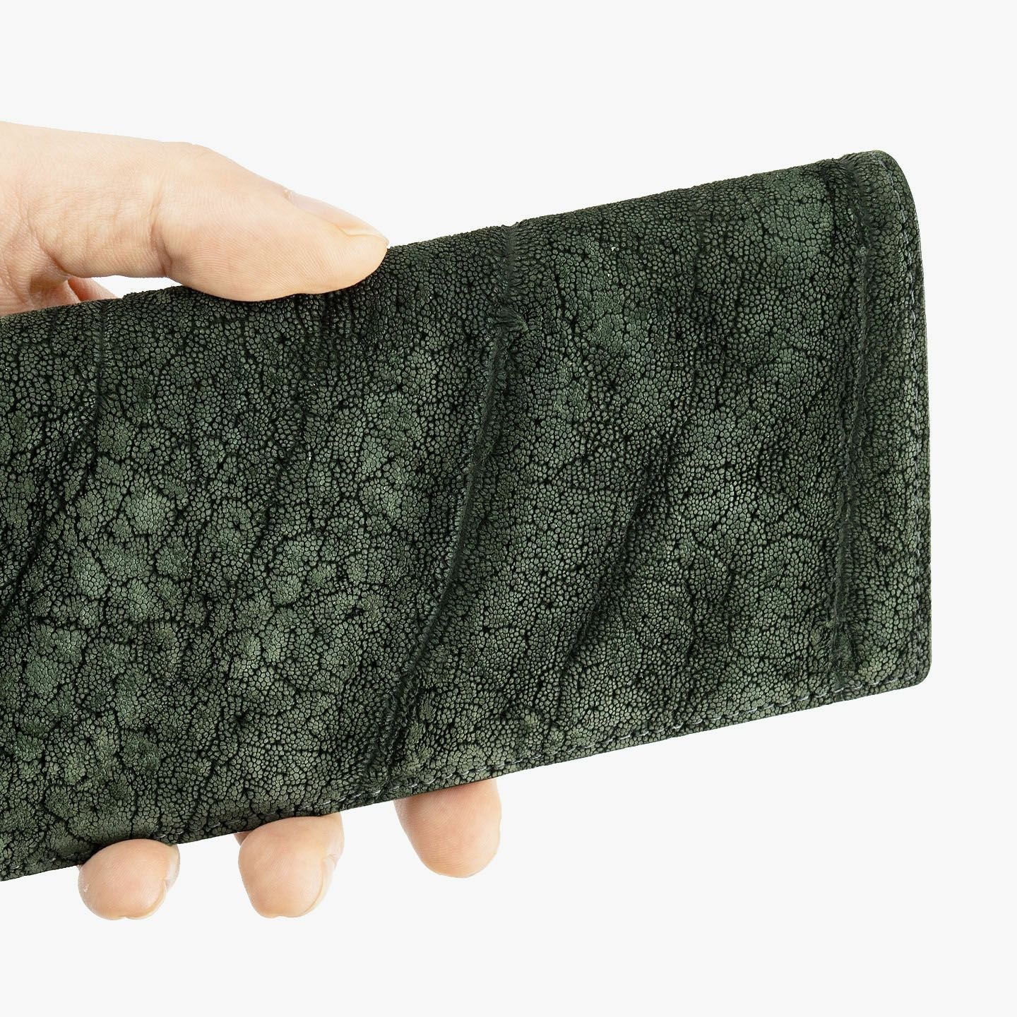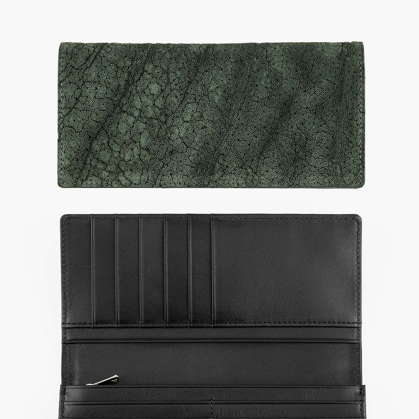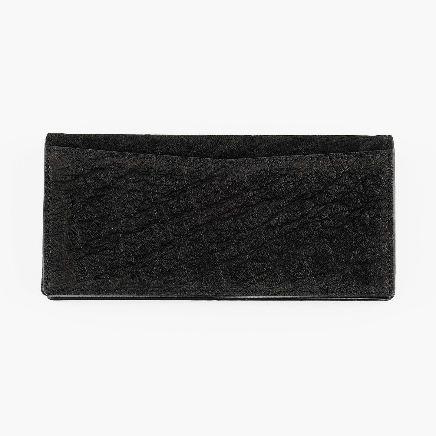厳格な条件のもと国際取引が認められている、ジンバブエに生息するアフリカゾウの鼻・喉の部分のみを使用した、とても希少な「エレファントレザー」。エキゾチックレザーのひとつでもあるゾウ革は、非常に丈夫であるとともに、キズに対する耐性や撥水性に優れ、厚みがありながらも柔軟性にも富んでいます。また、表面には、細かい粒状の凹凸が広がっていて、部位により不規則なシワが入った表情が、惹きつけられる魅力にもなっています。さらに、ゾウ革においては、表皮を擦り取って起毛させた、ヌバック調に仕立てているのが一般的。細かい粒状隆起や大ぶりなシボ・トラ(スジ状のシワ)などが、複雑に絡み合って織り成すワイルドな風合いも特長的です。そして、それらの表情は、不規則なので同じように見えるものがなく、オンリーワンの個性を創出。使い込むほどにツヤ・色味が増していく、魅力的なエイジングも楽しめます。