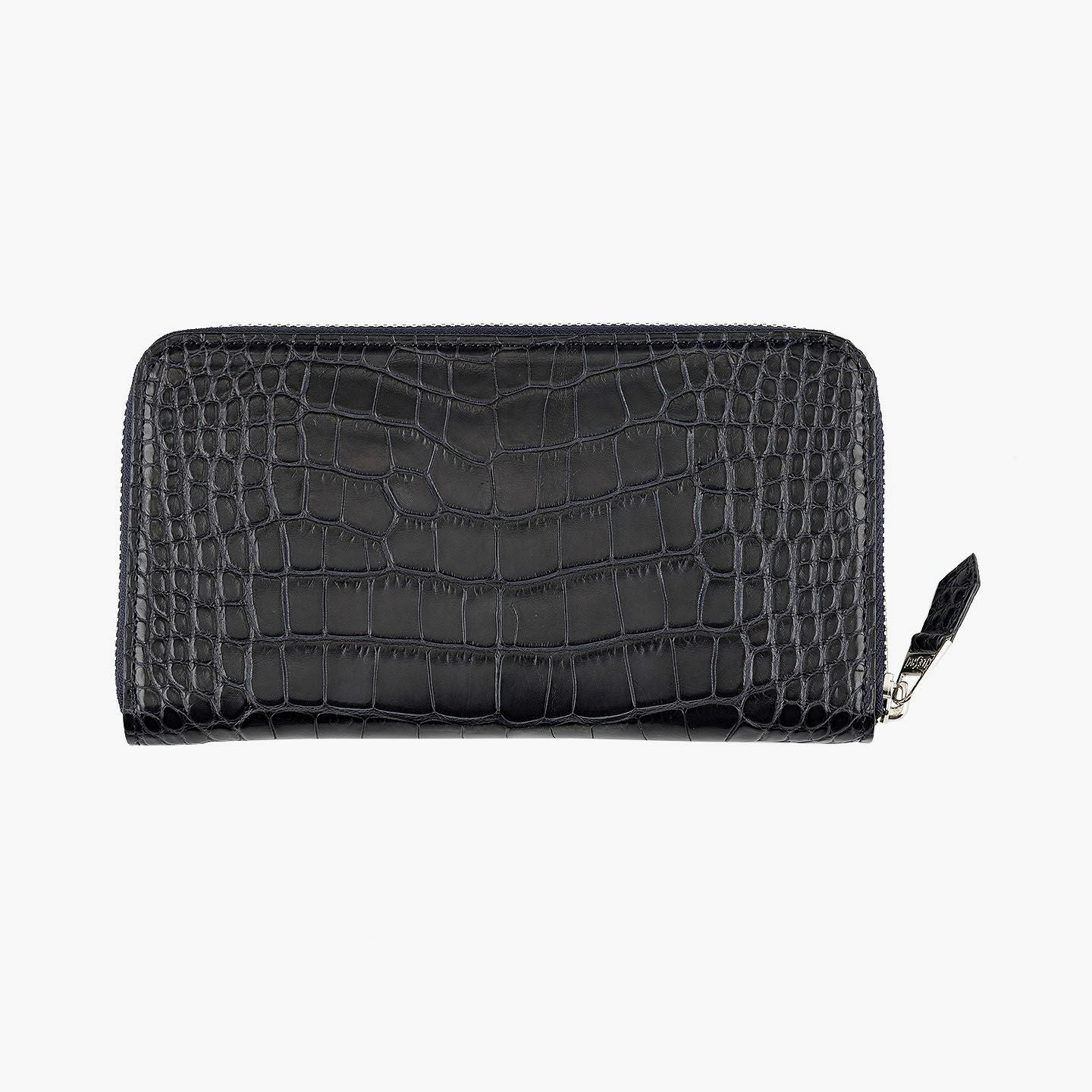 真の絶対価値を追求するために、すべてのパーツ・工程に独自の価値基準を設け、唯一無二のモノづくりにこだわっている、エキゾチックレザー専業ブランド『LE’SAC』のラウンドジップ長財布。上質な斑のバランスが美しいワニ革「アリゲーター」の人気色Navyを、外装として纏わせた比類なき高級感が、それを引き立てるファスナーのシルバーとともに、独特の贅沢感と満足感を醸成。ファスナー式小銭入れをセンターにしたシンメトリーデザインの内装は、札入れ2・カードポケット12・フリーポケット2の優れた収納力を装備するとともに、ダークブラウンの上質な牛革が、落ち着きのあるマットな風合いで、大人の上品さを奏でてくれます。
