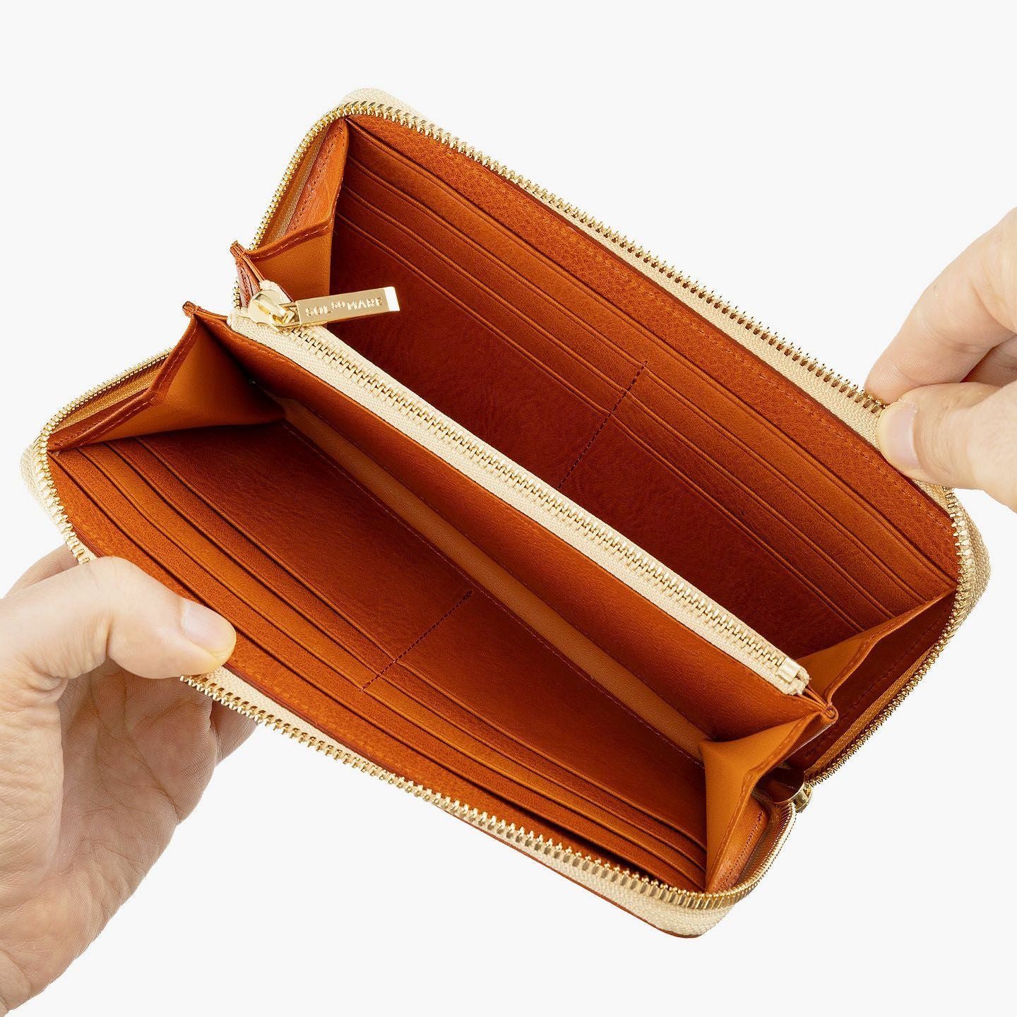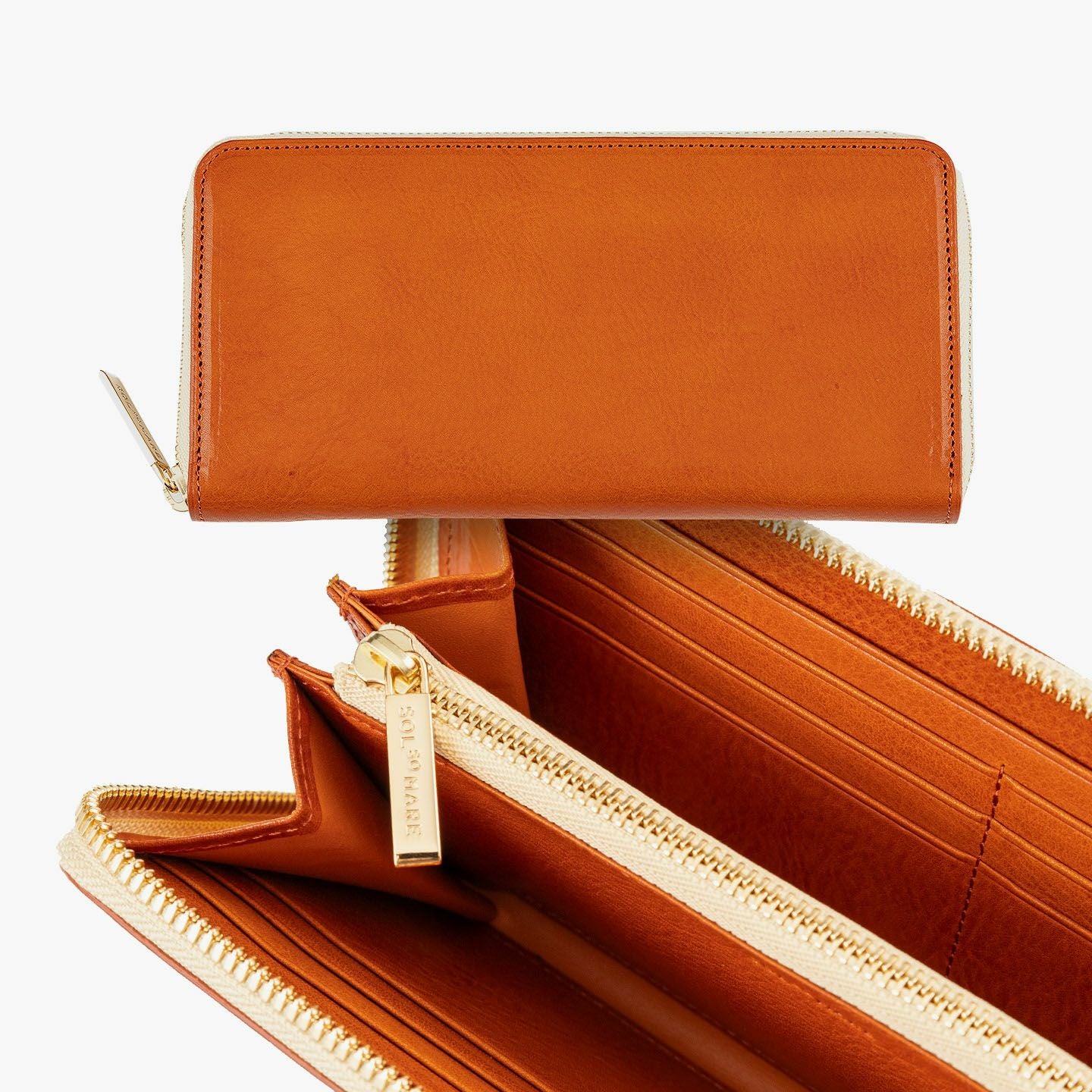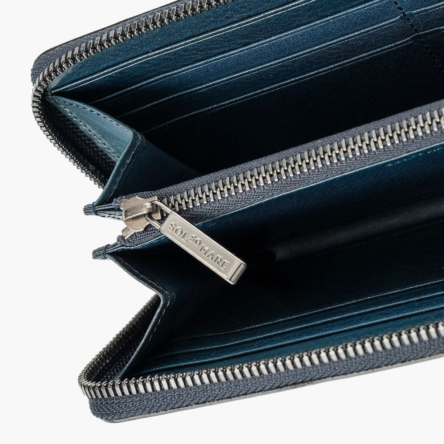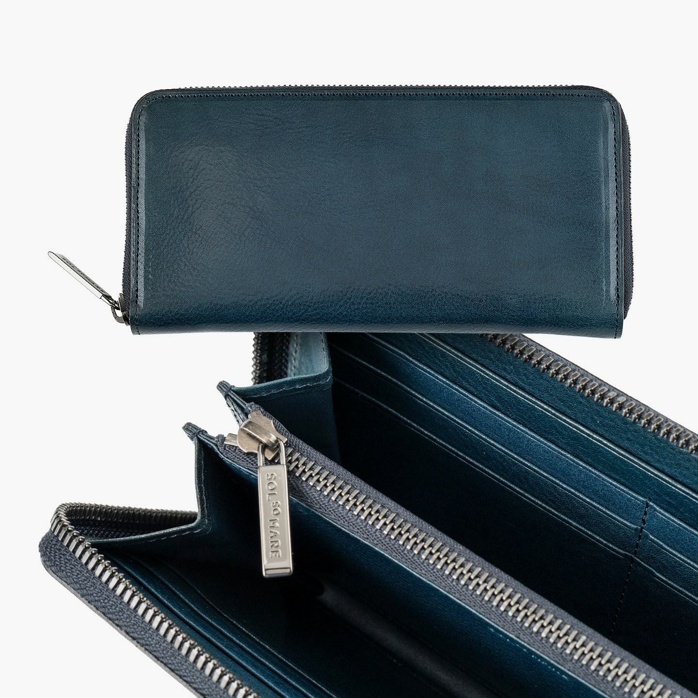 かけがえのない時間や空間へ、モノがあふれる時代のレザーアイテムとして、自然の情緒と色彩の感動を届けている、ファクトリーブランド『SOLSOMARE』のラウンドジップ長財布。深みのある落ち着いた色合いの「イタリアンショルダー」は、Orange/Navy Blueのいずれかからセレクトでき、そのカラーごとに異なる金具・ファスナーテープとの配色が洒落感を演出。丈夫で経年変化を楽しめる牛革の風合いを感じながら、大容量の収納力を併せ持つとともに、紙幣・小銭・カードなどが見やすく出し入れしやすい使い勝手の良さが、日常使いの満足感を高めてくれる。
