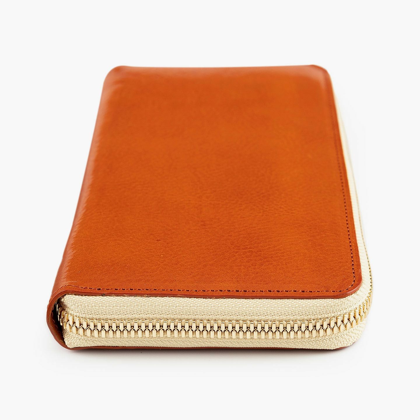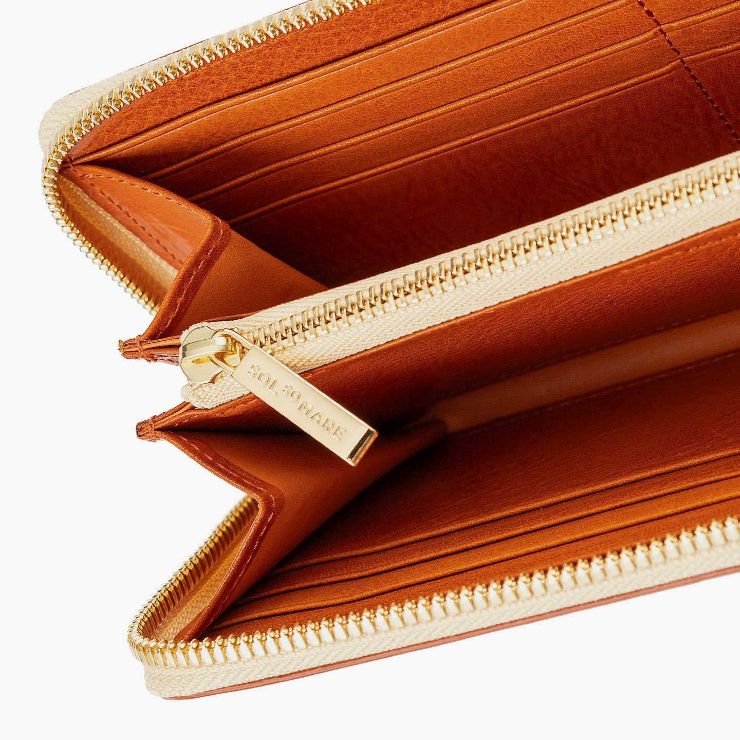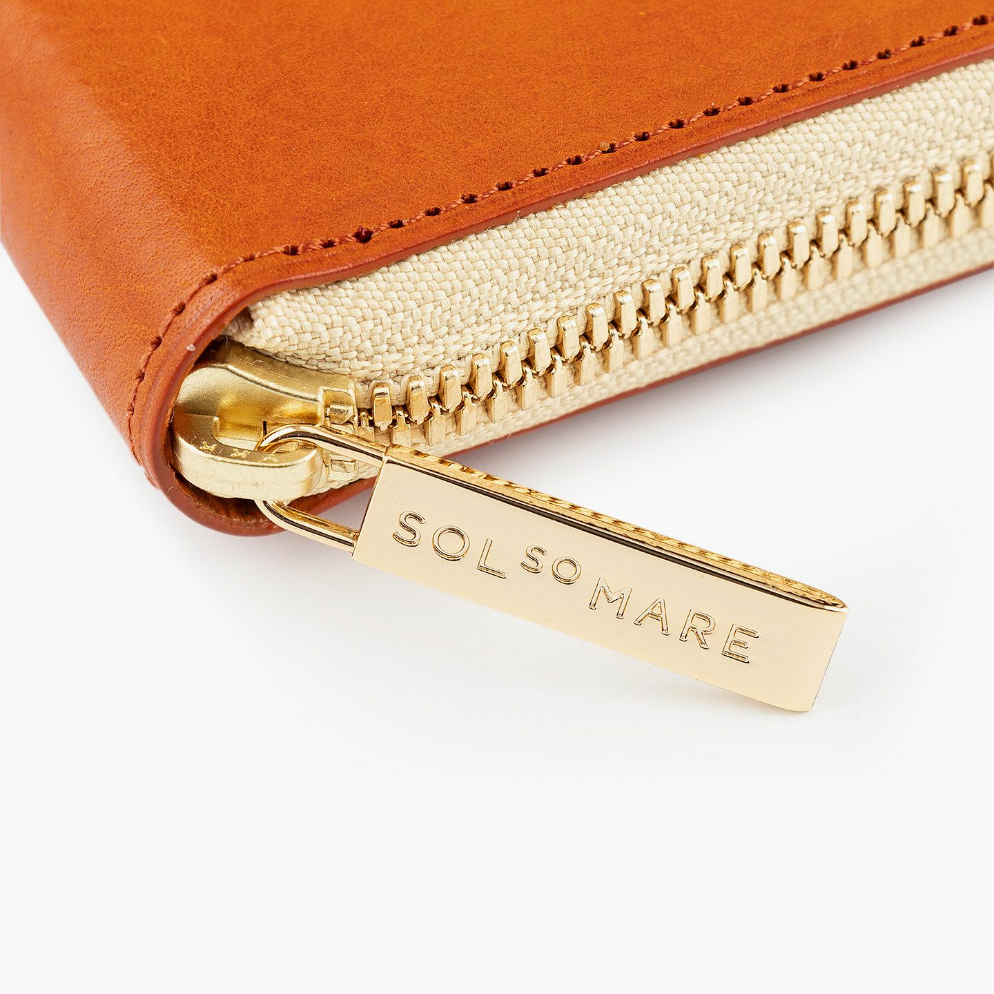 かけがえのない時間や空間へ、モノがあふれる時代のレザーアイテムとして、自然の情緒と色彩の感動を届けている、ファクトリーブランド『SOLSOMARE』のラウンドジップ長財布。深みのある落ち着いた色合いの「イタリアンショルダー」は、Orange/Navy Blueのいずれかからセレクトでき、そのカラーごとに異なる金具・ファスナーテープとの配色が洒落感を演出。丈夫で経年変化を楽しめる牛革の風合いを感じながら、大容量の収納力を併せ持つとともに、紙幣・小銭・カードなどが見やすく出し入れしやすい使い勝手の良さが、日常使いの満足感を高めてくれる。