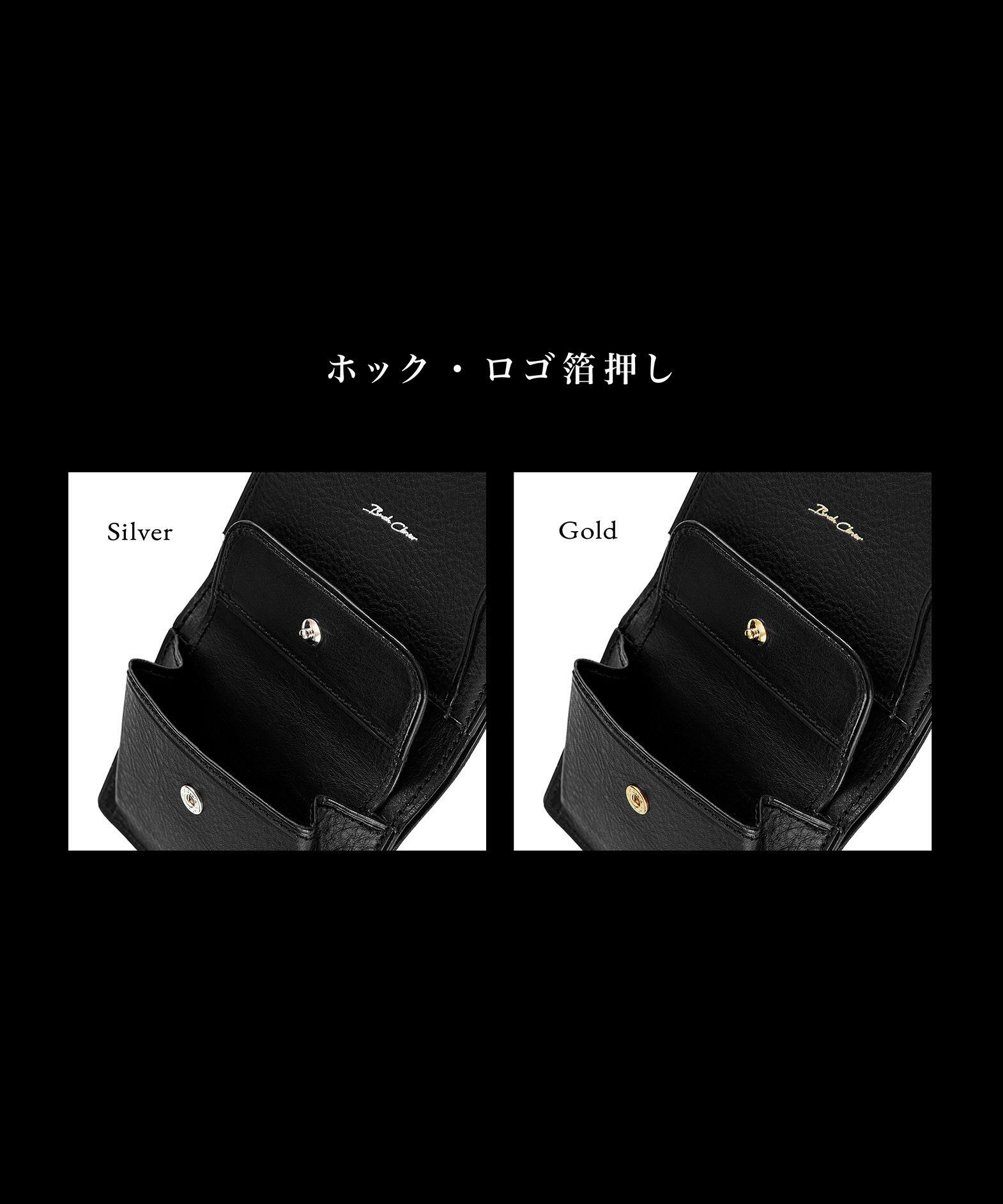札スペースの仕切りにもなっている表裏のカードユニットは、サイドからカードを差し込むカードポケットと、その背面に2枚〜3枚ほどのカードを入れられるフリーポケットを装備。札スペース側のカードポケットには、指でカードを押して取り出しやすくする穴が設けられているのも特長的です。マチ付きのコインポケットには、20枚ほどのコインを収納することが可能。その裏にもフリーポケットを備えているとともに、外装背面にもフリーポケットが設けられ、タッチ決済や交通系のカード収納として便利に使えます。また、外装・内装の「ミネルバボックス」は、Nero・Tabacco・Cognac・Buone・Orivaの5色から選ぶことができ、ホック・ロゴ箔押しは、Silver・Goldのいずれかからセレクト可能。さらにカード・紙幣などの出し入れがしやすいように、右利き用・左利き用をチョイスできるなど、使い勝手にもこだわった三つ折り財布です。