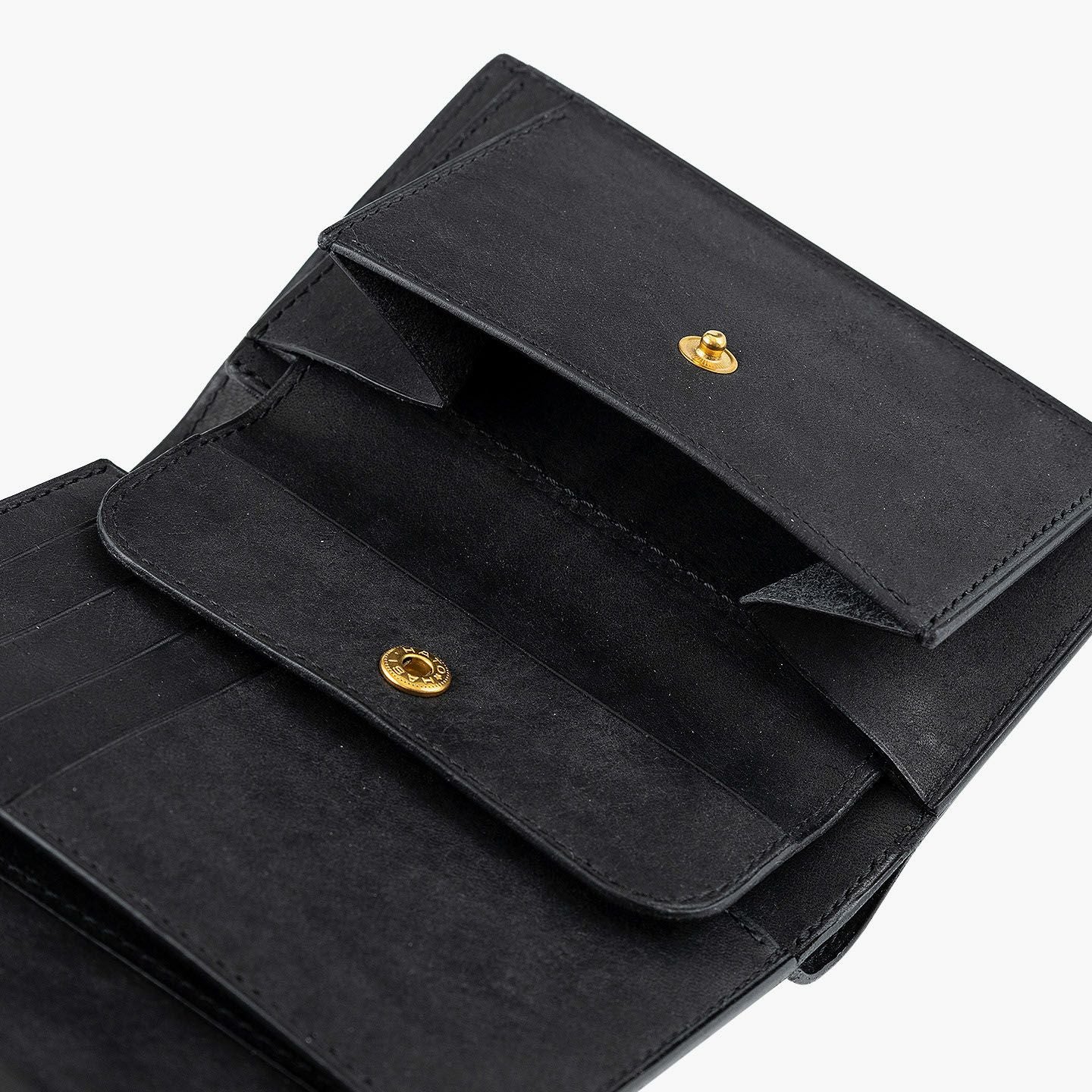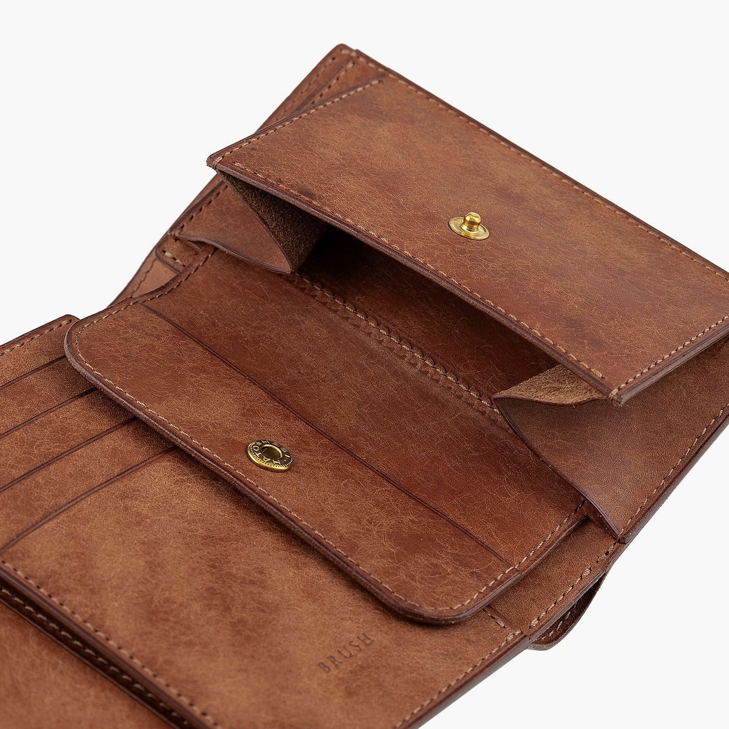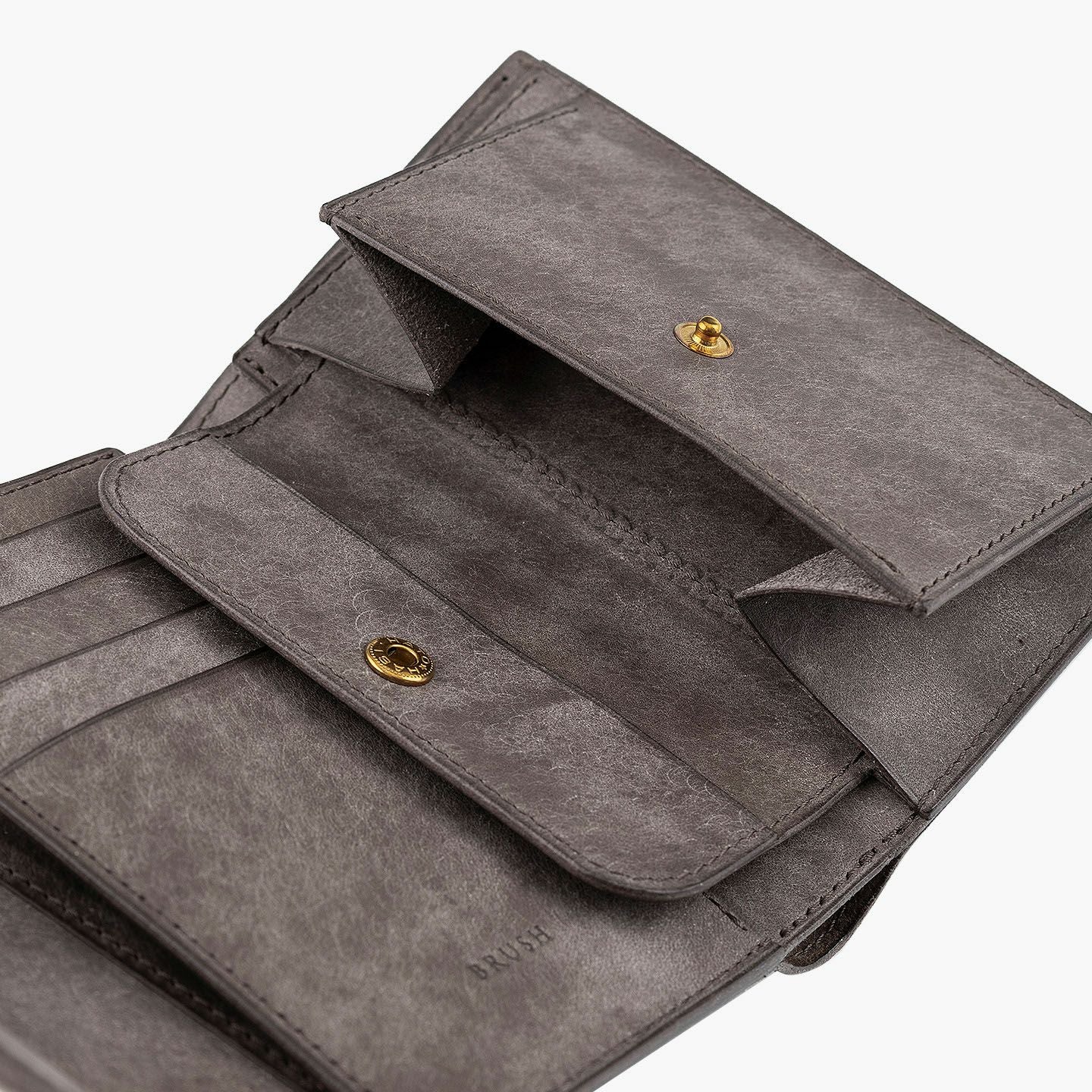 日本の工場にて真鍮の塊を削り出して成型しているフロントのオコシ金具は、丈夫で壊れにくく開閉時の重圧感・本物感も醸し出す挽物。イタリア産レザー「マルゴー」は、MLS別注カラー「Moss Green」とブランドラインナップ3色による、計4色からのセレクトオーダーが可能です。片側をあえて縫い付けていない札ばさみは、大きく開く視認性の良さに加えて、親指を掛けられるU字の窪みを設けることで扱いやすく、窪みの深さも女性の手のサイズに合わせた設計になっているのも魅力。さらに、収納性に優れたコインポケットとともに、カードポケット4つを備えたカード段、そのカード段の裏とコインポケットの裏にフリーポケット1つずつを装備し、充実した収納力も兼ね備えています。