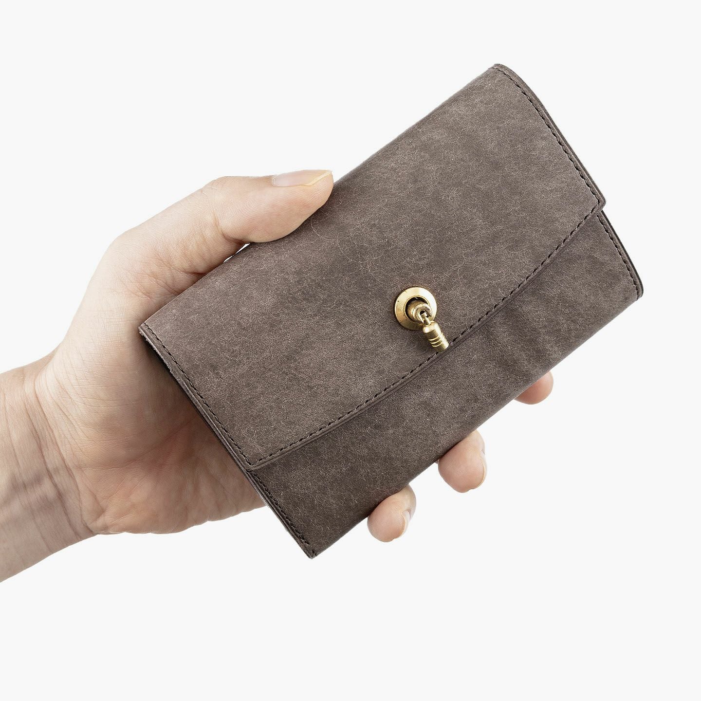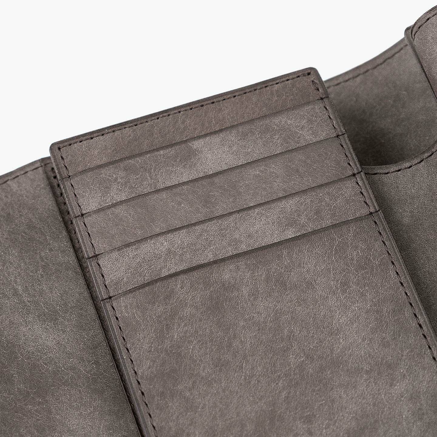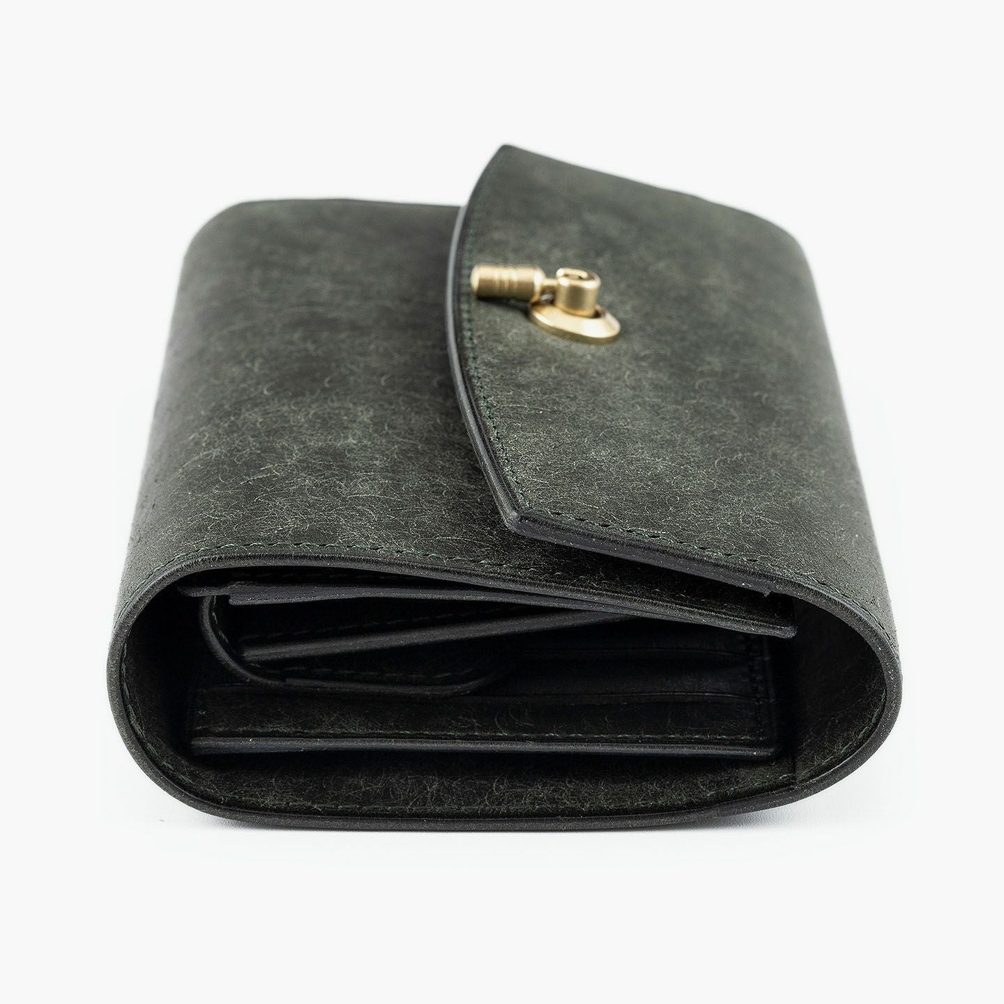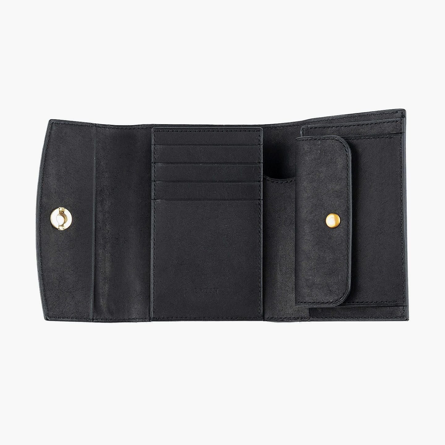 日本の工場にて真鍮の塊を削り出して成型しているフロントのオコシ金具は、丈夫で壊れにくく開閉時の重圧感・本物感も醸し出す挽物。イタリア産レザー「マルゴー」は、MLS別注カラー「Moss Green」とブランドラインナップ3色による、計4色からのセレクトオーダーが可能です。片側をあえて縫い付けていない札ばさみは、大きく開く視認性の良さに加えて、親指を掛けられるU字の窪みを設けることで扱いやすく、窪みの深さも女性の手のサイズに合わせた設計になっているのも魅力。さらに、収納性に優れたコインポケットとともに、カードポケット4つを備えたカード段、そのカード段の裏とコインポケットの裏にフリーポケット1つずつを装備し、充実した収納力も兼ね備えています。
