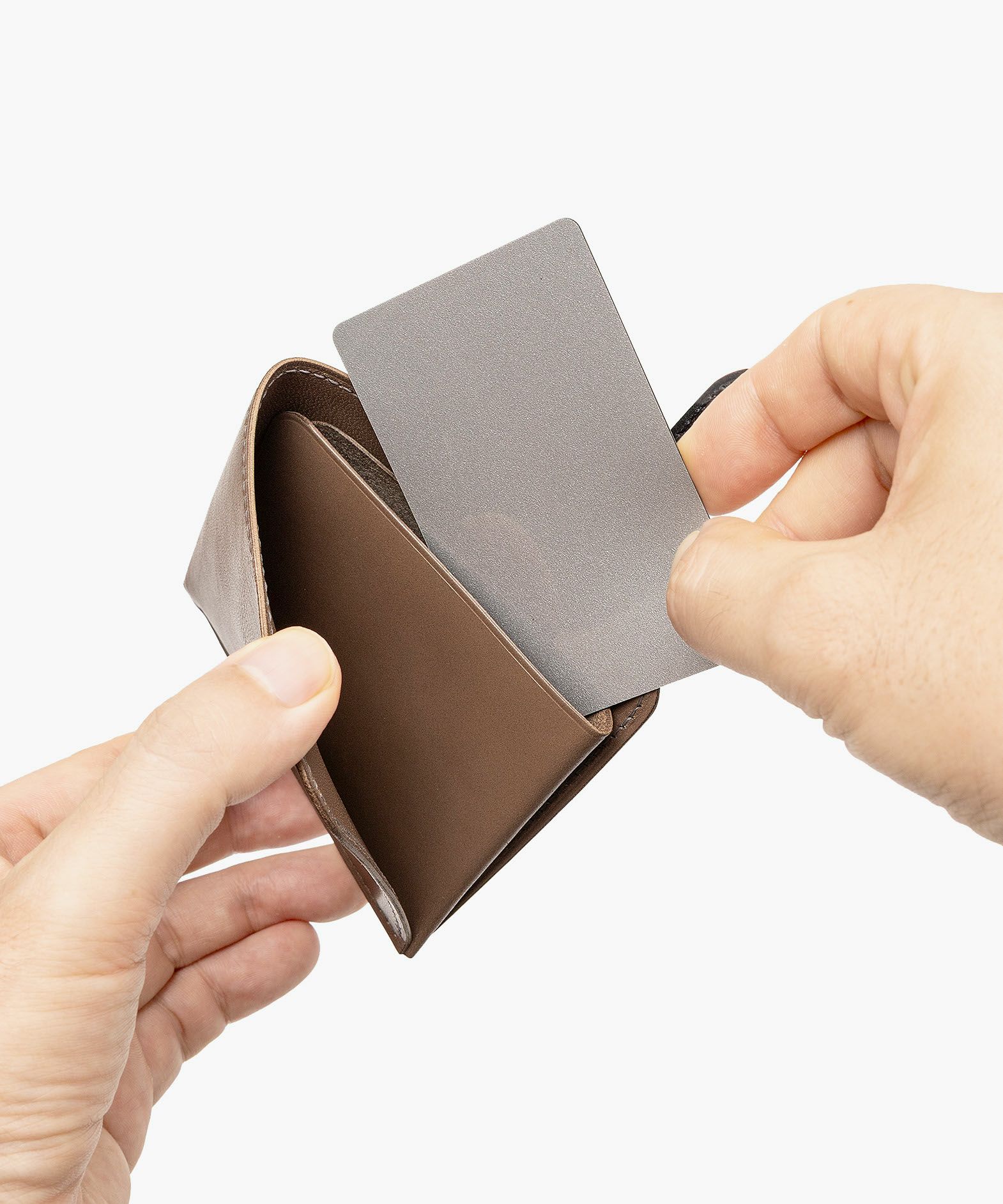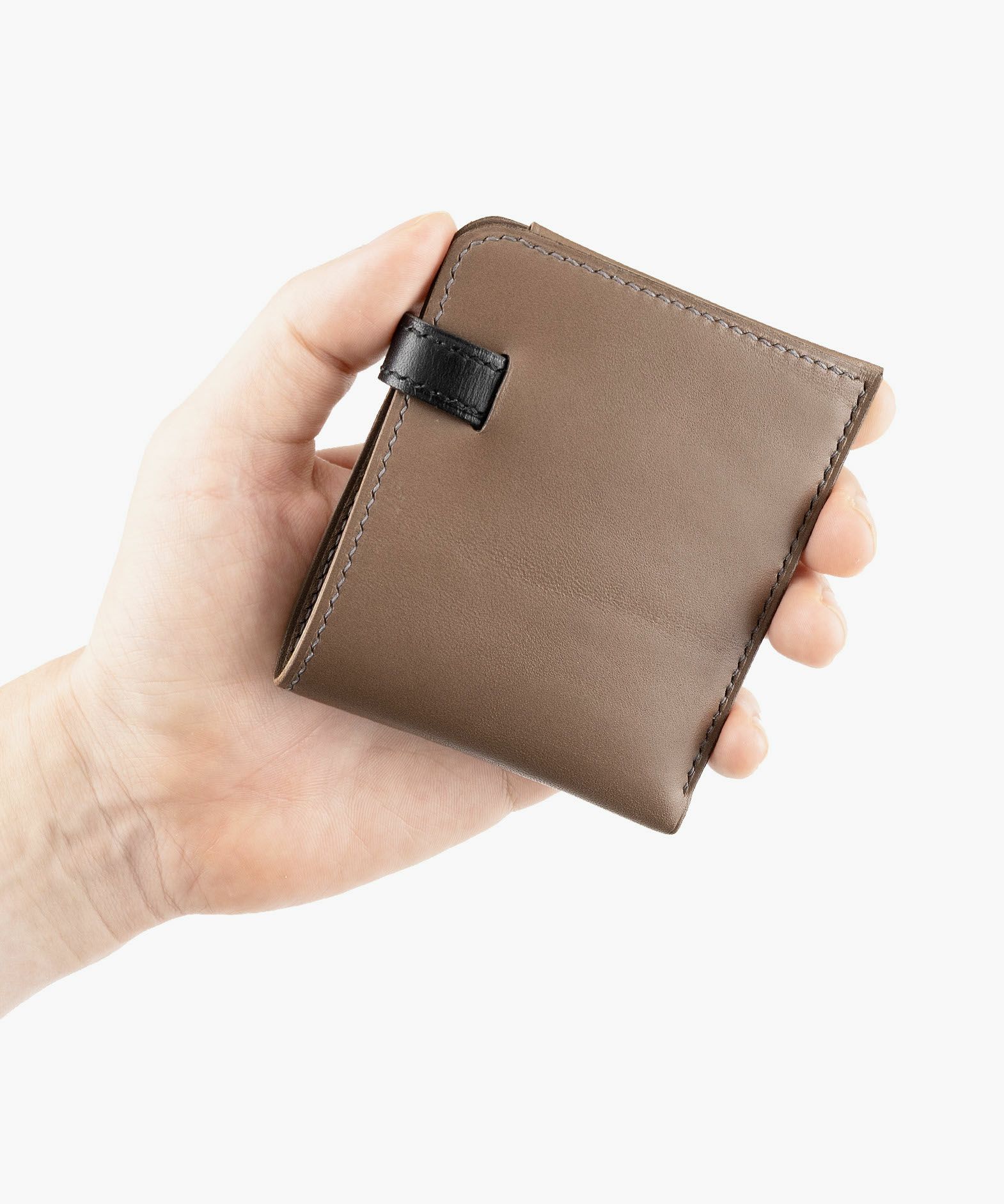 あえてコインケースを省くことで、スマートにポケットに収まる極限のスリムさを追求した、L型コンパクトウォレット“HAKU”。外装&内装・ベルトに使われている、イタリア・ワルピエ社製の最高級タンニン鞣し革「ブッテーロ」は、程よいハリとツヤがあり、使い込むほどに深みを増していく経年変化も魅力。収納物の落下を防ぐ差し込み式ベルトは、外装&内装と異なるカラーもセレクトでき、洒落感あふれるデザインのアクセントに。手作りならではの温かみや長く使えるタフな品質とともに、クラシカルな雰囲気と現代的な機能美を併せ持ち、ひとつ上のスタイリッシュさへと昇華。手のひらに収まるミニマルなサイズ感でありながら、品格と個性を纏った佇まいが、上質な大人アイテムとして日常使いを高めてくれる。