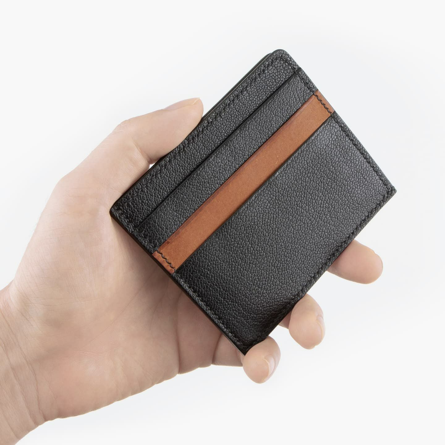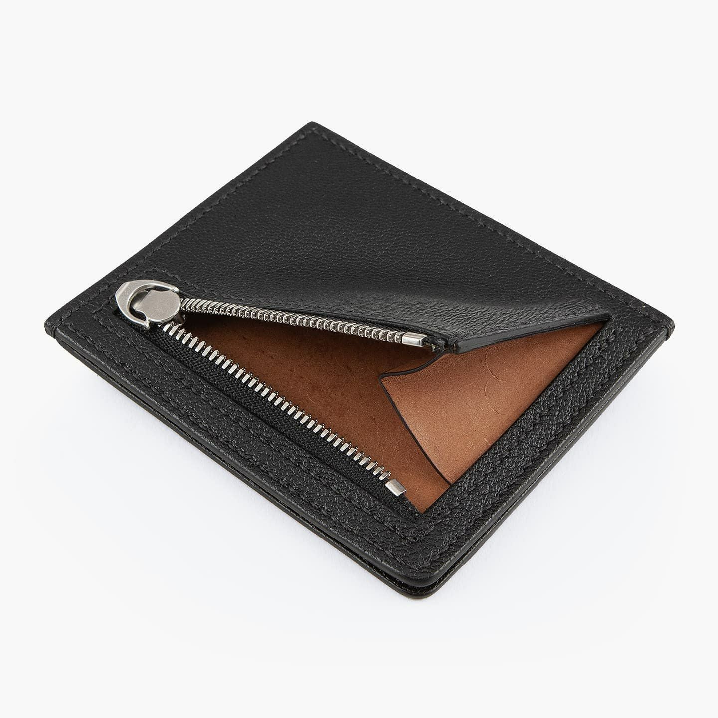 表面のカードポケットには、装飾の「マルゴー」を1段あしらいながら、スリムさを維持するために、カードを3枚収納しても厚くならないように設計。背面の小銭入れは、小さなマチで薄さを保ちながらも、小銭を出し入れしやすくするために最大限に開く仕様。外装の同じカラーで調和しているファスナーテープと、YKKエクセラのシルバーを採用している金具が、細部の美しさを引き立てています。