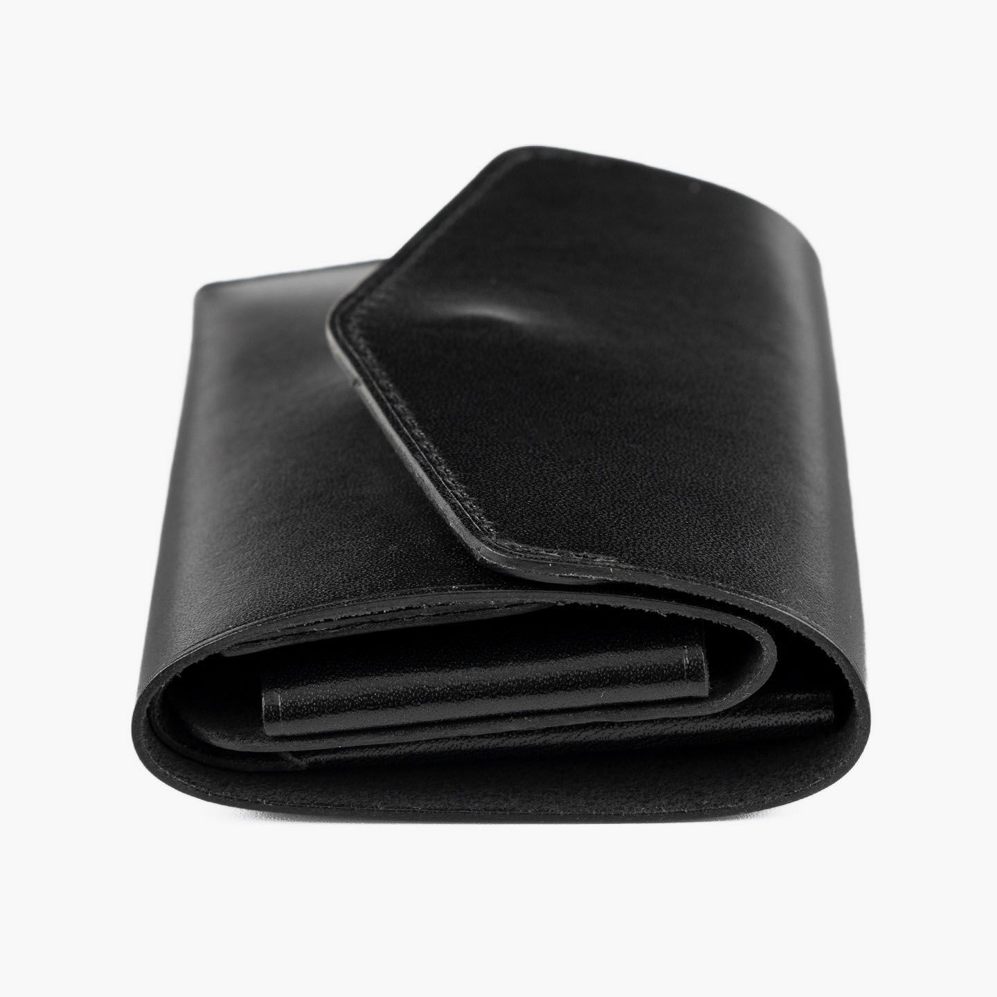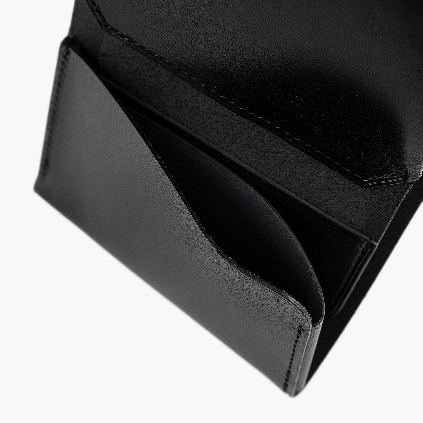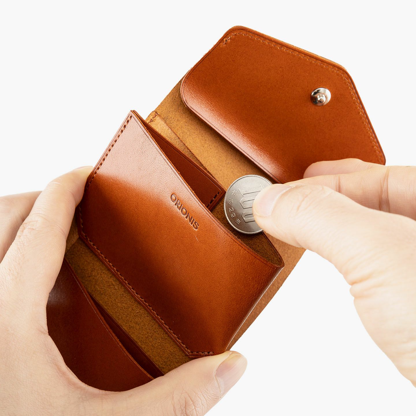 カードくらいのサイズ感ながら、使い込むと10枚ほどまで収納できる大容量カードスペースを備えた、コンパクト3つ折りウォレット。少ない枚数でもタイトに収まるフレキシブルさも特長で、間口が広くて出し入れしやすいコインケースや、紙幣を折らずに収納できる札スペース、カードスペース裏のキーポケットも含め、すべて縦にレイアウトすることで、ミニ財布の向きを変えずに使いこなせるのも魅力。イタリア・M.P.G.社製「イングラサットLUX」のツヤ感を引き立てる、発色の良いBlack/Camelからセレクトでき、内装の革タブに同ブランドのネックストラップ(4種・別売)を装着すれば、ファッションの一部のように演出させてくれる。