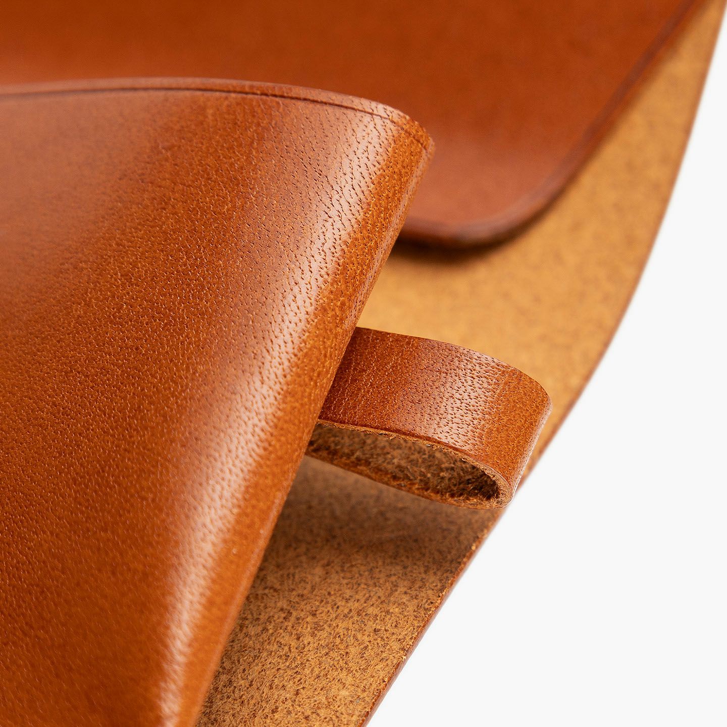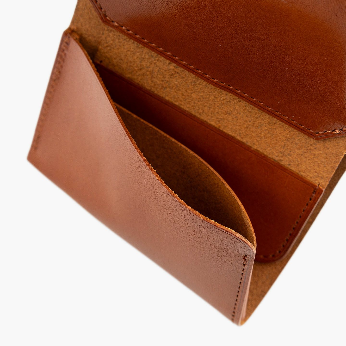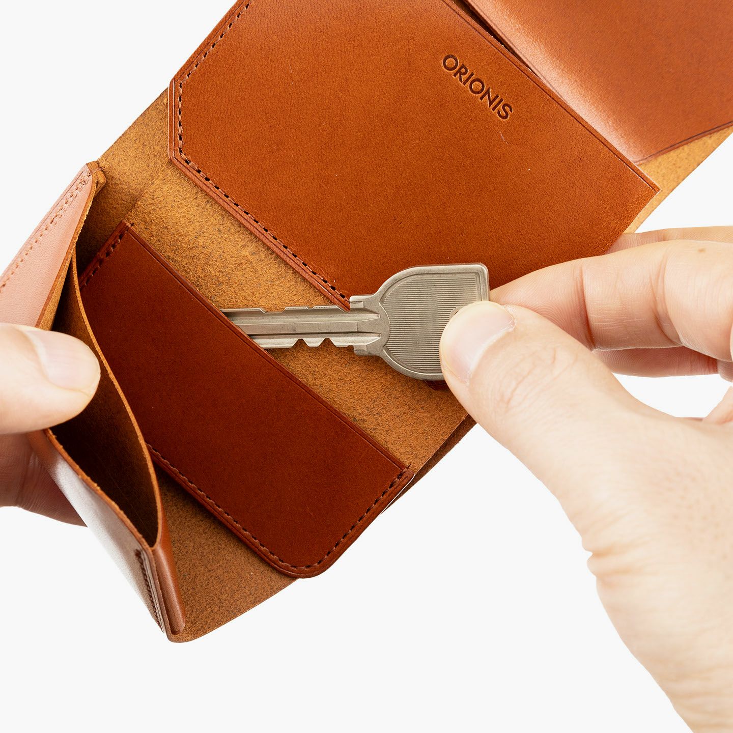 カードくらいのサイズ感ながら、使い込むと10枚ほどまで収納できる大容量カードスペースを備えた、コンパクト3つ折りウォレット。少ない枚数でもタイトに収まるフレキシブルさも特長で、間口が広くて出し入れしやすいコインケースや、紙幣を折らずに収納できる札スペース、カードスペース裏のキーポケットも含め、すべて縦にレイアウトすることで、ミニ財布の向きを変えずに使いこなせるのも魅力。イタリア・M.P.G.社製「イングラサットLUX」のツヤ感を引き立てる、発色の良いBlack/Camelからセレクトでき、内装の革タブに同ブランドのネックストラップ(4種・別売)を装着すれば、ファッションの一部のように演出させてくれる。