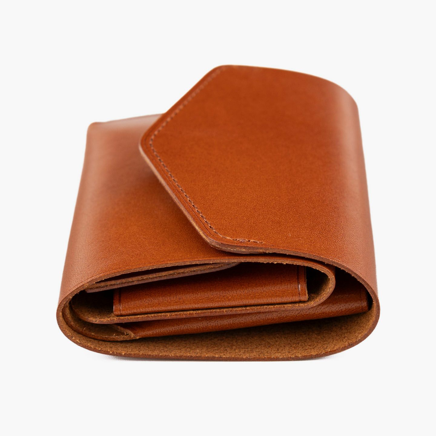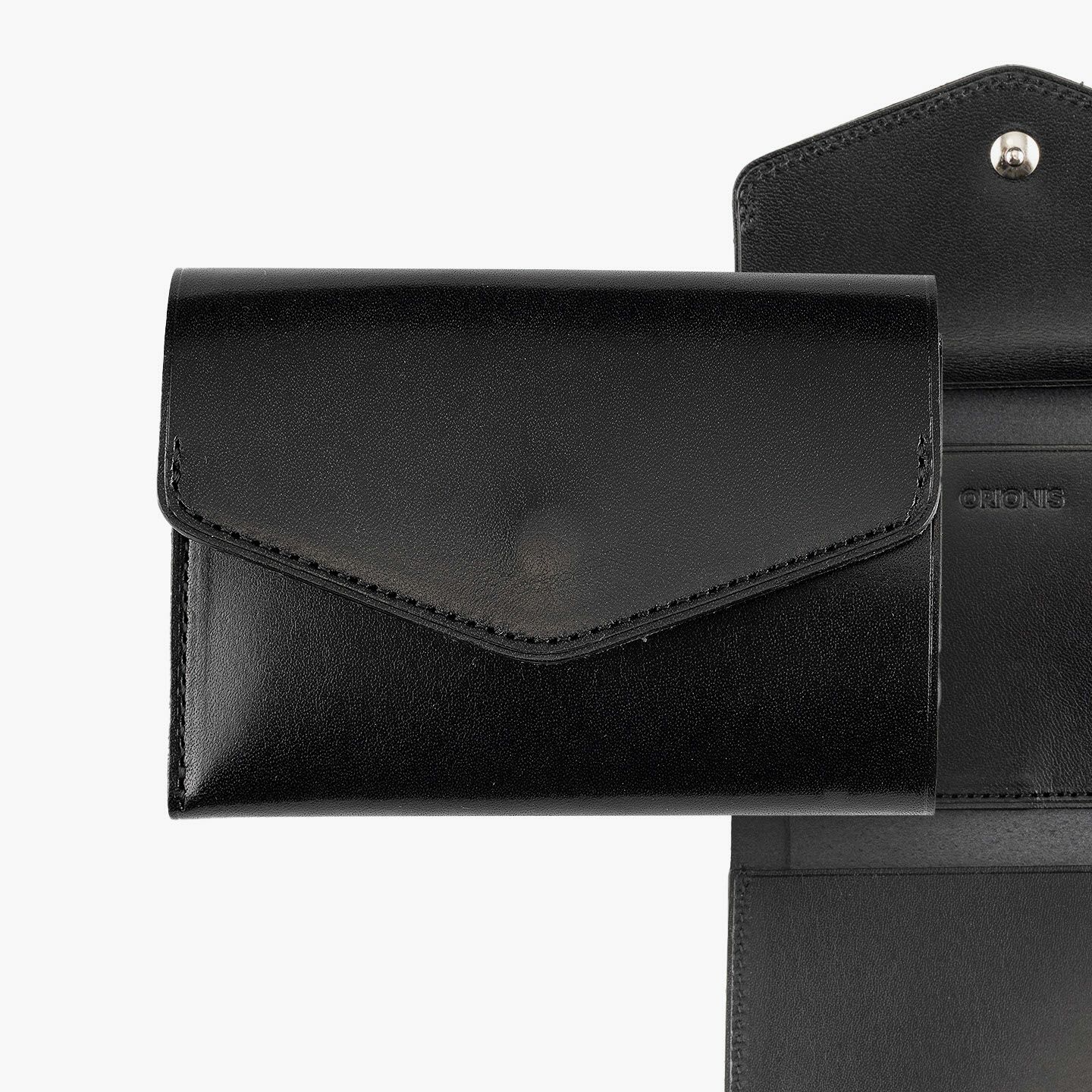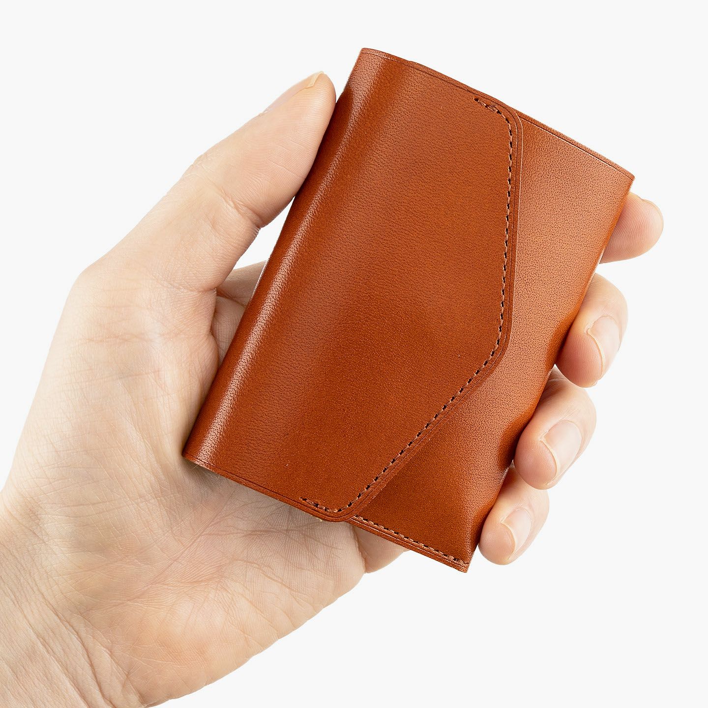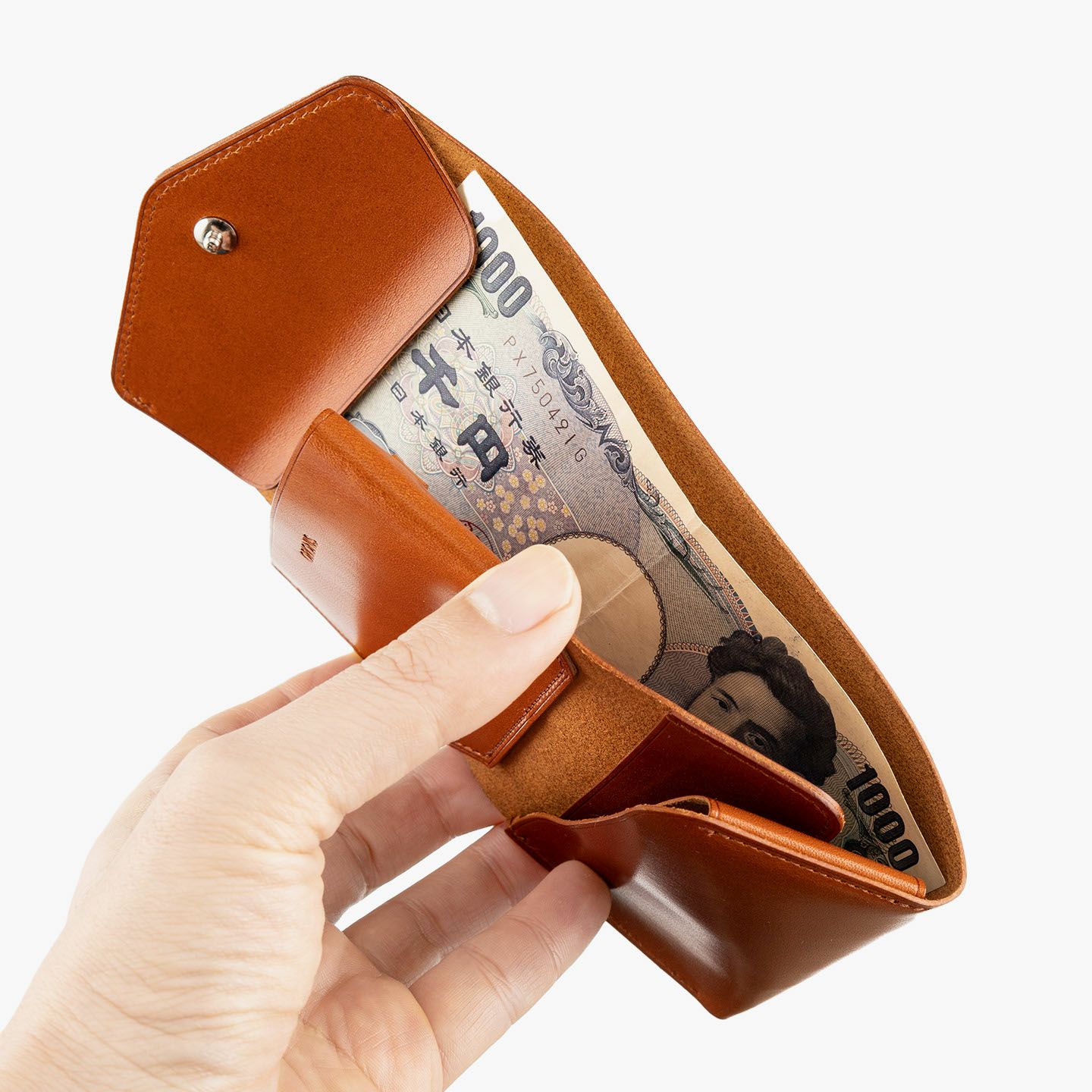 カードくらいのサイズ感ながら、使い込むと10枚ほどまで収納できる大容量カードスペースを備えた、コンパクト3つ折りウォレット。少ない枚数でもタイトに収まるフレキシブルさも特長で、間口が広くて出し入れしやすいコインケースや、紙幣を折らずに収納できる札スペース、カードスペース裏のキーポケットも含め、すべて縦にレイアウトすることで、ミニ財布の向きを変えずに使いこなせるのも魅力。イタリア・M.P.G.社製「イングラサットLUX」のツヤ感を引き立てる、発色の良いBlack/Camelからセレクトでき、内装の革タブに同ブランドのネックストラップ(4種・別売)を装着すれば、ファッションの一部のように演出させてくれる。