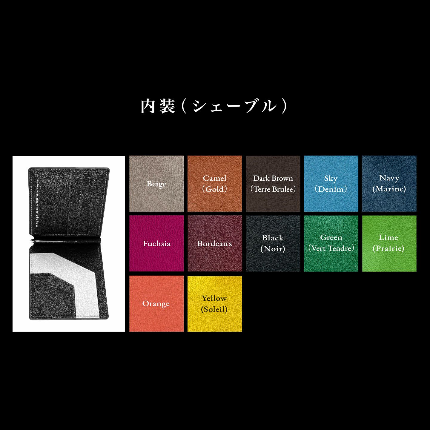 フランス・アスラン社製の「シェーブル」を外装と内装に採用し、鮮やかな8色からそれぞれ選ぶことが可能。また、内装右サイドのマルチポケットを、装飾として外装カラーにしているカラーリングで、遊び心あふれるアクセントを楽しめます。金具は、Silver・Goldのいずれからセレクトすることができ、小銭入れ付きを選んだ際のファスナーや内装左サイドのロゴも同じカラーで統一。さらに、糸色・コバ色・ファスナーテープカラー色(小銭入れ付きの場合)は、外装・内装いずれかの同系色を選択してオーダーできます。
