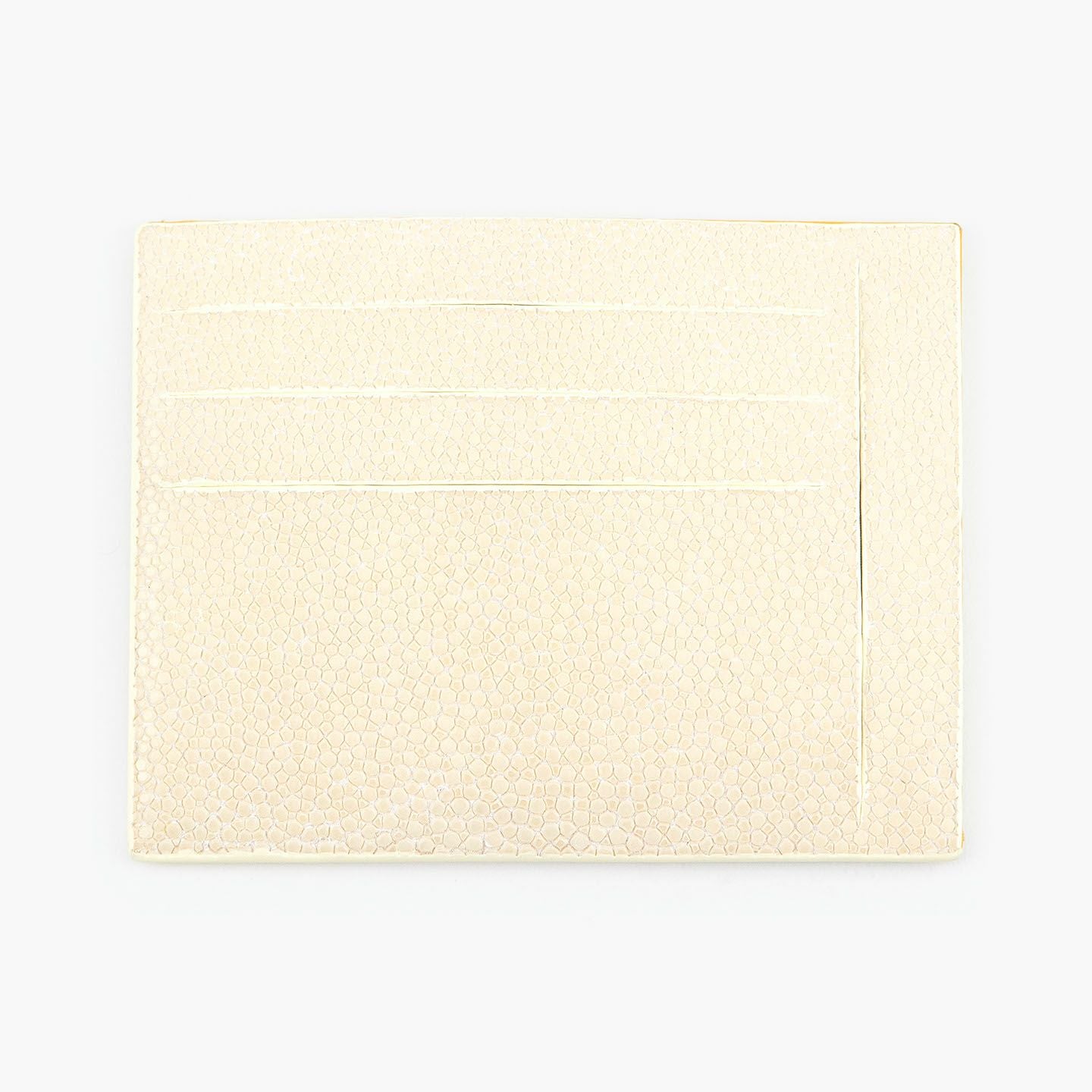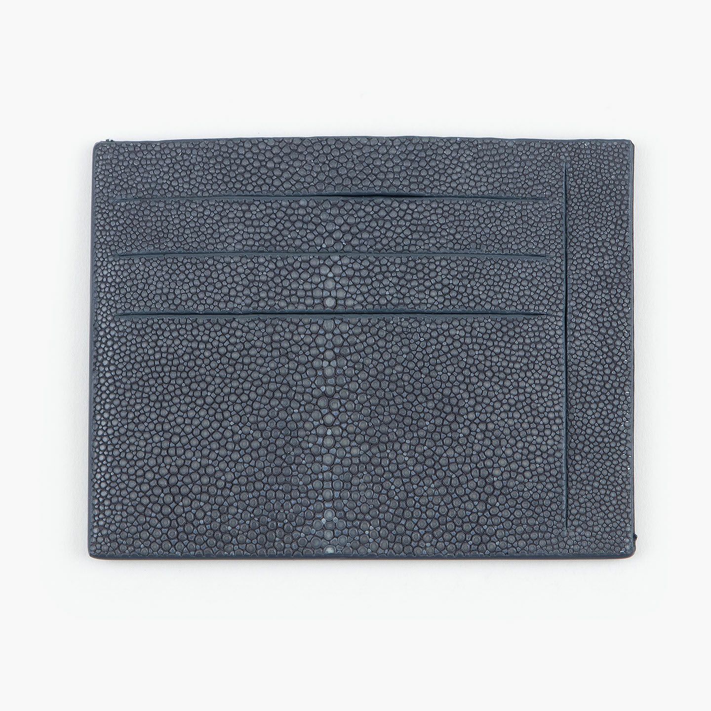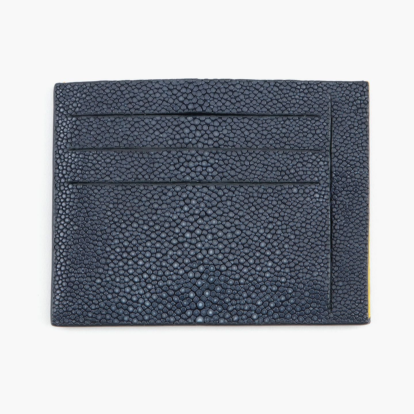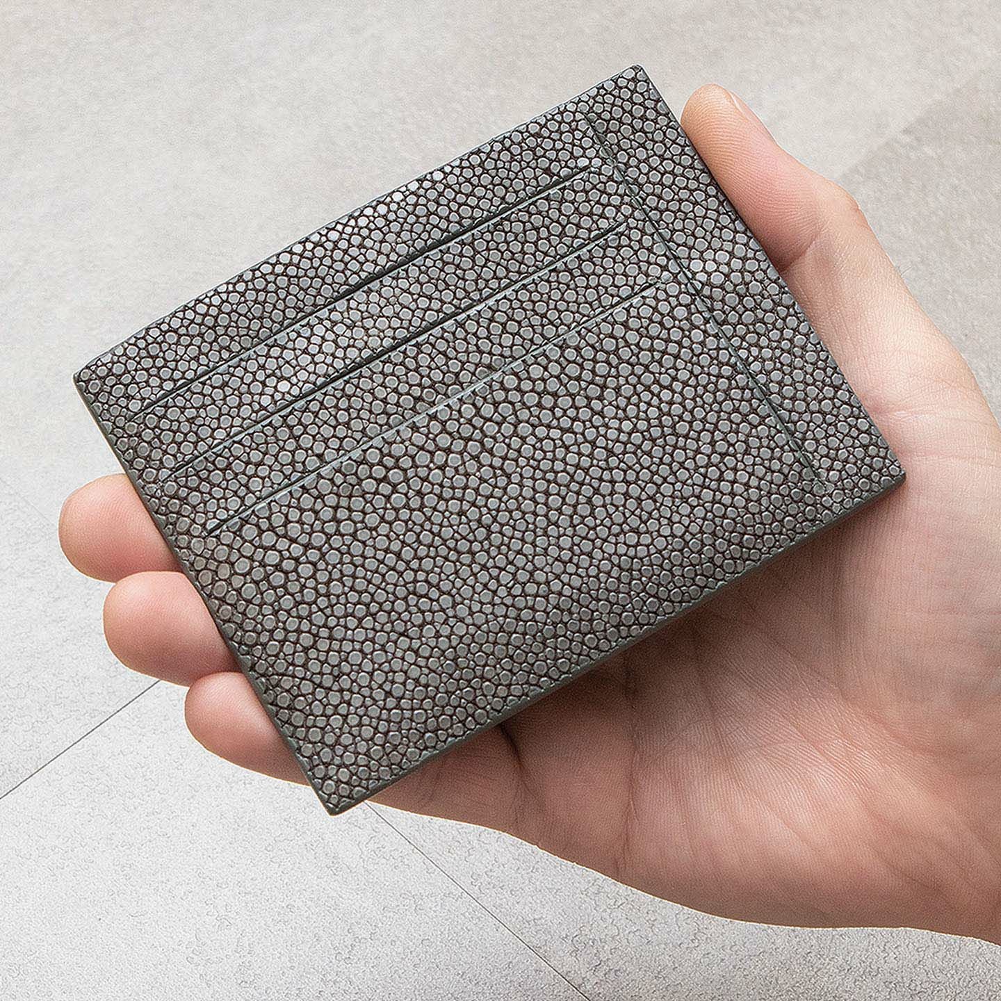 コンセプトに“Cuirs D'ailleurs 〜旅するレザー〜”を掲げ、他の人たちとは違った美学によるクールで洒落た人生の旅へと誘う、ブランド『Atelier AKNAS』のスリット札ばさみ。美しく覆っているガラスビーズを散りばめたような小さな鱗と、地中海の潮風を指先で感じるような冷んやりとした感触が魅力的な「ガルーシャ」を、外装として纏わせ贅沢感を演出。その両サイドに、無縫製の切り込みでフラットに仕立てたカードポケット各3つ(計6つ)・スリット式フリーポケット各1つ(計2つ)を備え、二つ折りの紙幣を簡単に差し込んで10枚ほど収納できる札入れとともに、金具を排したスリム&スマートな使用感をもたらしてくれる。