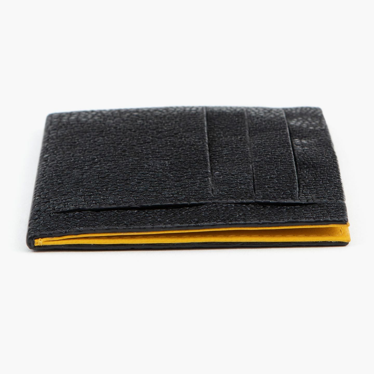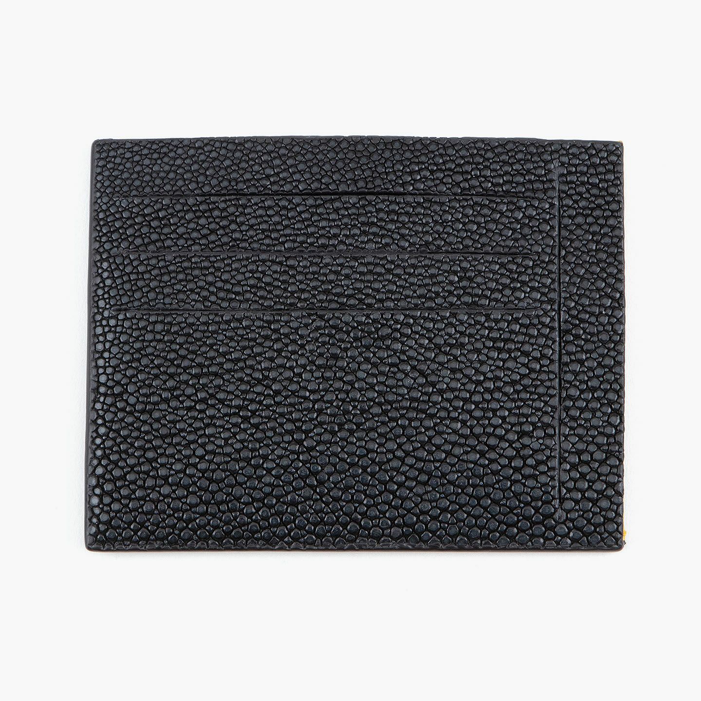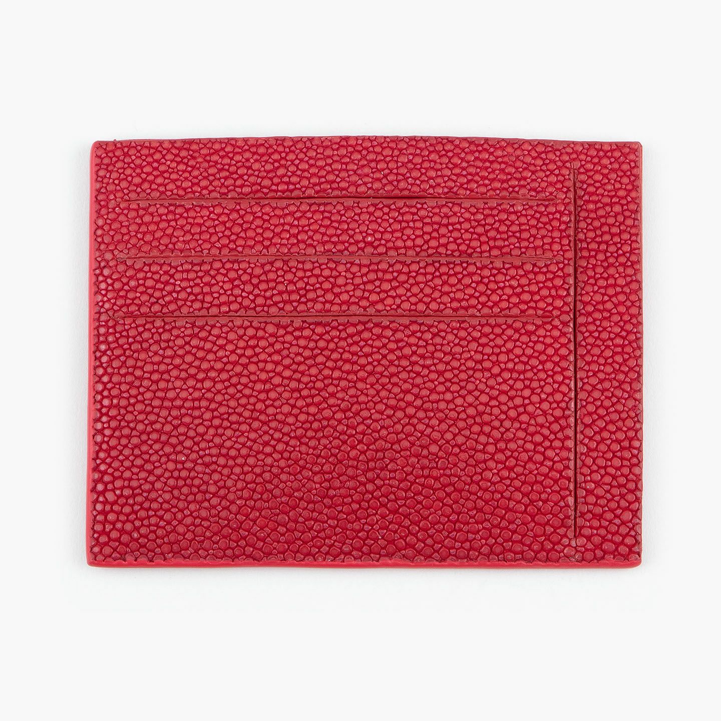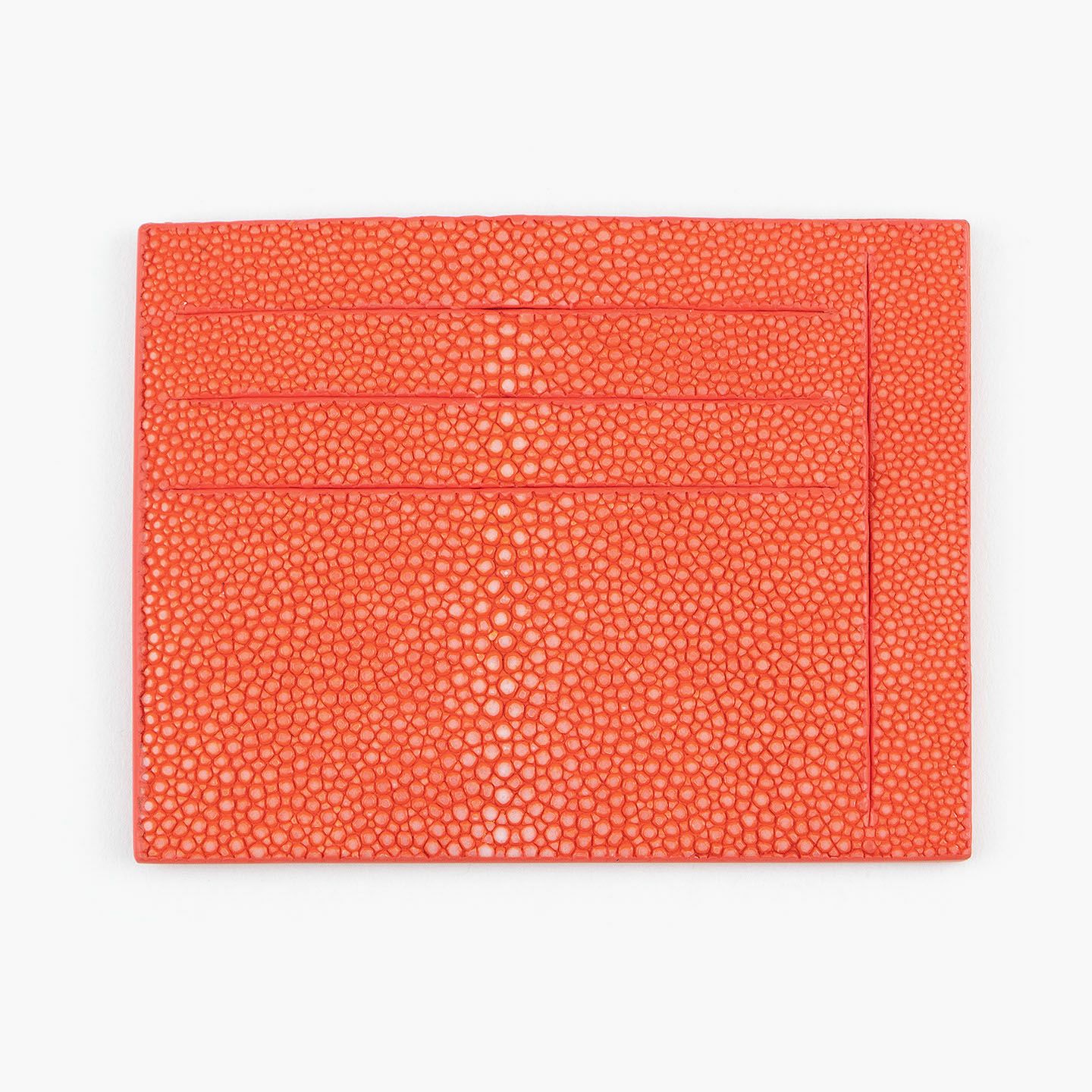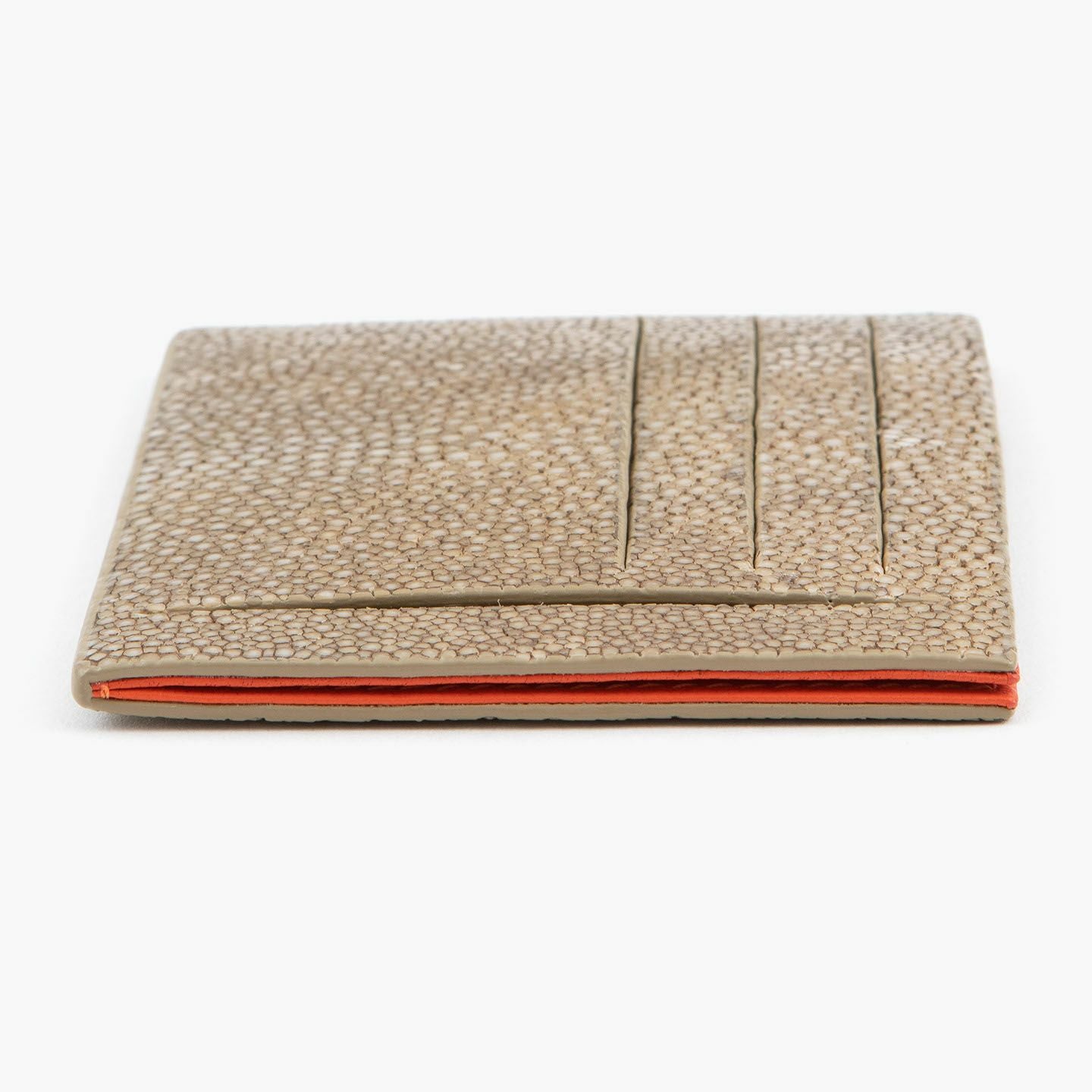 コンセプトに“Cuirs D'ailleurs 〜旅するレザー〜”を掲げ、他の人たちとは違った美学によるクールで洒落た人生の旅へと誘う、ブランド『Atelier AKNAS』のスリット札ばさみ。美しく覆っているガラスビーズを散りばめたような小さな鱗と、地中海の潮風を指先で感じるような冷んやりとした感触が魅力的な「ガルーシャ」を、外装として纏わせ贅沢感を演出。その両サイドに、無縫製の切り込みでフラットに仕立てたカードポケット各3つ(計6つ)・スリット式フリーポケット各1つ(計2つ)を備え、二つ折りの紙幣を簡単に差し込んで10枚ほど収納できる札入れとともに、金具を排したスリム&スマートな使用感をもたらしてくれる。