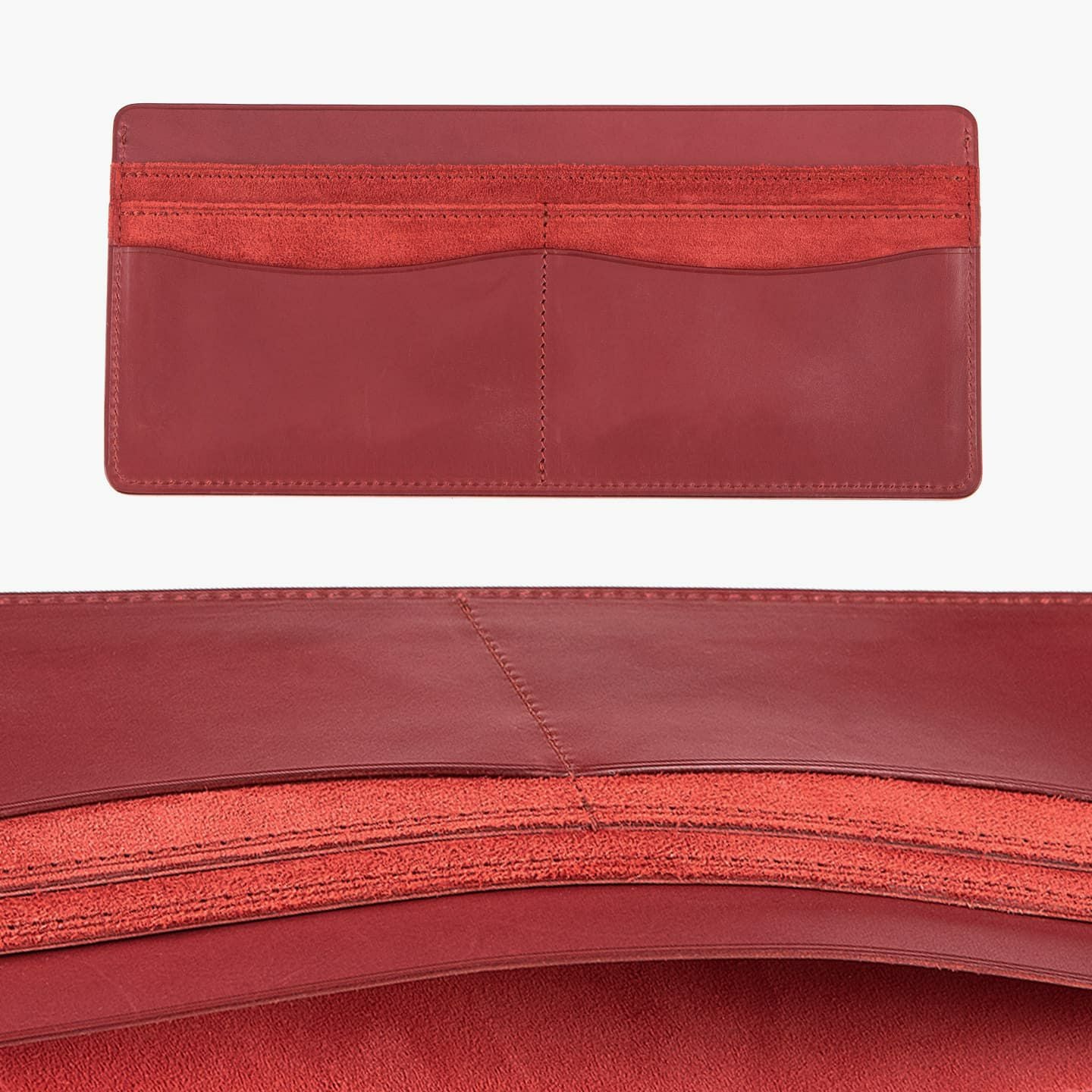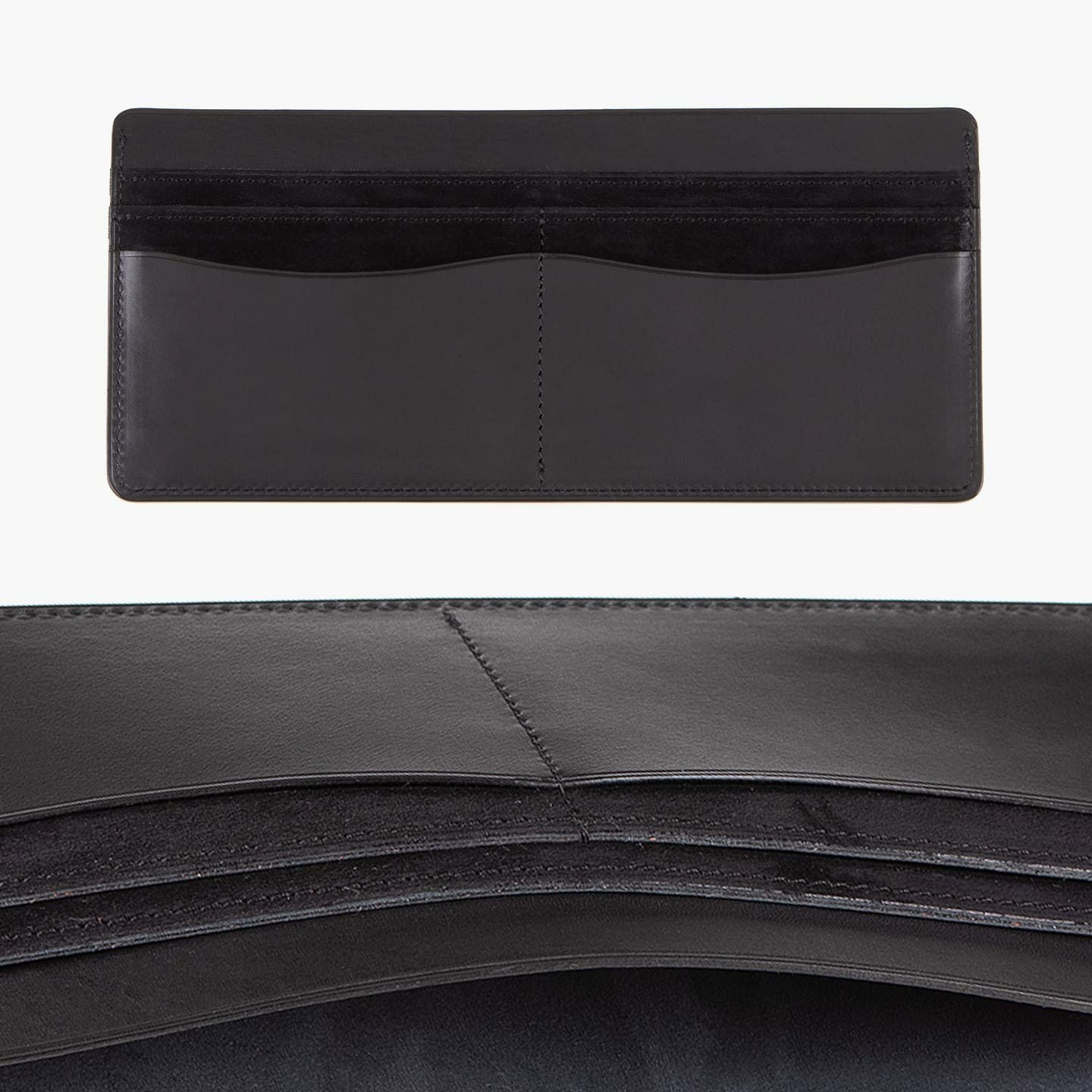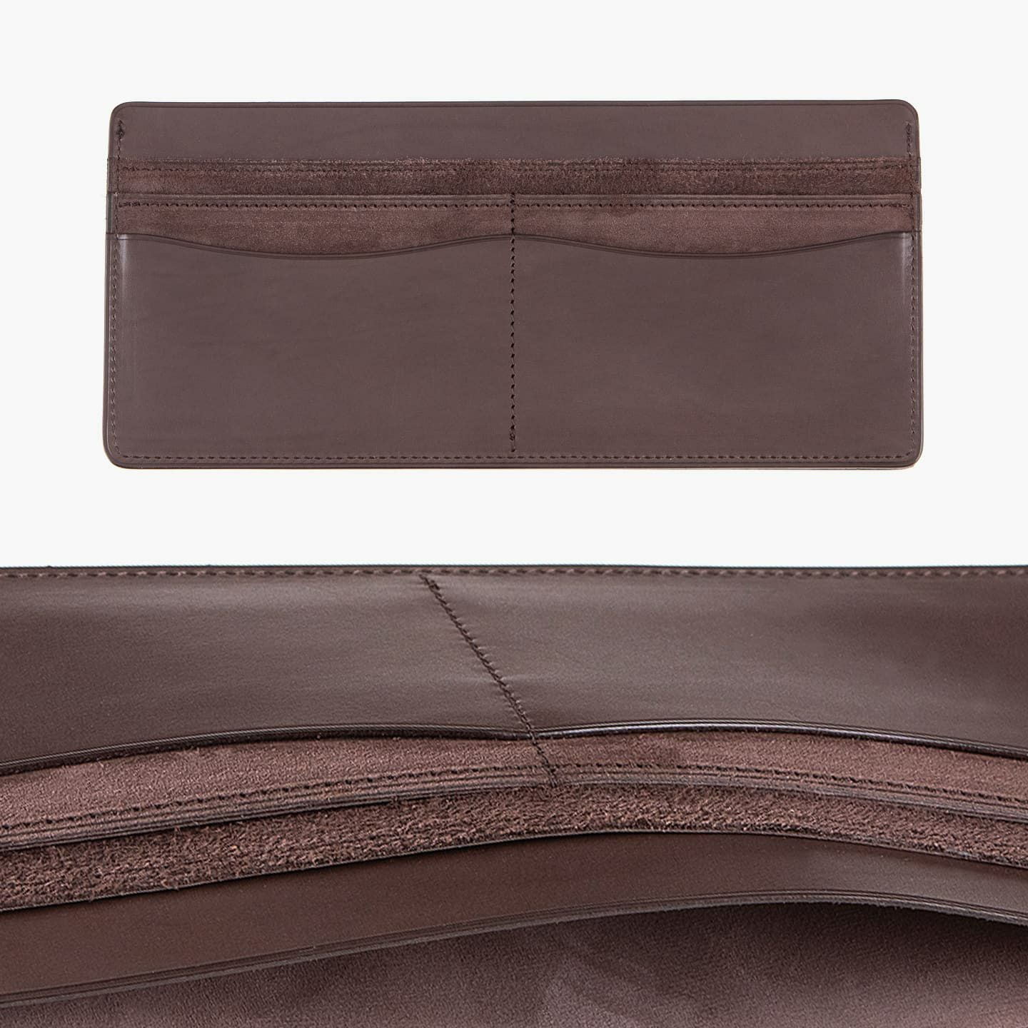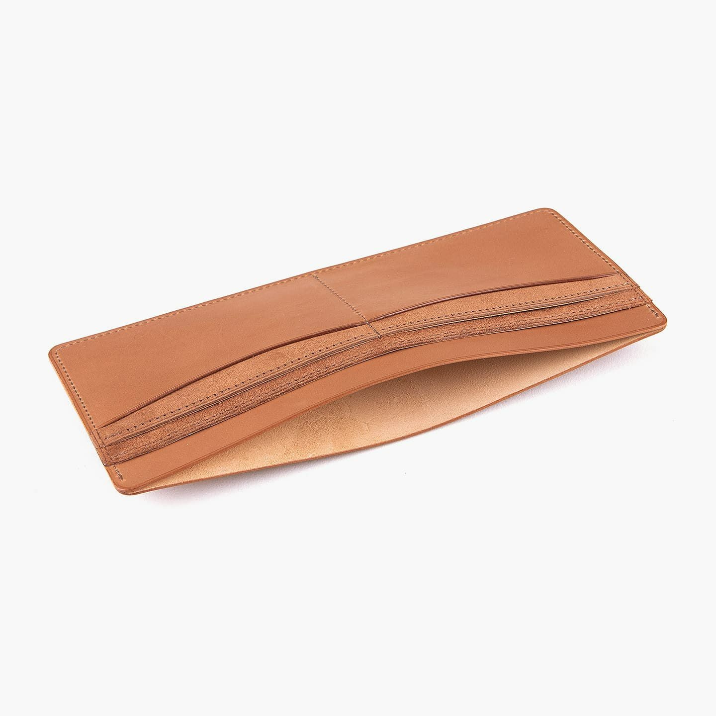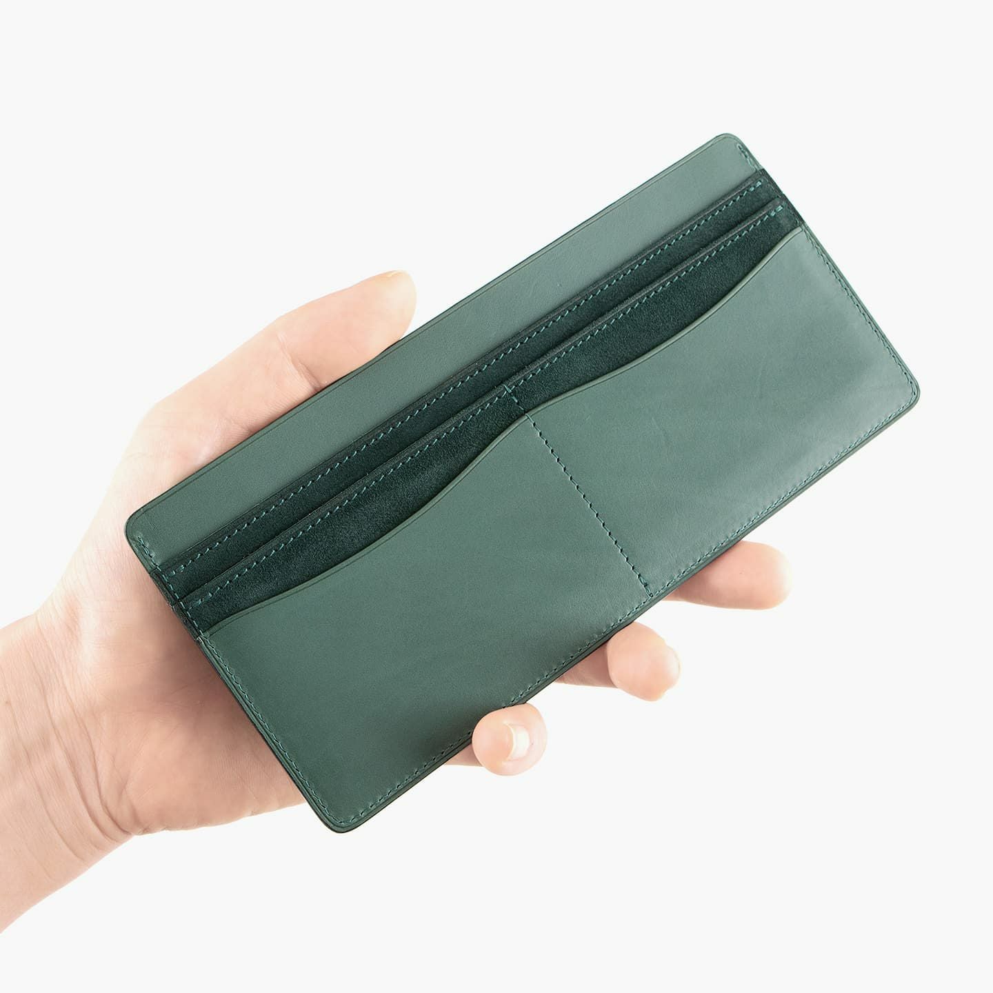 「ベビーカーフ」の滑らかな質感・しなりが感じられるように、不要な縫製を施さずに札入れ・カードポケットを実現。一般的な長財布が備えているカブセがなくても、安心して手軽に使える利便性を追求しています。カードの使用を前提に、指通りの良いカットラインにするなど、使いやすさとデザイン性を兼ね備えたシンプルな設計。また、札入れポケットには、紙幣だけでなくレシート・領収書なども収納できます。