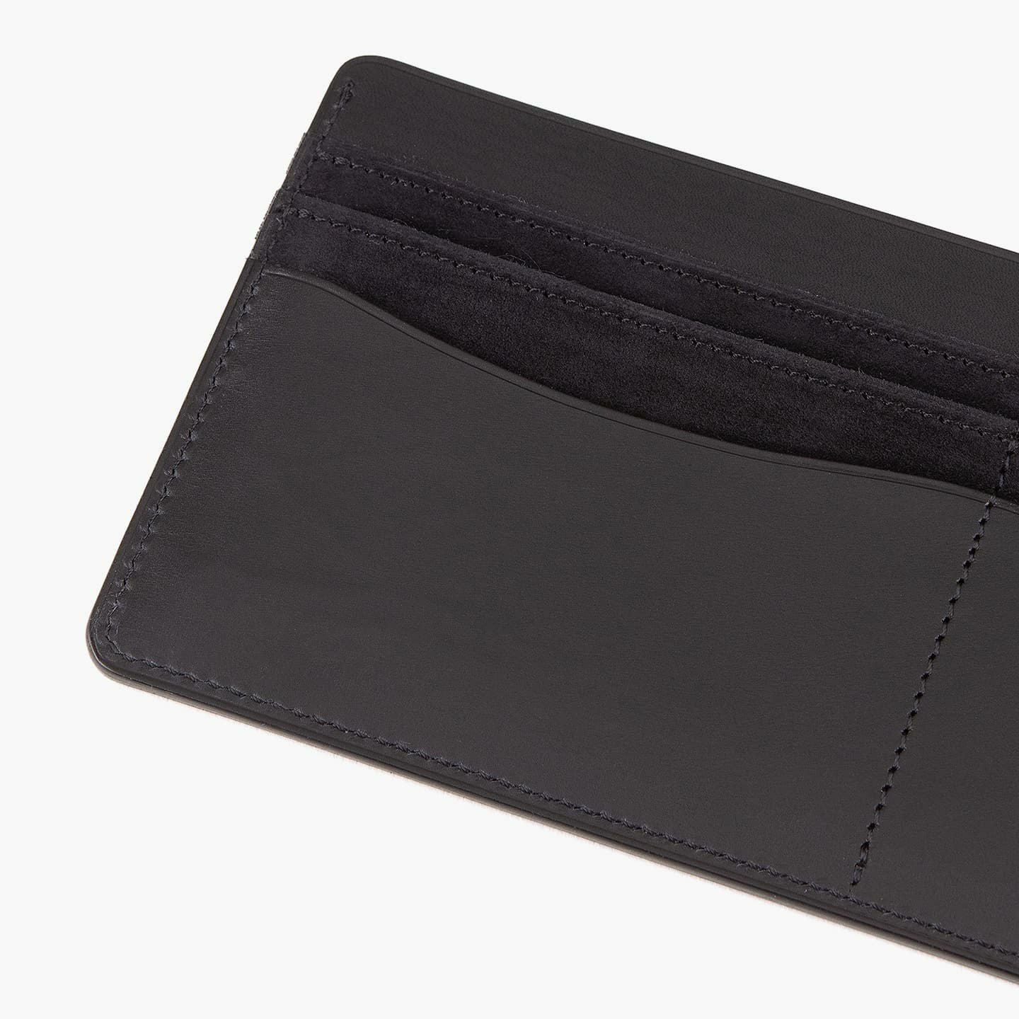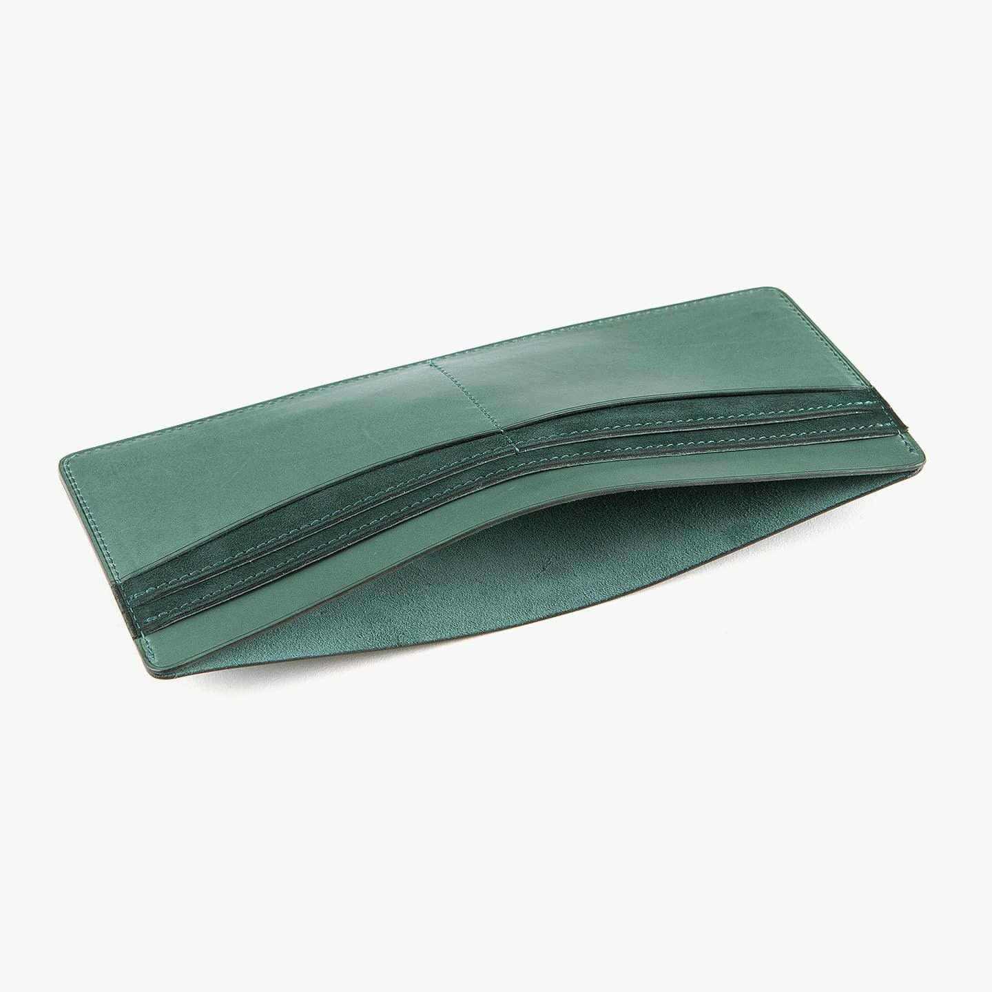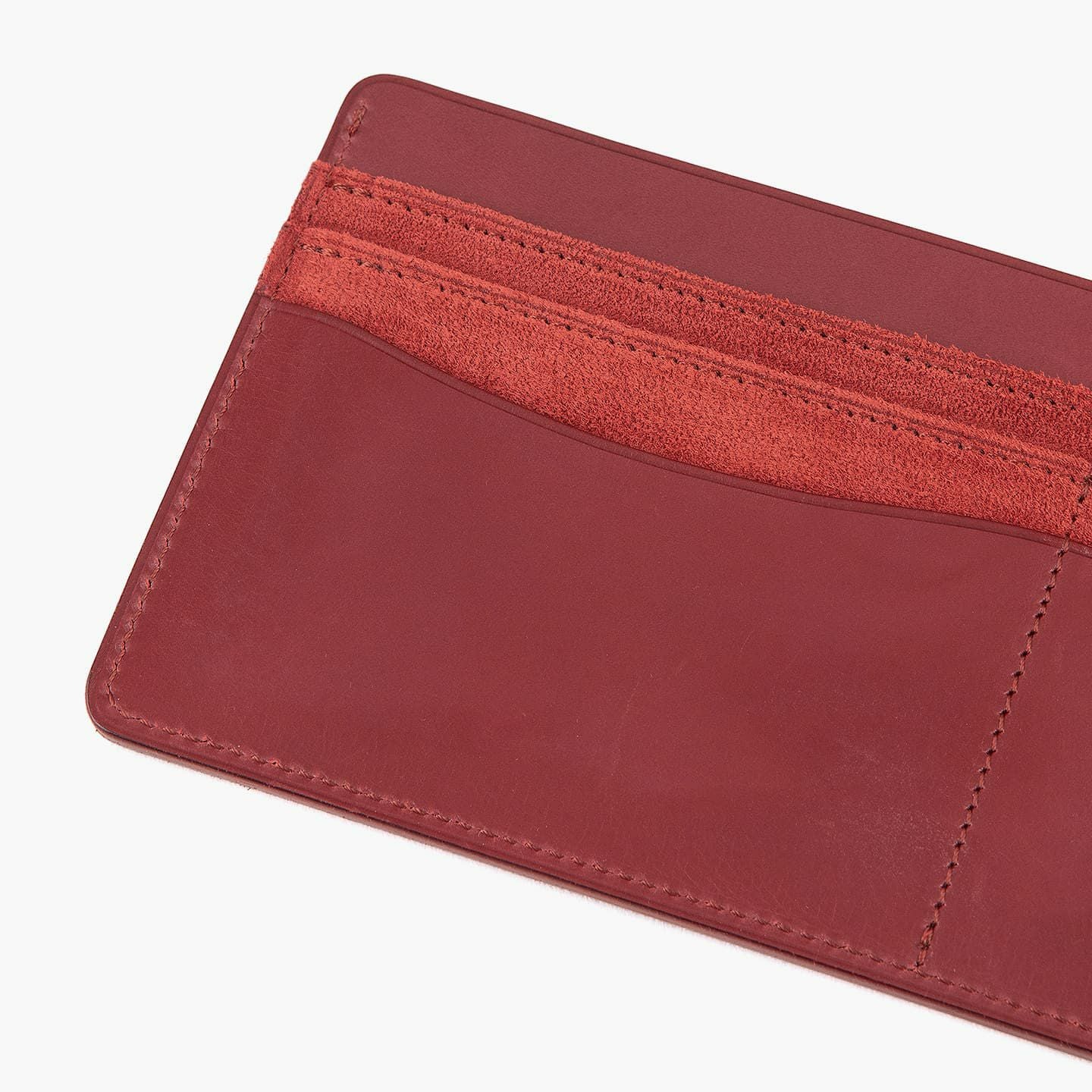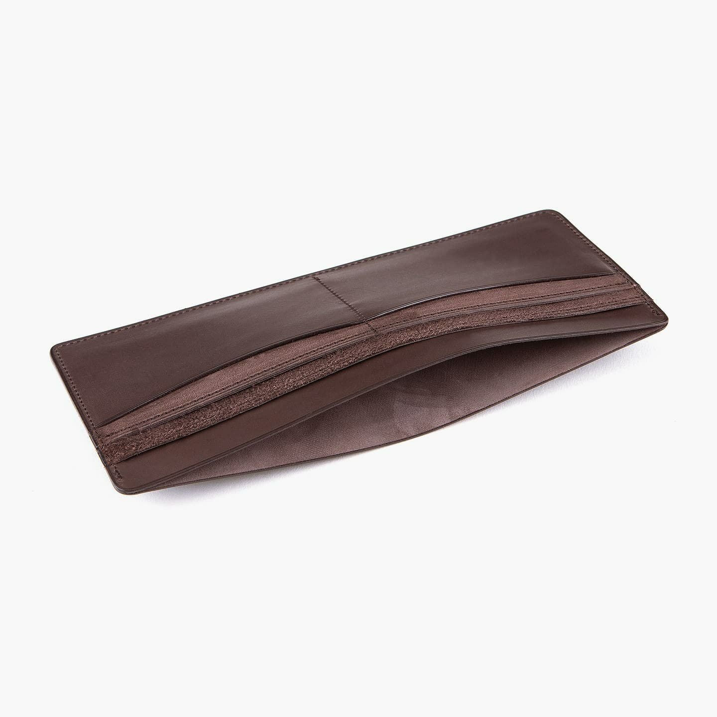 縫製で厚くしない工夫から、裏地も用いずに「ベビーカーフ」の床面を効果的に活用。ツヤのある銀面とスエード調の床面は、色彩に立体感を与えるデザイン性とともに、カードや紙幣などが滑り落ちにくい実用性も兼ね備えています。