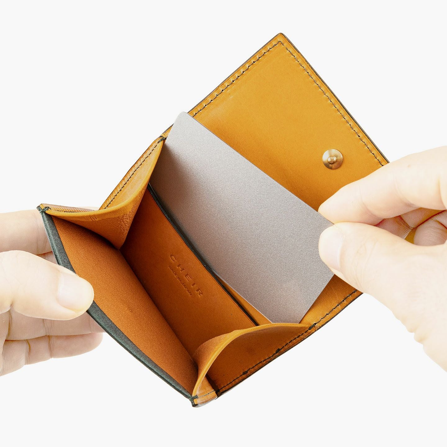 手から手へと製品を届ける革職人・野村健吾が、心から心へと繋がる愛情を育んでもらうために、OEMやオーダーメイドで培ってきた技術を注ぎ込んでいるブランド『CHEIR』のスリムコインケース。シンプルなデザインだからこそ、使い込むほどに深みのある色合いになっていき、ツヤのある美しい宝石のような光沢へと経年変化していく「ロロマ」の素材感を存分に堪能。広いマチで小銭が見やすく出し入れしやすいだけでなく、カード・紙幣(三つ折り)収納などの自由な使い方ができるミニマルなマルチウォレットとしても利用でき、交通系ICカード収納に便利な背面カードポケットなど、自分好みの使い勝手で活躍してくれる。