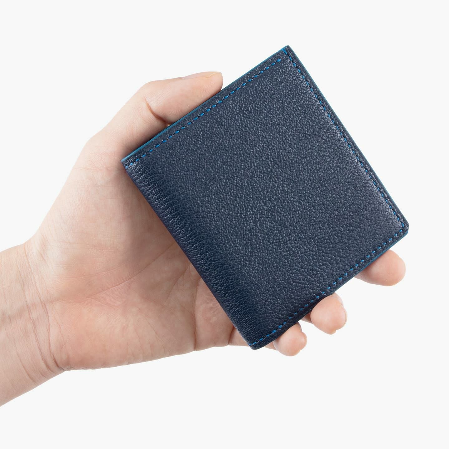 外装と内装に採用しているフランス・アスラン社製の「シェーブル」は、鮮やかな8カラーからそれぞれセレクトして、単色で統一することも別々のバイカラーにすることも可能。内装の左右カード段の裏面(札入れ側)は、外装のカラーを装飾として使用しているので、異なるカラーを選べば楽しさがより広がります。また、糸・コバ色は、外装・内装いずれかの同系色を選択してオーダー。さらに、シンプルさを追求するために、内装の左端にさりげなくロゴの素押しを施すなど、細部にもこだわっています。