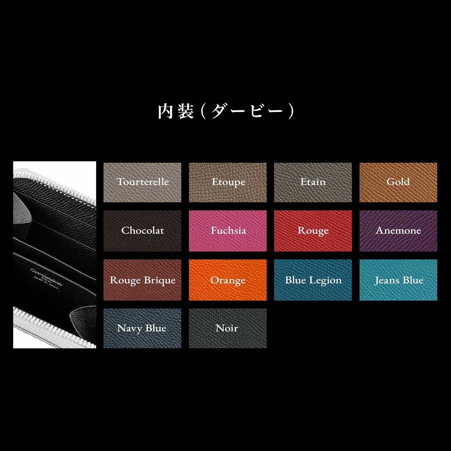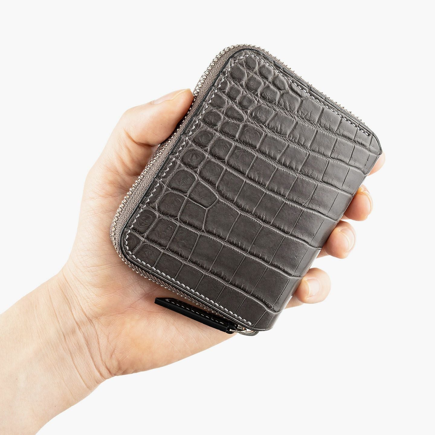 シンメトリーデザインの内装は、コインポケットをセンターにして、左右1つずつ(計2つ)の札スペース(二つ折り紙幣)、左右2つずつ(計4つ)のカードポケットを備えた、オールインワンの設計。外装の「ナイルクロコダイル」は6色から、内装の「ダービー」は豊富な16色からセレクトでき、自分仕様のような色の組み合わせでの受注生産ができます。また、総手縫いによる緻密なステッチの糸色、手間暇をかけている高品質なコバの色、ファスナーテープの色は、セレクトした革色に合うカラーをブランドが選択。さらに、ファスナーは、Silver・Goldのいずれかから選ぶことができ、ブランドロゴの箔押しも同じカラーで統一させています。