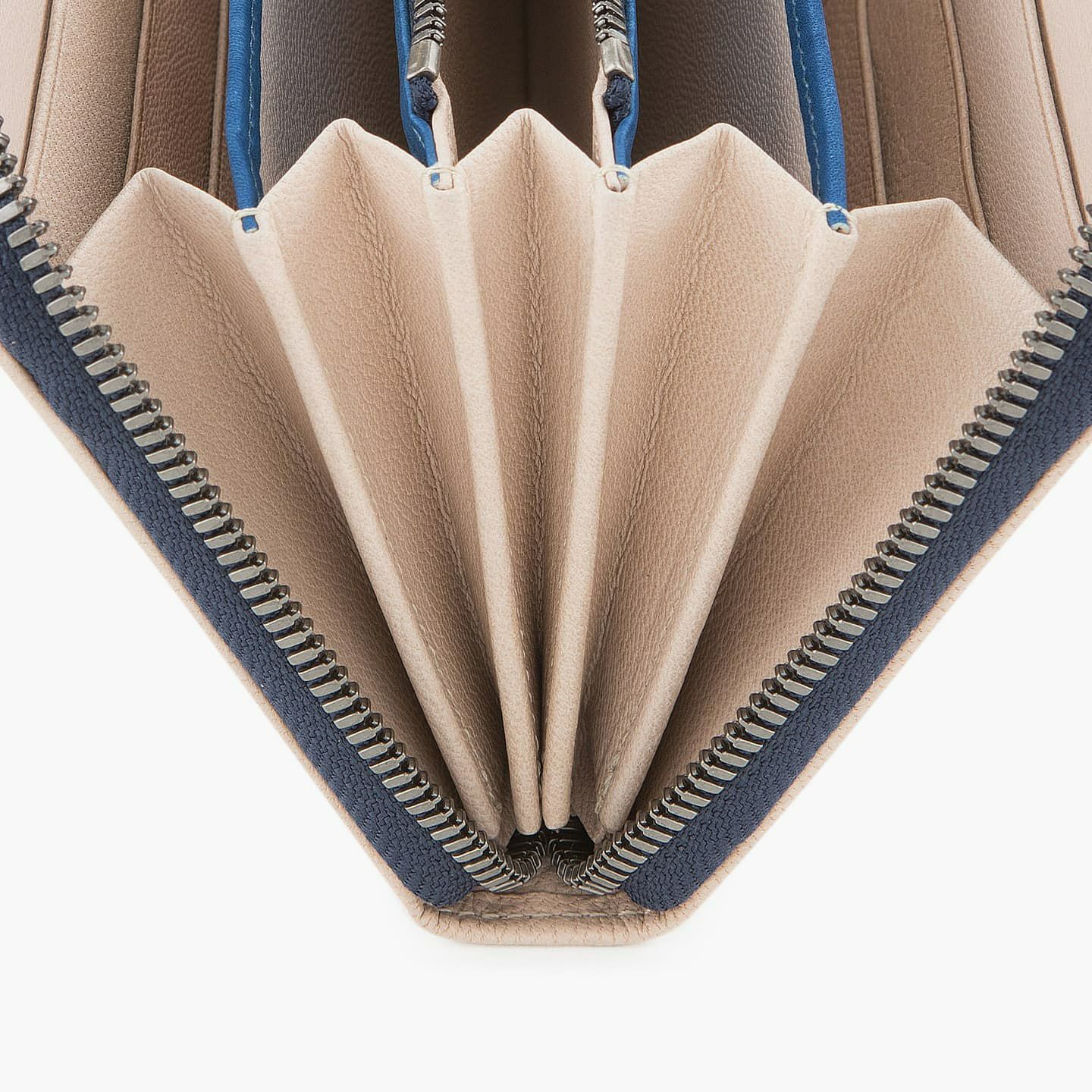 財布の内外ともに素材感があり、デザインの統一性も重視するため、あえてヌバックゴート革の銀面ではない裏面を使用。エイジングにより、手の脂などが染み込み、使うごとに自然なツヤが楽しめます。山羊革自体は、個性的な凹凸をしたシボと、独特な毛穴の形状が特長。薄くても丈夫で、型崩れしにくい特性があるため、高級レザー手袋やブランドのレザーシューズに使われることが多い素材です。また、しなやかで耐久性にも優れているので、身に付けるものやジャケットなどにも多く利用。アメリカ空軍がA-10フライトフローブ、アメリカ海軍がフライトジャケット(M-422)に使っていたことでも知られています。