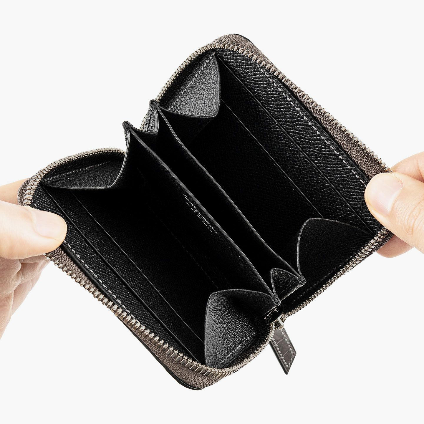 シンメトリーデザインの内装は、コインポケットをセンターにして、左右1つずつ(計2つ)の札スペース(二つ折り紙幣)、左右2つずつ(計4つ)のカードポケットを備えた、オールインワンの設計。外装の「ナイルクロコダイル」は6色から、内装の「ダービー」は豊富な16色からセレクトでき、自分仕様のような色の組み合わせでの受注生産ができます。また、総手縫いによる緻密なステッチの糸色、手間暇をかけている高品質なコバの色、ファスナーテープの色は、セレクトした革色に合うカラーをブランドが選択。さらに、ファスナーは、Silver・Goldのいずれかから選ぶことができ、ブランドロゴの箔押しも同じカラーで統一させています。
