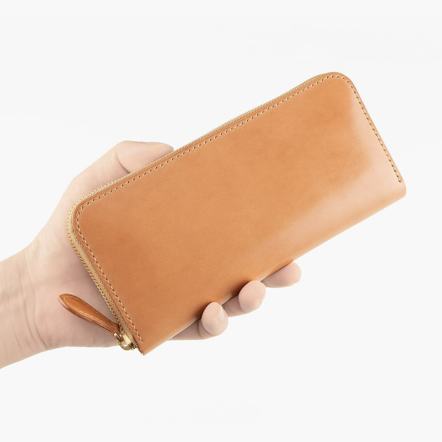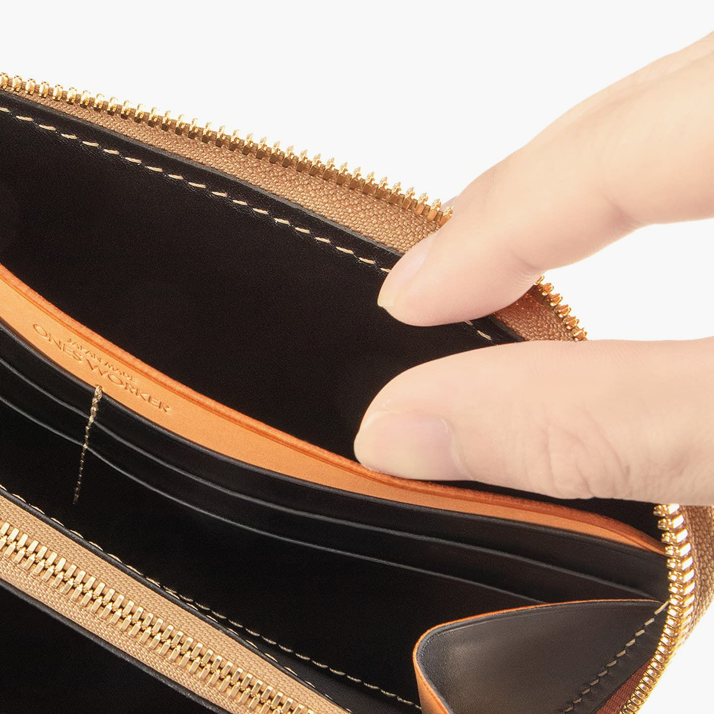 外装には、新喜皮革の最上級ライン「オイルグレージングコードバン」を採用。丁寧な手縫いで外装を仕立て、不要な装飾を削ぎ落としたシンプルなデザインにすることで、素材の質感がさらに際立っています。外装ファスナーにはYKKエクセラのダブルを採用しながら、コーナー部分のファスナーテープを大きめに貼る独自設計にすることで、よりスムーズな開閉を実現。さらに、丸みがある剣先タイプのオリジナルファスナートップが、上質な雰囲気を演出するとともに、肉盛りの芯材に「ケプラ」を用いることで耐久性も兼ね備えています。