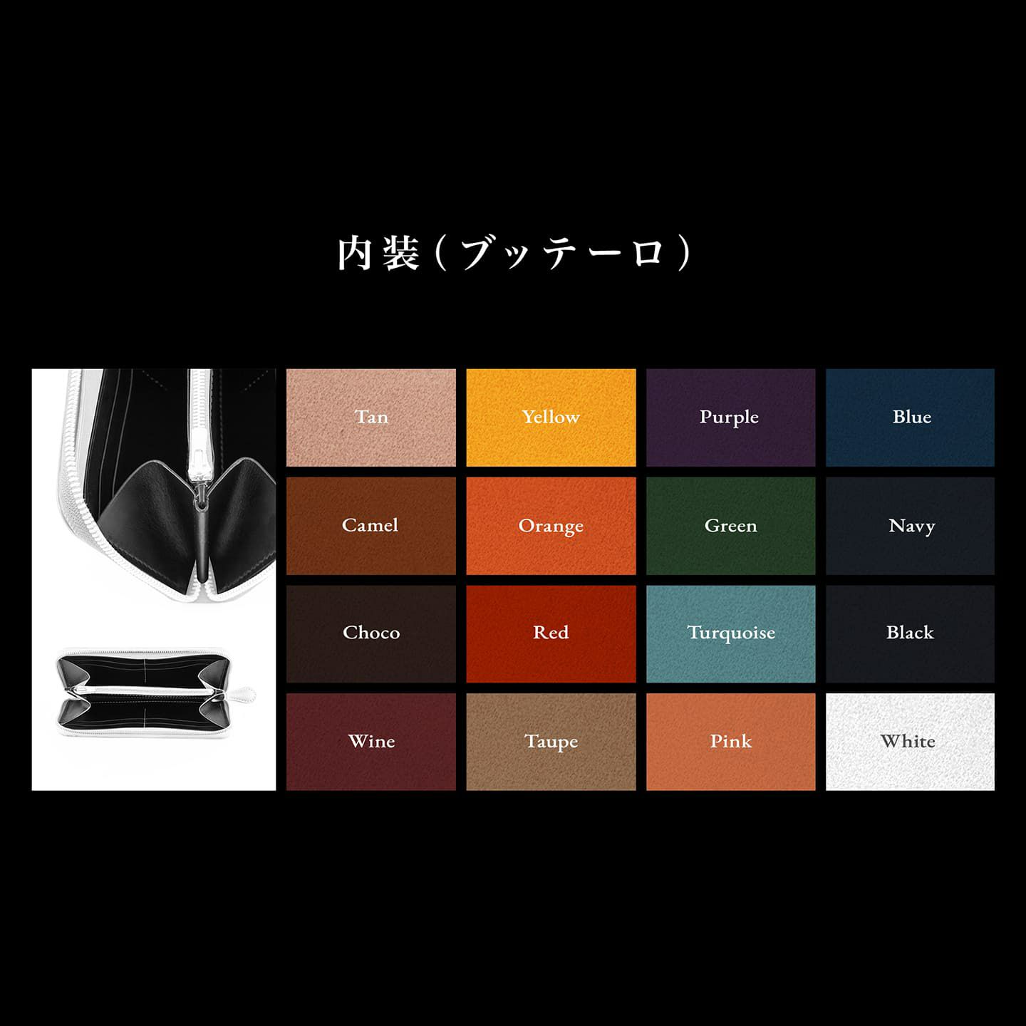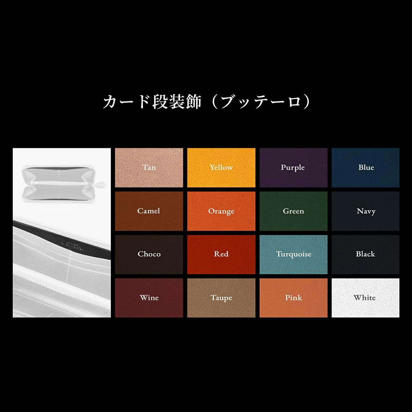外装の「オイルグレージングコードバン」は、5色からセレクトすることが可能。内装とカード段装飾に使われている「ブッテーロ」は、16色から各カラーを選んで内装全体をバイカラーにできるとともに、ファスナー金具は3色、ファスナーテープは18色からカラーオーダーできるので、自分好みの色合いを自由に組み合わせたオリジナルのカラーリングでカラーオーダーできます。