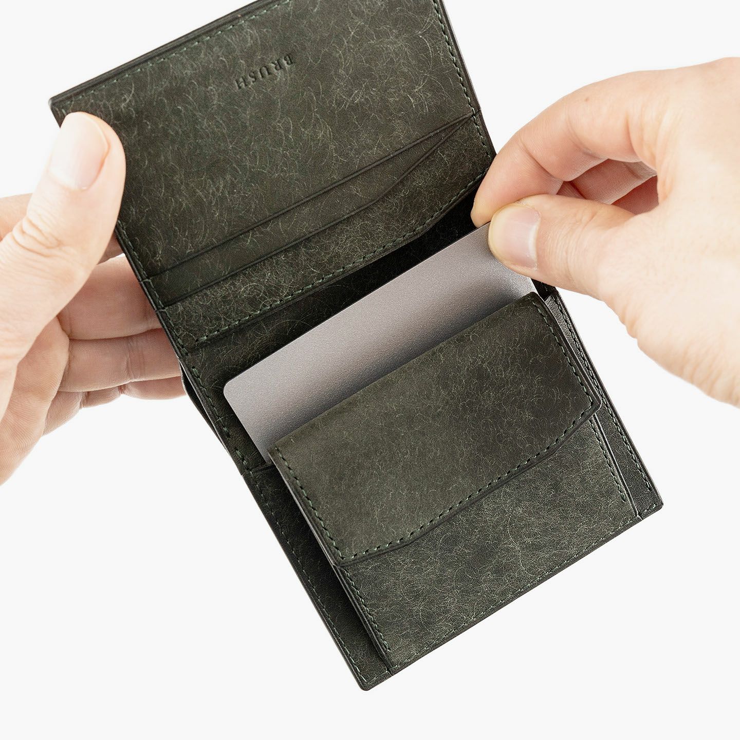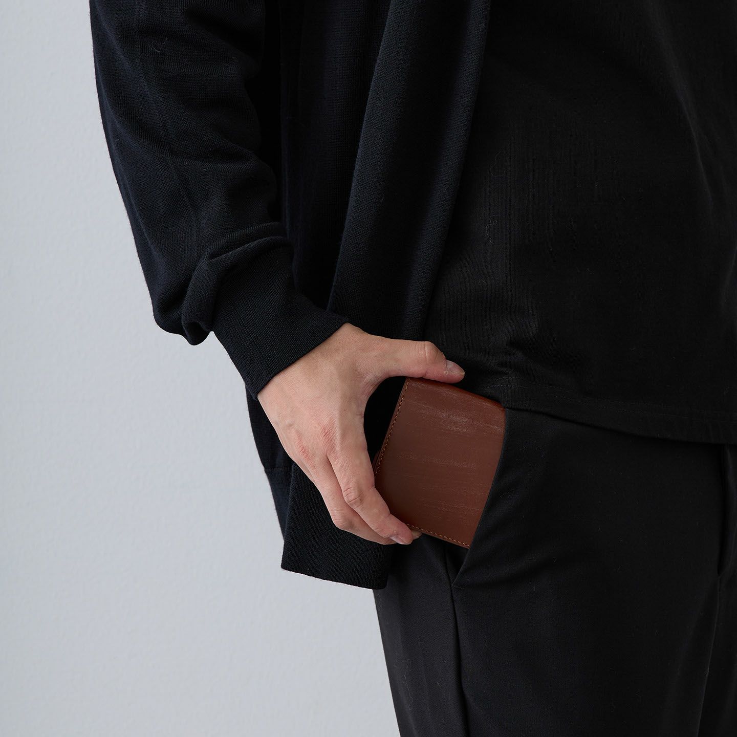 革製品の修理に携わっていた革職人・長谷川青矢が、自分でも使いたくなるような上質な革製品が欲しいという想いから立ち上げた、ブランド『BRUSH』のミニウォレット。紙幣を折らずに収納できる、ムダのないミニマム設計を追求した、一般的な二つ折り財布よりもコンパクトなサイズ感が魅力。外装は、強度・耐久性・撥水性を兼ね備えた堅牢な「ブライドル」を採用し、内装は、和紙のような風合いが味わい深い「マルゴー」、もしくは外装と同じ「ブライドル」からセレクト可能。さらに、裏地までレザーのみで仕立てた贅沢なフルレザー仕様で、丈夫で長く使える愛着感も。経年変化の楽しさとともに、相棒感も深めてくれる。