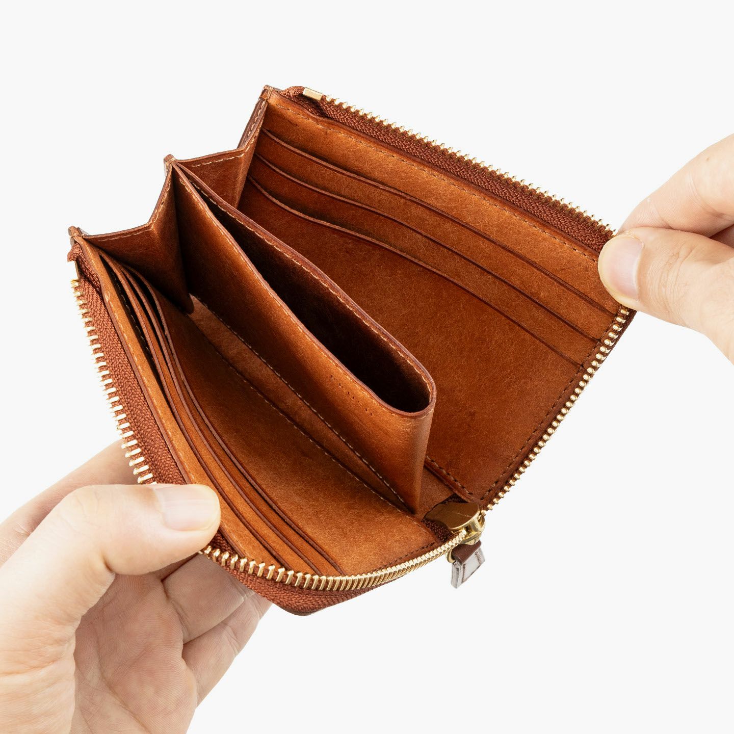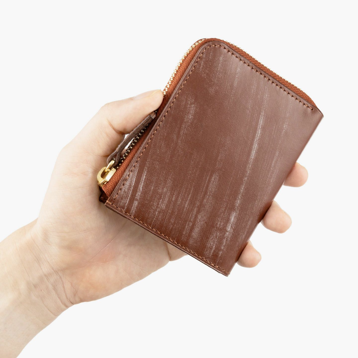 スマートなキャッシュレス化を実現するコンパクト財布の導入モデルを目指し、商品名を“導きの神様”と言われている“カラス=Corvus(コルバス)”にした、L字ジップハーフウォレット“Corvus”。程よくゆとりのあるコンパクト過ぎないサイズ感と、蛇腹に大きく開く機能的なWマチによる視認性・収納性を追求。イギリス・トーマスウェア&サンズ社製「ブライドル」“ダイドスルー”の外装は、スムーズで美しい銀面とワイルドな刷毛目のブルームが魅力。内装は、和紙のような味わいで経年変化を楽しめる「マルゴー」と、オプションとして外装と同じ「ブライドル」のいずれかをセレクト可能。フルレザー仕様の贅沢さが、普段使いに高級感を奏でてくる。