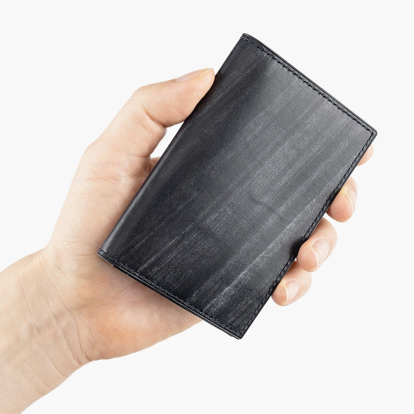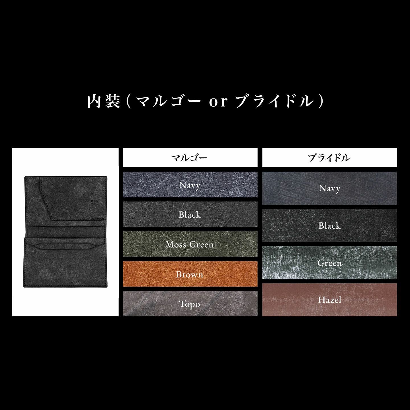 笹マチによるシャープなシルエットや、アオリポケットなどの内装デザイン、スリムさとタフさを兼ね備えた作りなど、刀の鞘をイメージした名刺入れ“Saya”。外装には、イギリス・トーマスウェア社製「ブライドル」“ダイドスルー”を採用し、格式高い本場の高級レザーによる、美しくスムーズな銀面とワイルドな刷毛目のブルームが魅惑的。内装には、和紙のような味わいで経年変化も楽しめる「マルゴー」を採用し、強度・耐久性・撥水性に優れている「ブライドル」を、オプションとして外装・内装で統一させることも可能。裏地までレザーで仕立てたフルレザー仕様の贅沢さと、細部まで職人技を注ぎ込んだ丁寧さが、ビジネスの見方になってくれる。