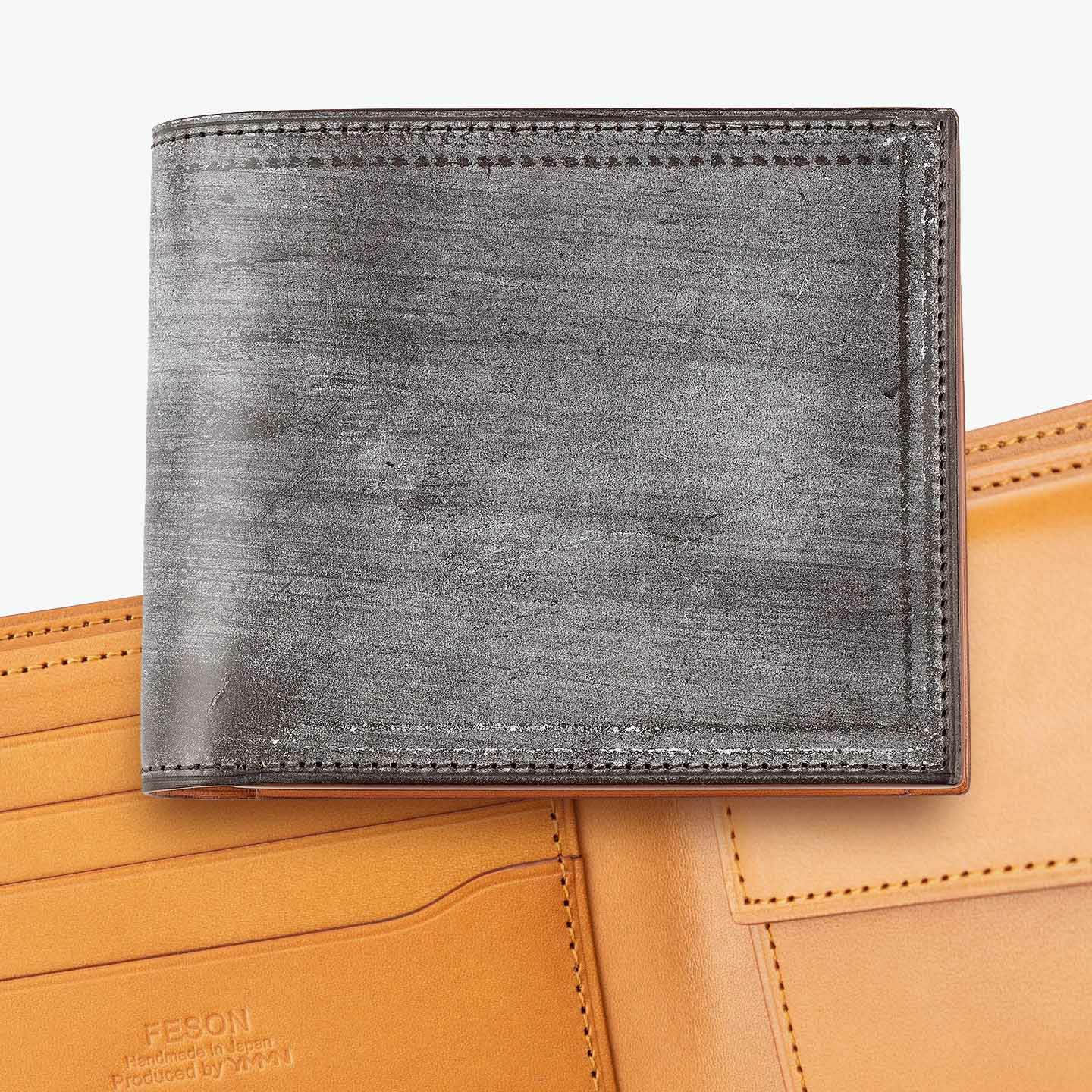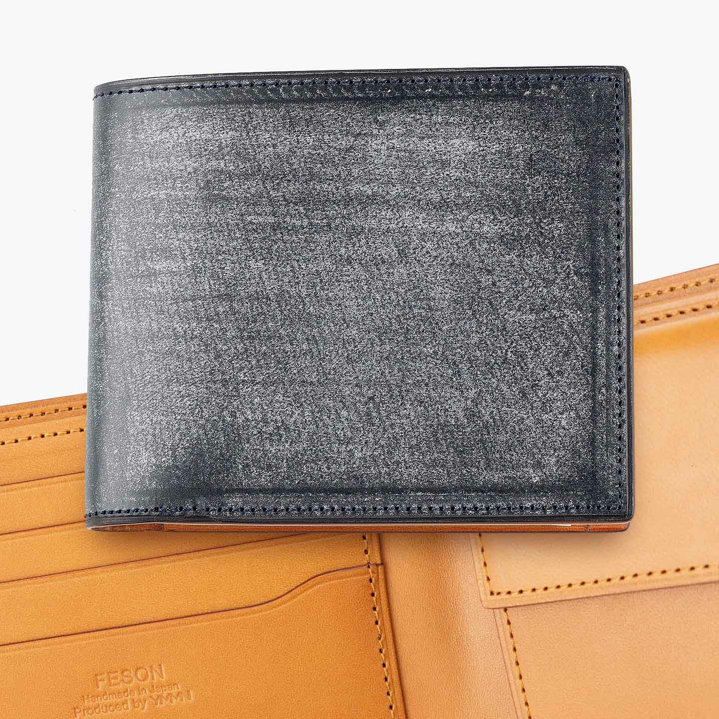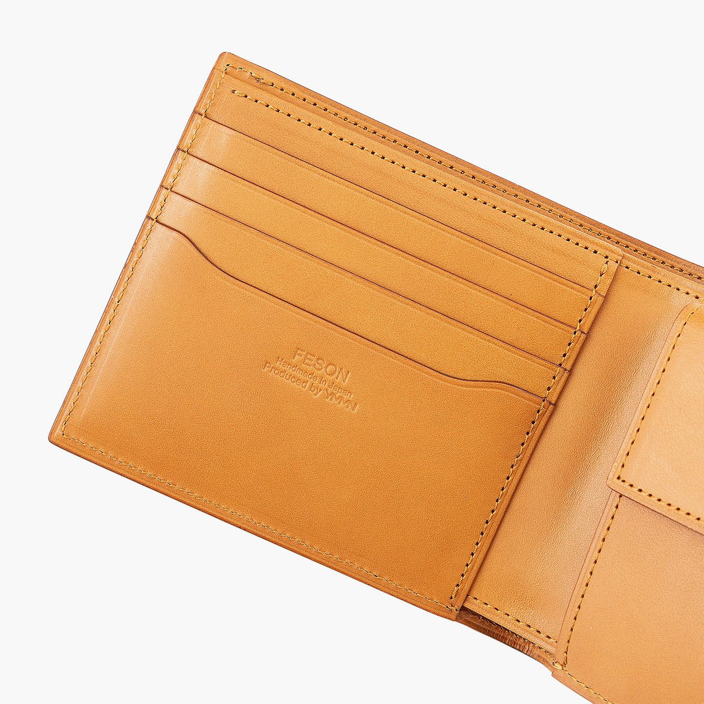他にはない高級感あふれる品質を追い求め、細部の美しさにこだわり抜いた熟練の職人が仕立てている、ファクトリーブランド『FESON』の二つ折り財布(小銭入れ付き)。“ブルーム”という白い粉が表皮に現れる外装の「ブライドルレザー」と、キメ細かく上質な内装の「国産ヌメ革」による、まったく異なる質感と表情が、相棒のように使いこなす歓びへと昇華。白い粉が自然となくなり美しいツヤ肌になっていく風合いと、プレーンから味わい深さが育っていく佇まいが奏でる、経年変化による2素材の素晴らしい共演が、長く使い続けたくなる愛着感も育ててくれる。
