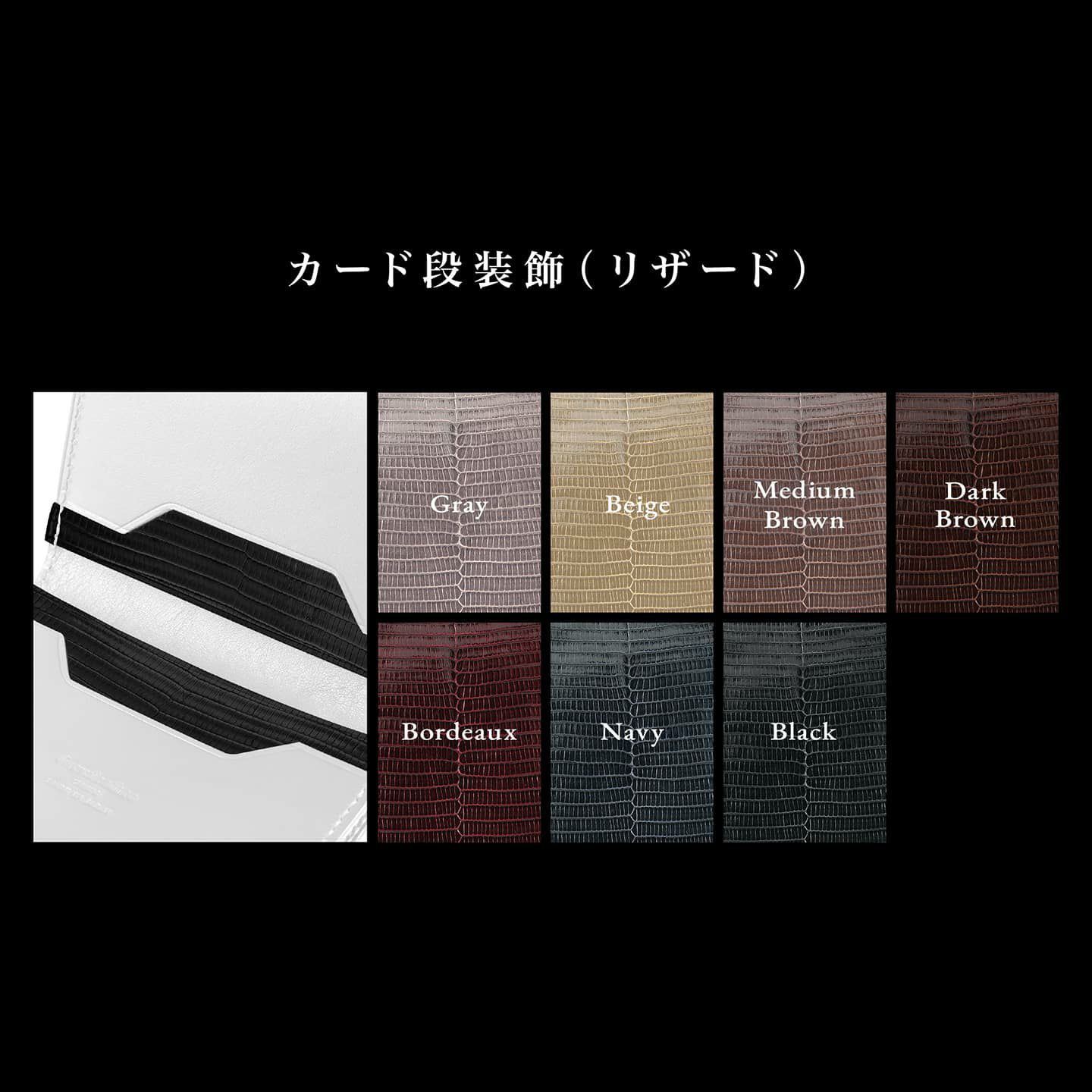 本体ベースは、イタリア牛のショルダー革に植物タンニン鞣しを施したスムースレザー「ブリランテ」。使い込むほどに光沢感が増していく高級素材で、適度なハリとコシを併せ持ち、エレガントで上品な印象が魅力。色の大幅な経年変化を生まないため、ドレッシーで落ち着きのある表情を長きに渡り維持。カードポケットの内革には、本体色と合わせた「リザード」を合わせ、アバンギャルドな洒落感を演出。