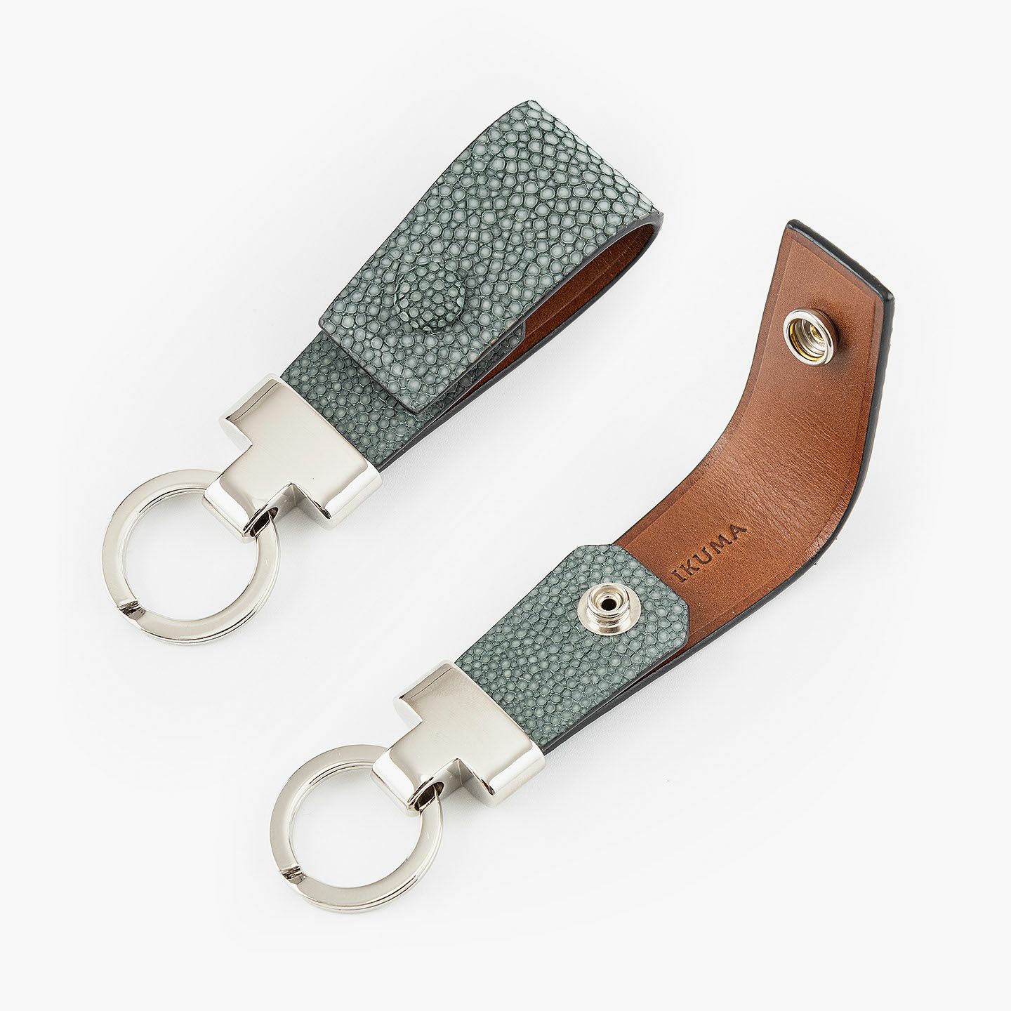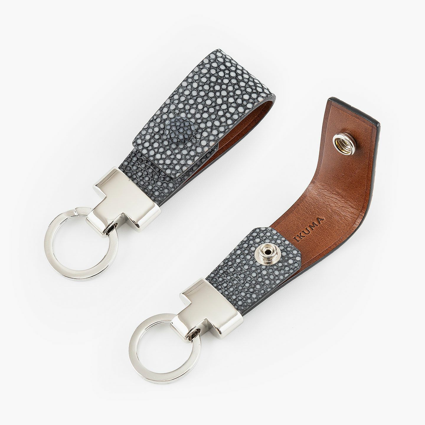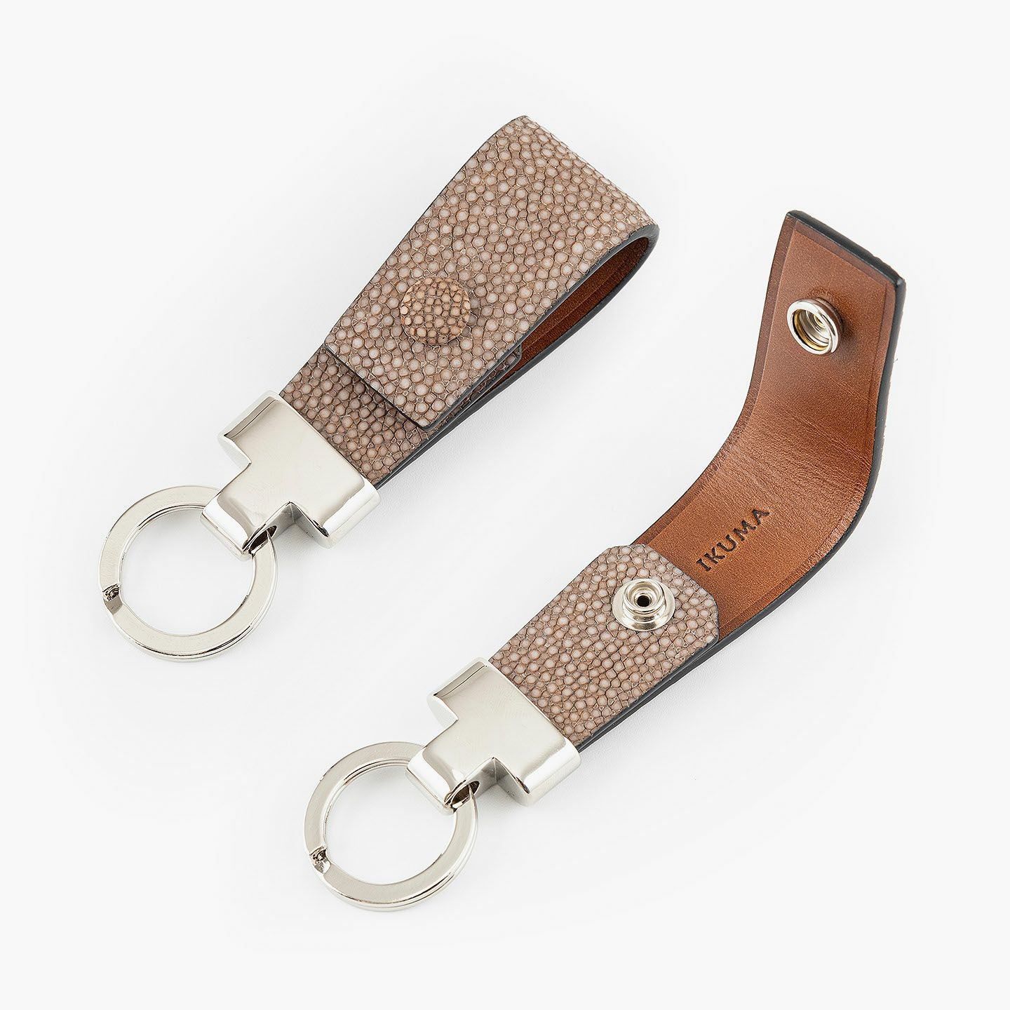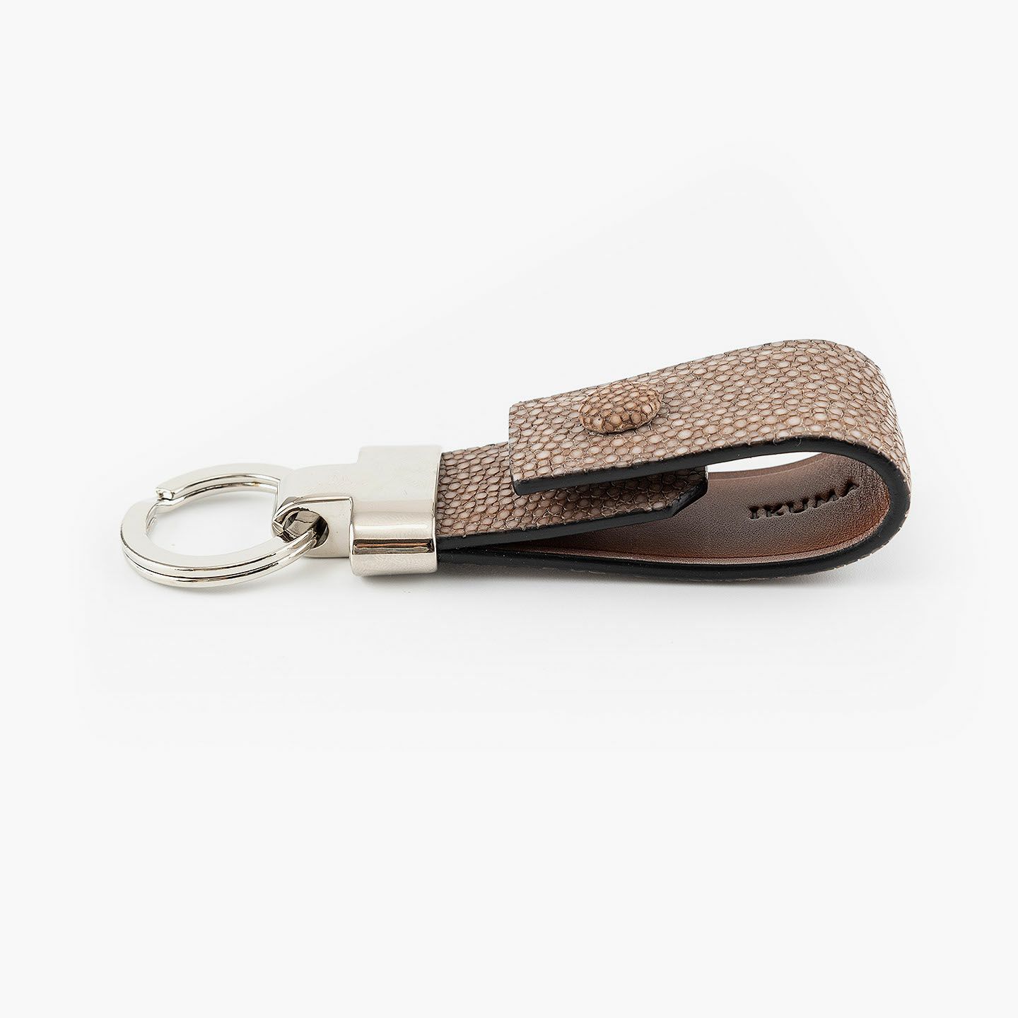 素材感を際立たせるシンプルなデザインと、表地・革芯・裏地の三層構造による膨らみを感じるフォルムで魅せる、高級感あふれるキーホルダー。アカエイの表面を削って面を出した“吟スリ”を採用している表地「ガルーシャ」は、古来より“ラッキーフィッシュ”とも呼ばれ、縁起が良い幸運なマテリアルとして重宝され、宝石を散りばめたようなキラキラと輝く独特の表情が魅惑的。その表地とまったく異なる質感の裏地「ブッテーロ」は、革らしい自然な風合いと美しい透明感がエレガントで、表裏でそれぞれ引き立て合う2つの高級皮革が、普段使いのアイテムに贅沢感を。人の目を惹くほどの佇まいが、極上な大人感を演出してくれる。