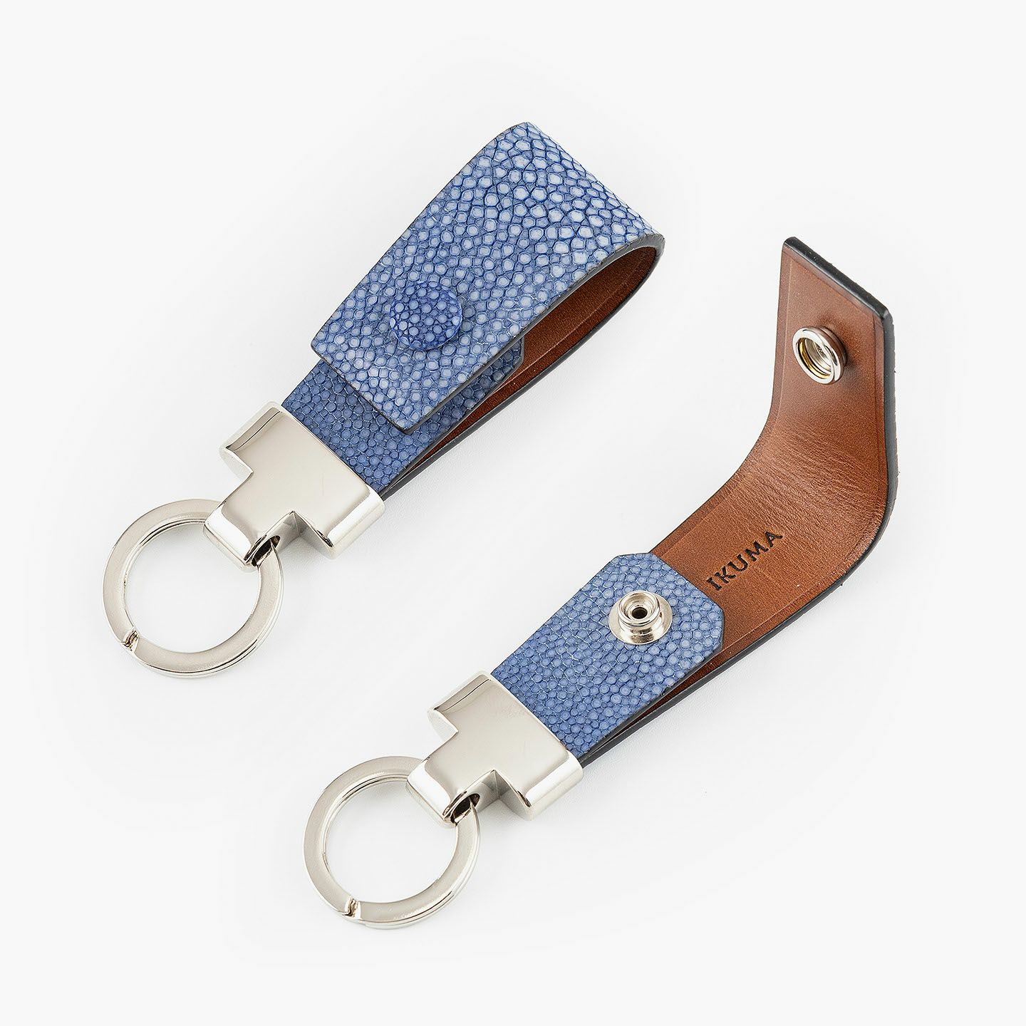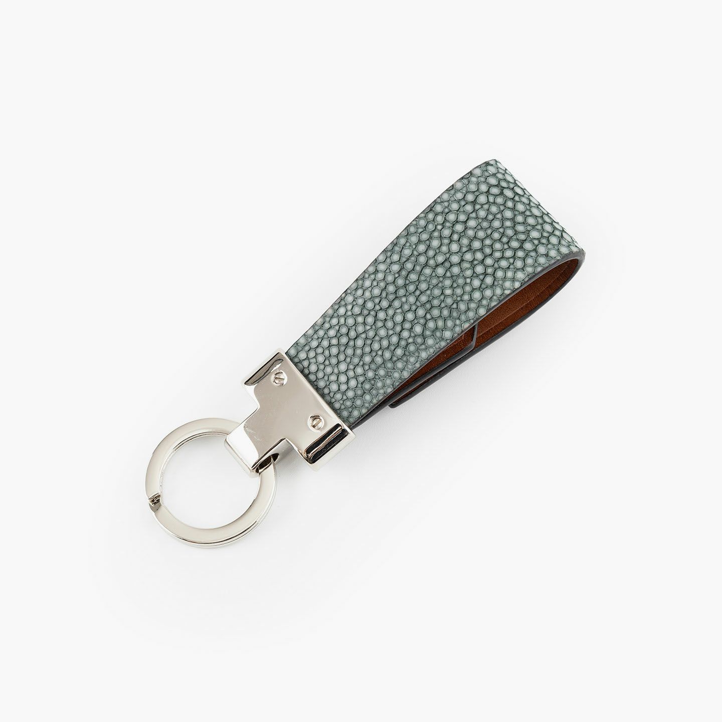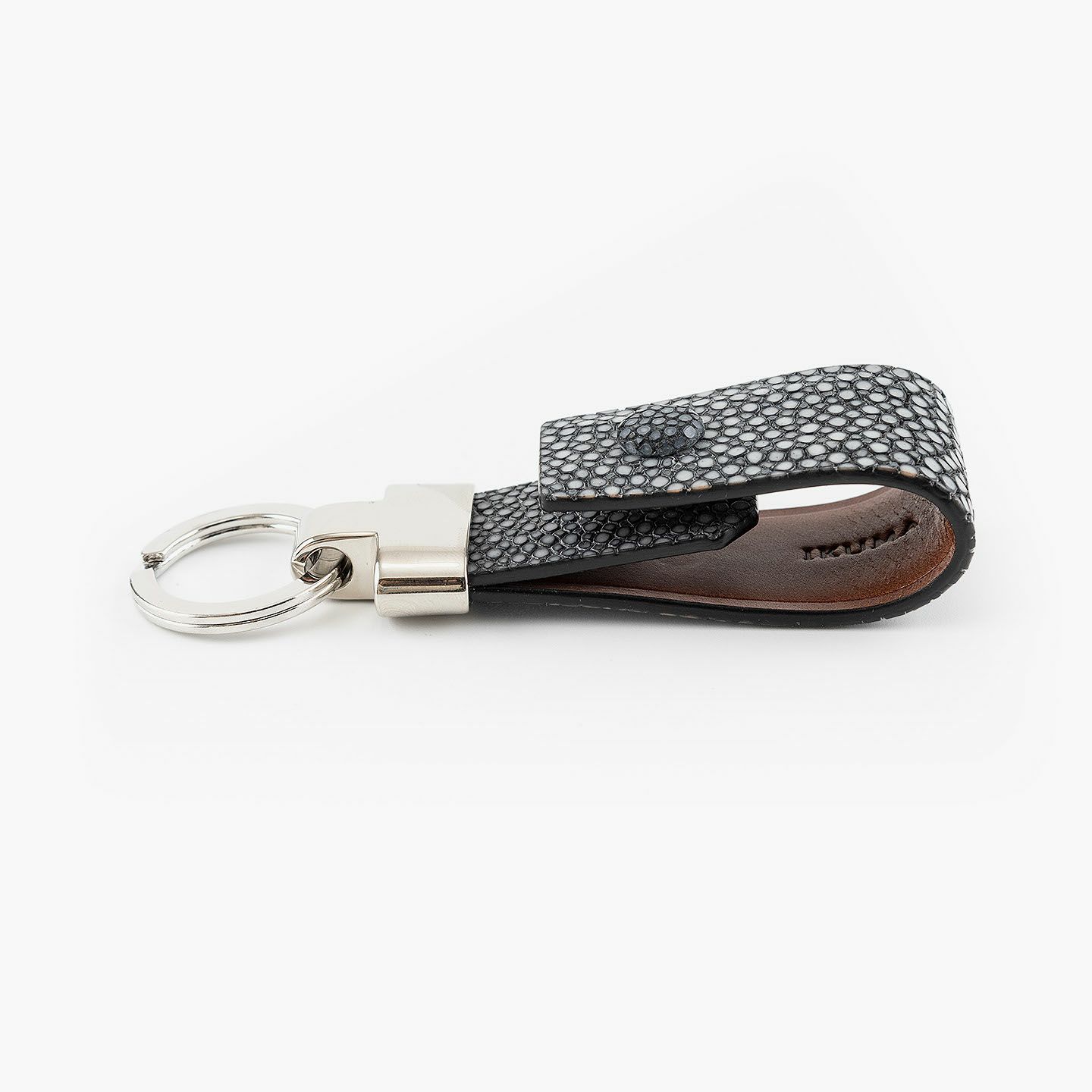 素材感を際立たせるシンプルなデザインと、表地・革芯・裏地の三層構造による膨らみを感じるフォルムで魅せる、高級感あふれるキーホルダー。アカエイの表面を削って面を出した“吟スリ”を採用している表地「ガルーシャ」は、古来より“ラッキーフィッシュ”とも呼ばれ、縁起が良い幸運なマテリアルとして重宝され、宝石を散りばめたようなキラキラと輝く独特の表情が魅惑的。その表地とまったく異なる質感の裏地「ブッテーロ」は、革らしい自然な風合いと美しい透明感がエレガントで、表裏でそれぞれ引き立て合う2つの高級皮革が、普段使いのアイテムに贅沢感を。人の目を惹くほどの佇まいが、極上な大人感を演出してくれる。