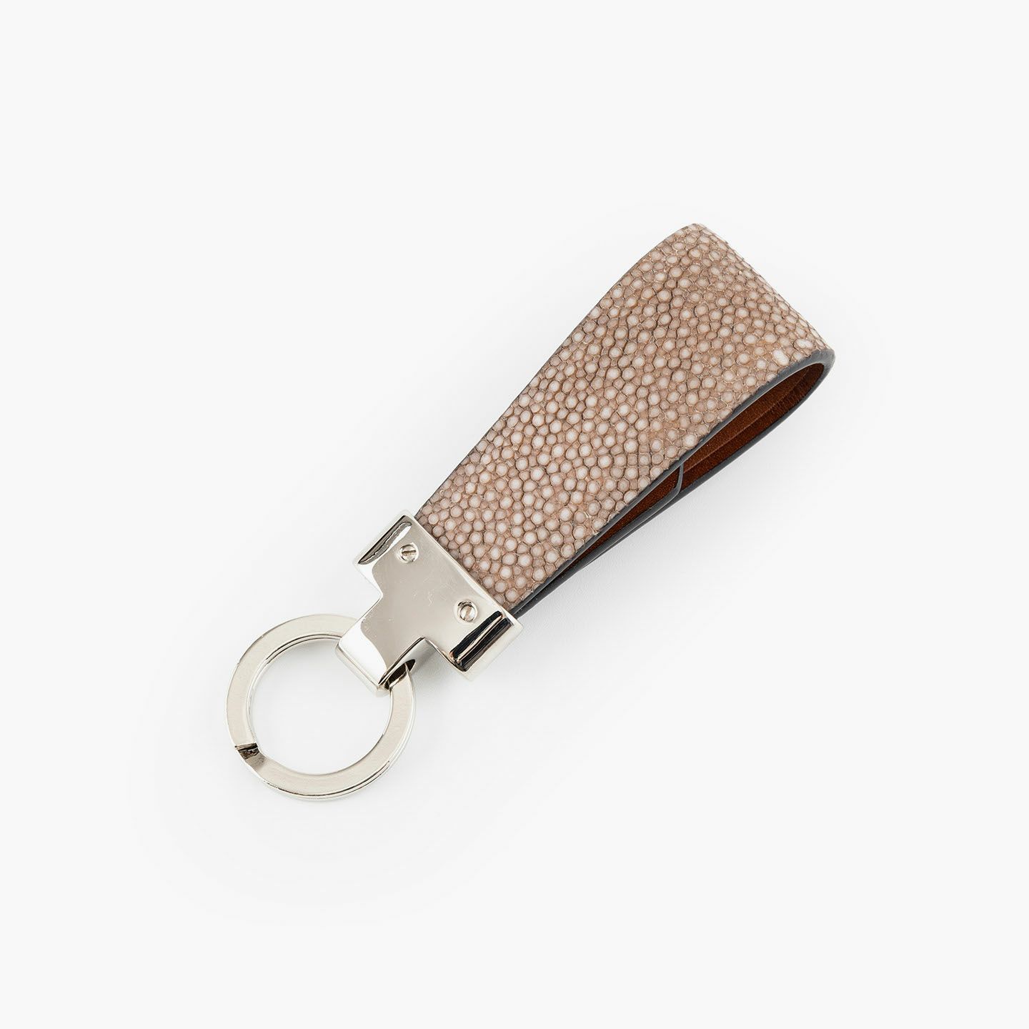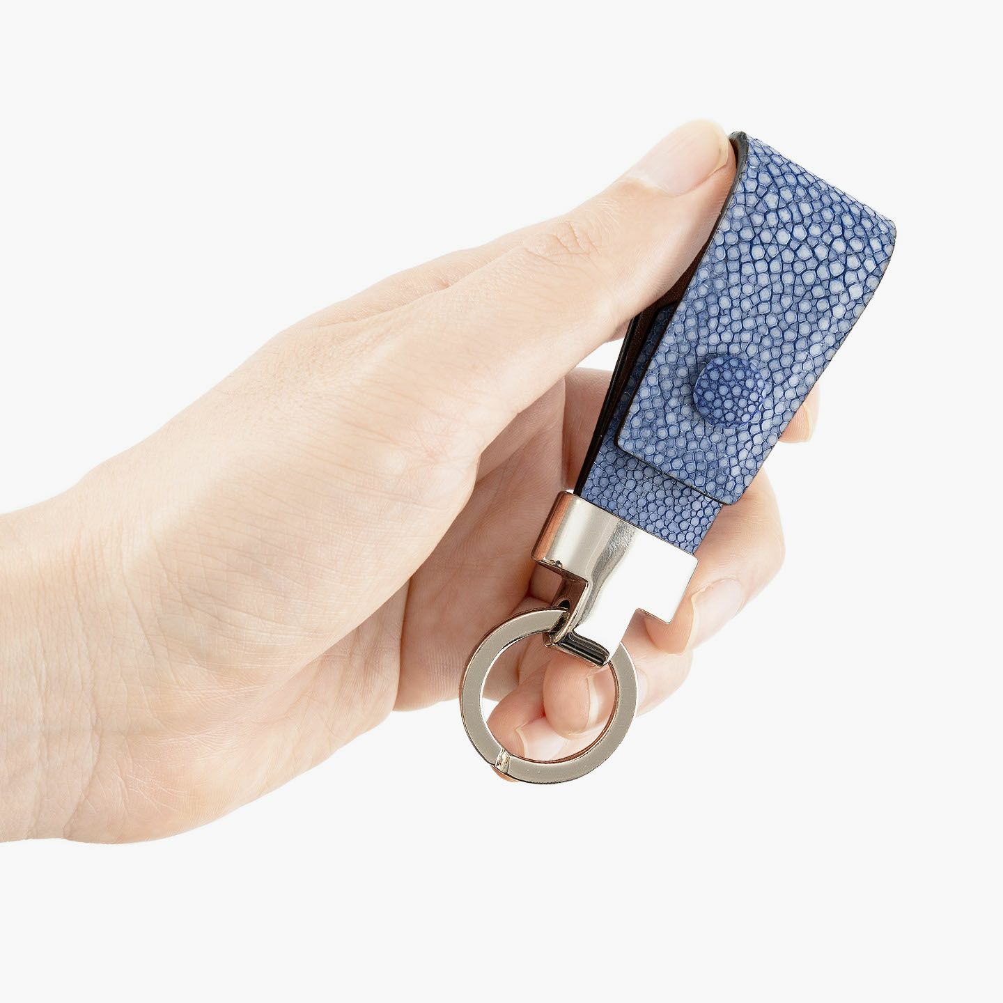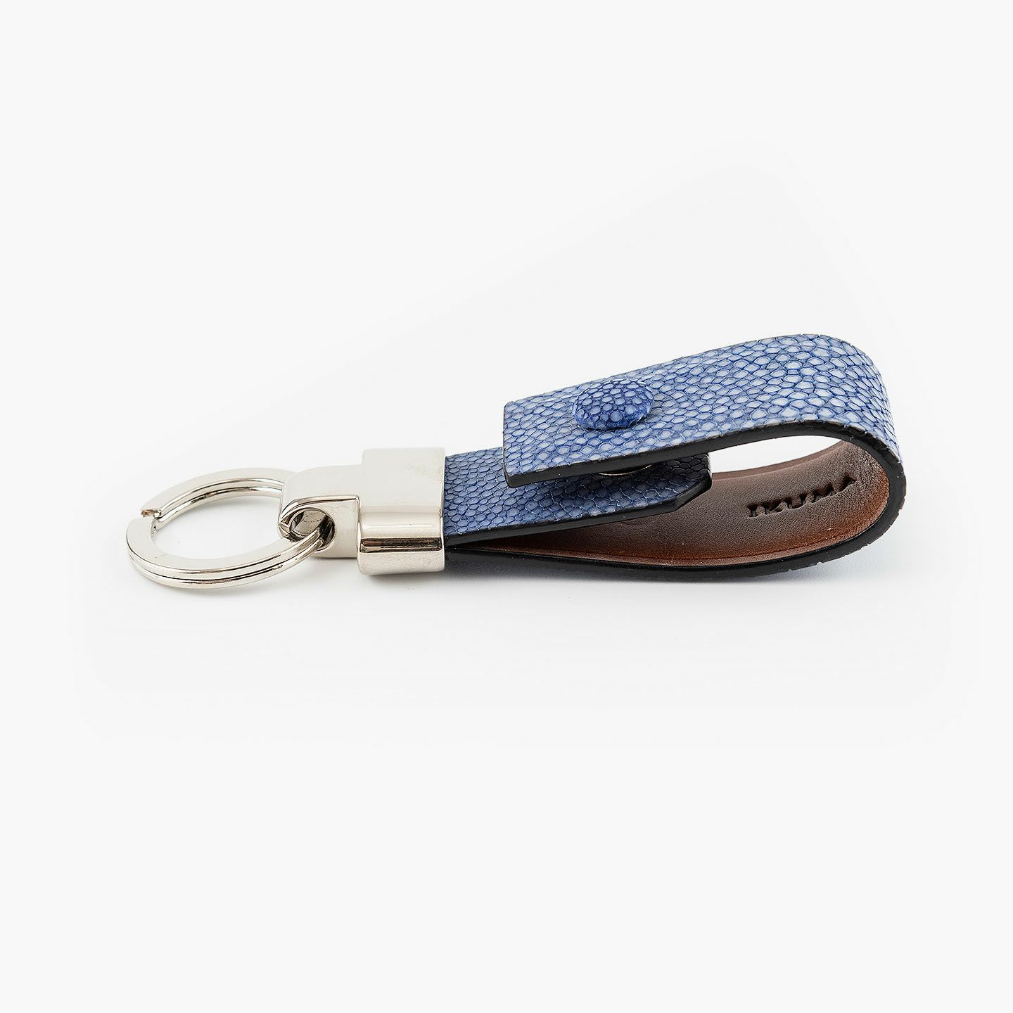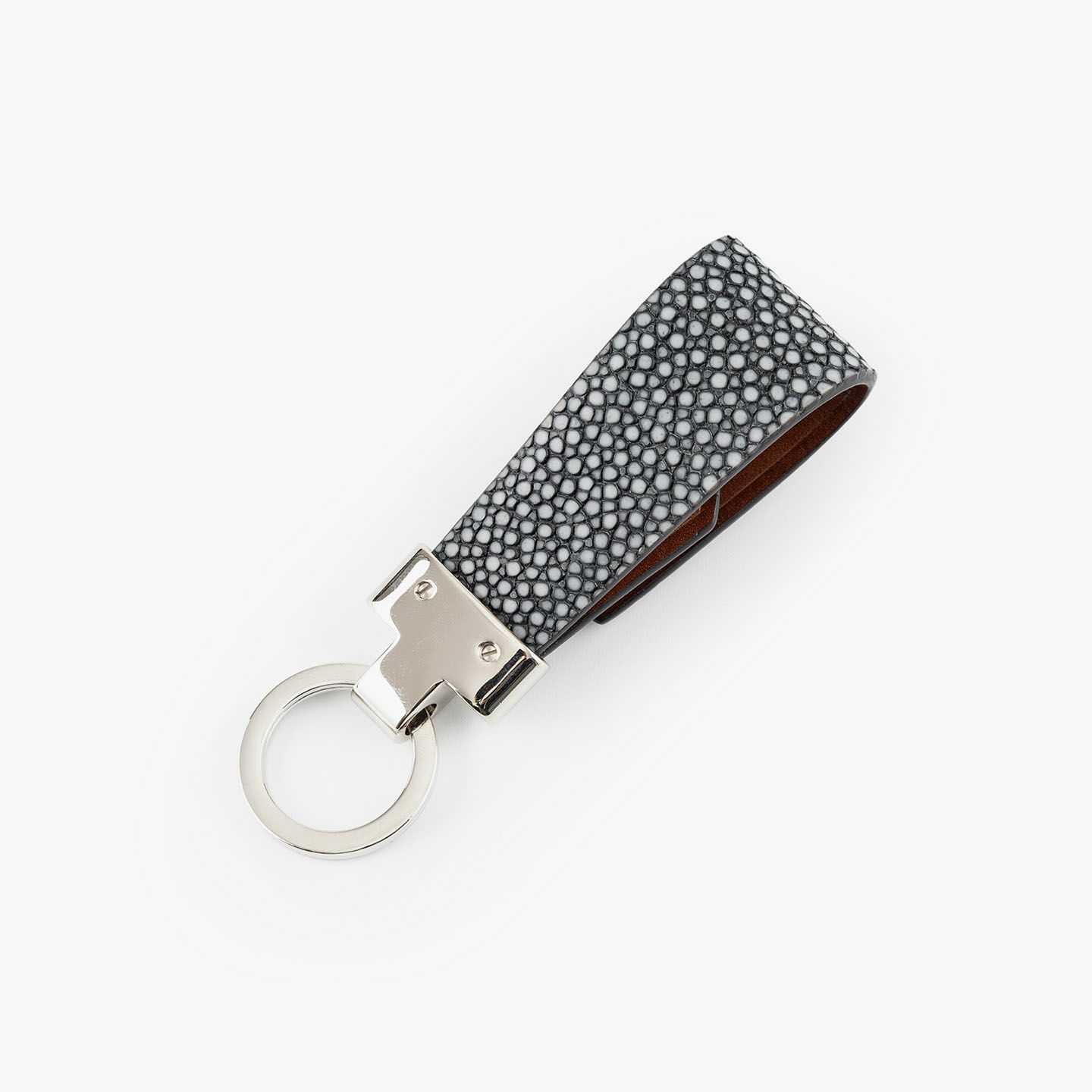 素材感を際立たせるシンプルなデザインと、表地・革芯・裏地の三層構造による膨らみを感じるフォルムで魅せる、高級感あふれるキーホルダー。アカエイの表面を削って面を出した“吟スリ”を採用している表地「ガルーシャ」は、古来より“ラッキーフィッシュ”とも呼ばれ、縁起が良い幸運なマテリアルとして重宝され、宝石を散りばめたようなキラキラと輝く独特の表情が魅惑的。その表地とまったく異なる質感の裏地「ブッテーロ」は、革らしい自然な風合いと美しい透明感がエレガントで、表裏でそれぞれ引き立て合う2つの高級皮革が、普段使いのアイテムに贅沢感を。人の目を惹くほどの佇まいが、極上な大人感を演出してくれる。