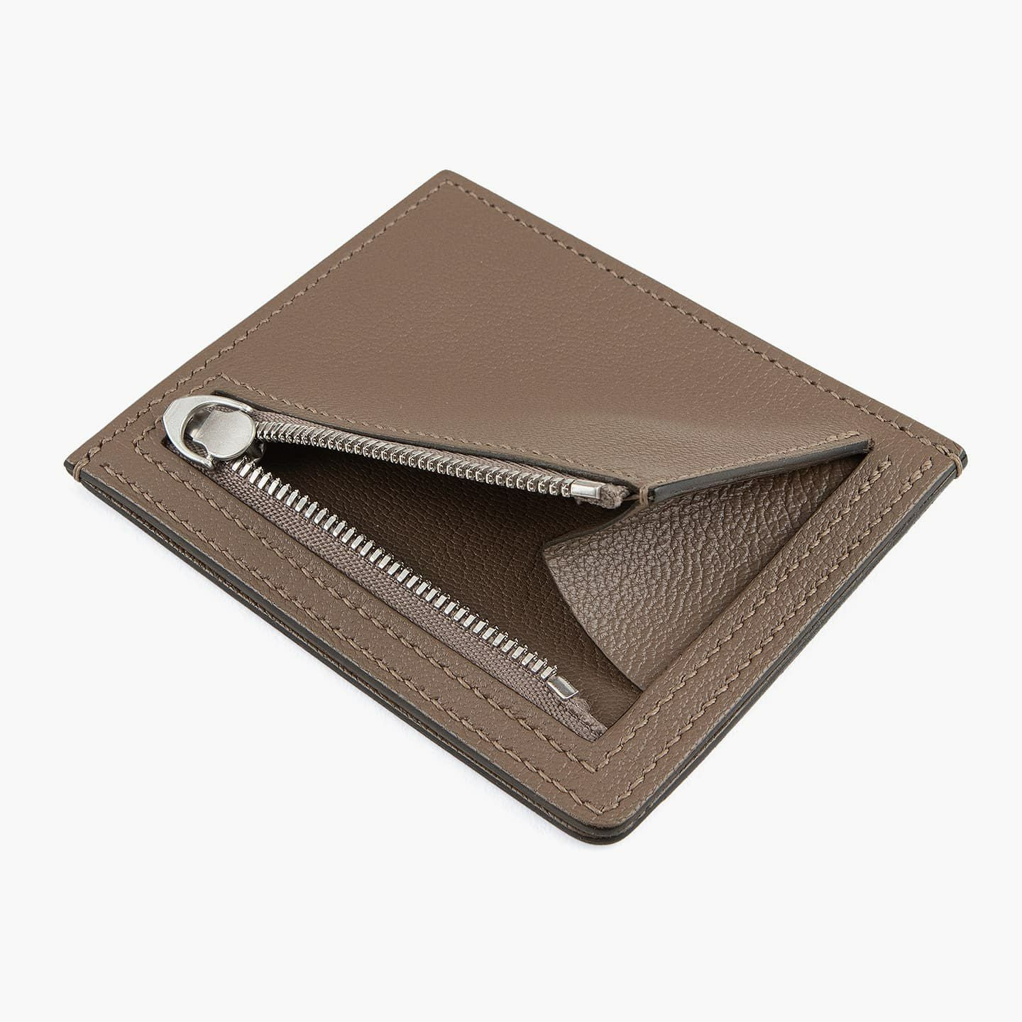 表面のカードポケットは、カードを3枚収納していてもスマートな佇まいを保つために、なるべく厚くならないようにデザイン。裏面の小銭入れは、全体的なスリムさを維持しつつ、小銭を出し入れしやすくするために、小さなマチでありながらも最大限に開くように設計。ファスナーテープは、外装のカラーと合わせて調和させながら、金具をYKKエクセラのシルバーを採用することで高級感を演出しています。