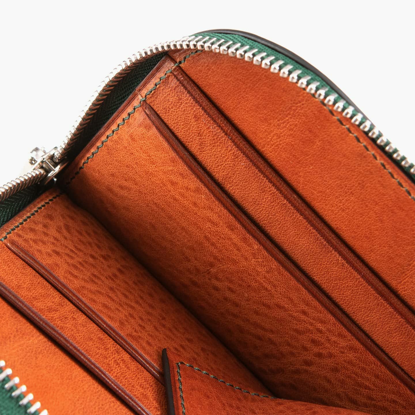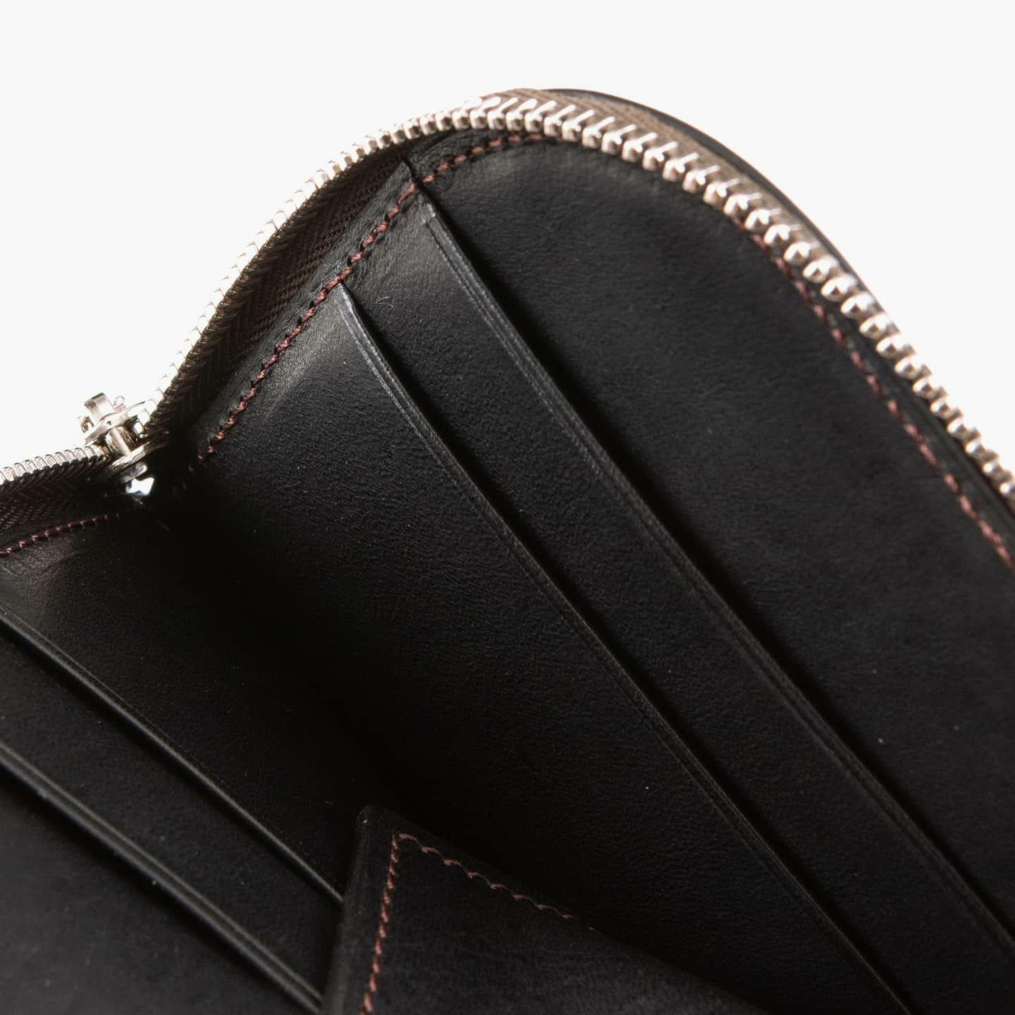 ファスナーを開いた瞬間に、すべての収納物をひと目で見渡せ、特に小銭の取り出しやすさに優れた設計。多くを収納している状態でも、財布としての美しさを保てることを追求し、小銭入れの底が中央付近になるようにデザインされています。YKKエクセラを採用したファスナーの引き手には、ヨーロピアン的な雰囲気を醸すエレガントな形状を採用。サイズ的には小さいながらも、摘みやすさを兼ね備えています。