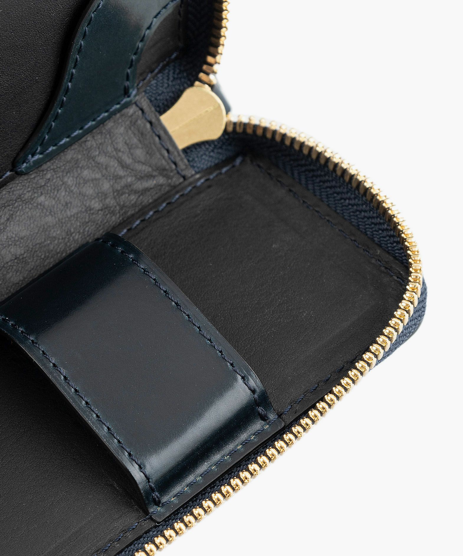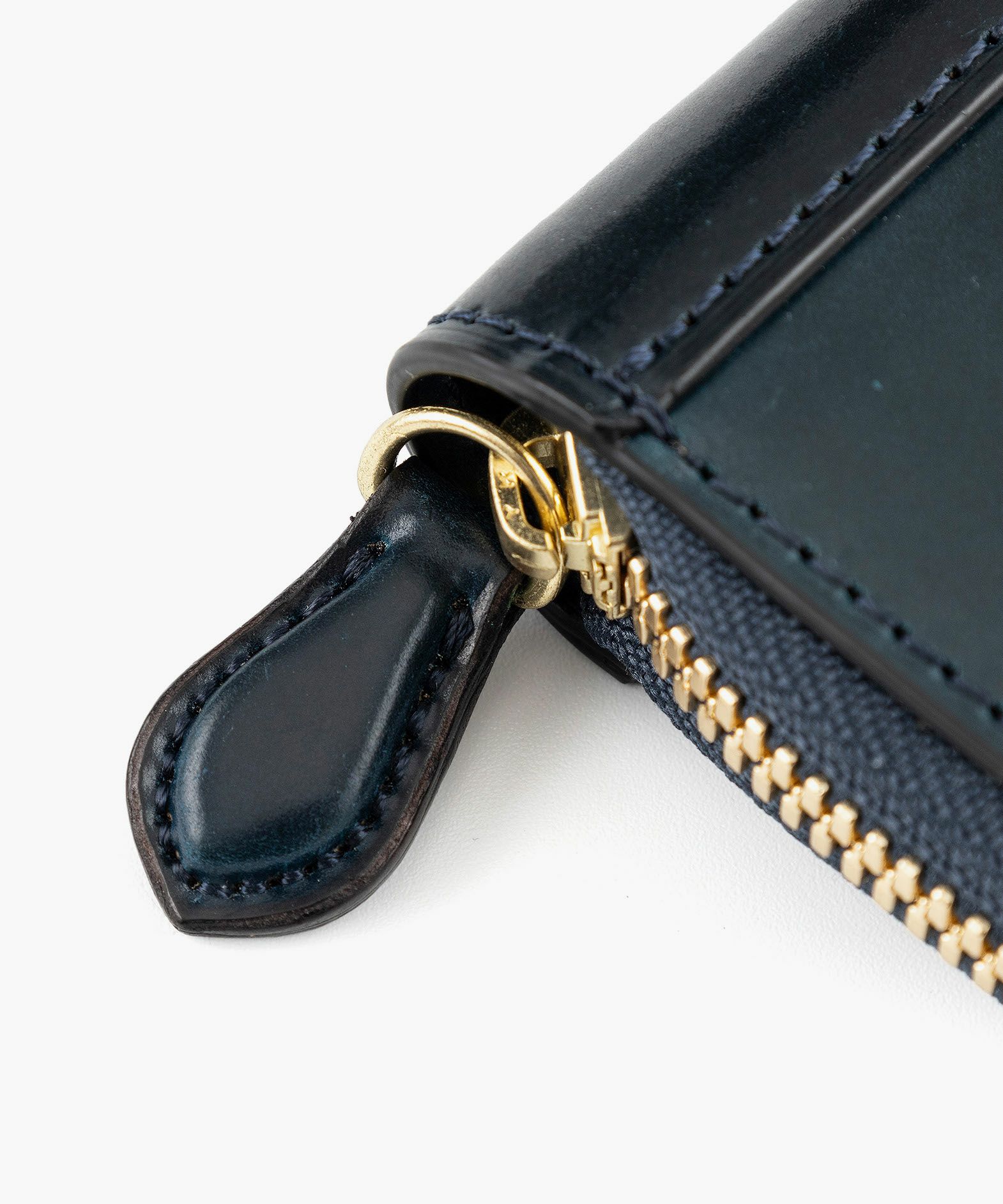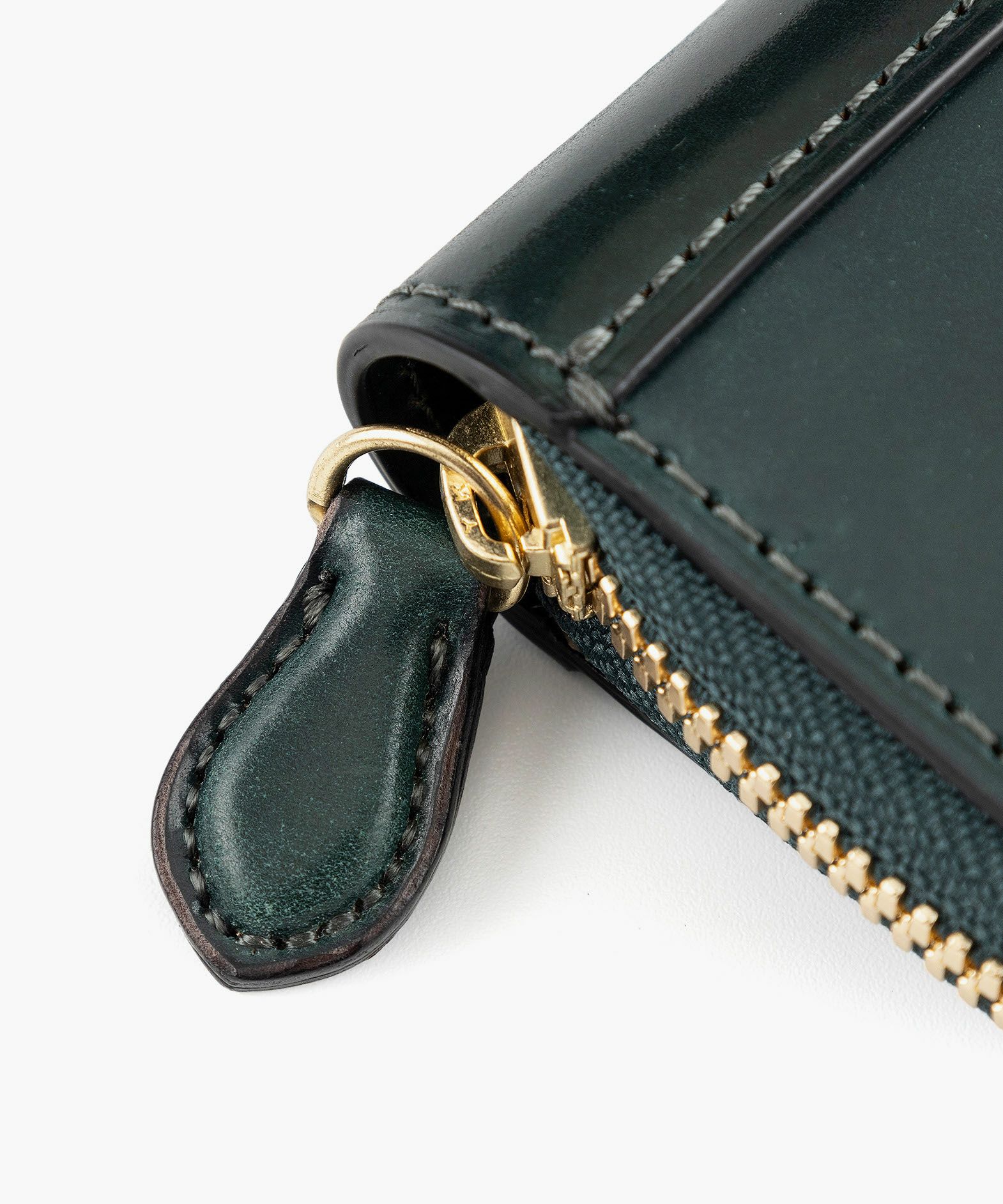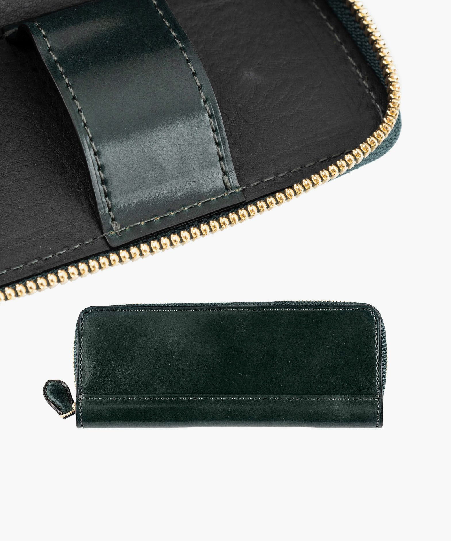 世界の名だたるトップメゾンに選ばれ続ける世界随一のコードバンタンナーであり、100年以上の歴史を誇る老舗タンナーでもある、アメリカ・イリノイ州シカゴのホーウィン社(Horween Leather Company)製の「シェルコードバン」。約半年間の手間と時間をかけて、ベジタブルタンニンで丁寧に鞣していく製法により、長時間かけた加油によってしっとりとしたハリを保ちながらも、柔軟性やしなやかさにも富み、使い込むほどに高品位な味わいを醸し出します。また、じっくりと鞣されているため、革の内部から奥深い色合いを表現しているような雰囲気も魅力。オイルが十分に浸透していて、表皮からオイル・脂が入りにくく抜けにくいため、ケアを余りしなくても自らのオイルで小キズなどを修復する特長もあります。新品時にはギラリと光るような圧倒的な表情で、自然な仕上げのため表面に小キズやピンホールと呼ばれる毛穴・毛細血管の形跡が残ることがありますが、使い込むほどに繊維が寝て徐々に目立たなくなるなど、エイジングも素晴らしくて楽しんで育てられるマテリアルです。さらに、そのような表面はもちろん、製造した証となるロゴスタンプが一枚革に1印のみ記されている背面(裏面)も、世界中の多くの愛好家からは人気。背面(裏面)の使い始めは、しっとりサラサラとした手触りですが、使い込んでいくと次第に艶やかに経年変化していくのも特長的です。