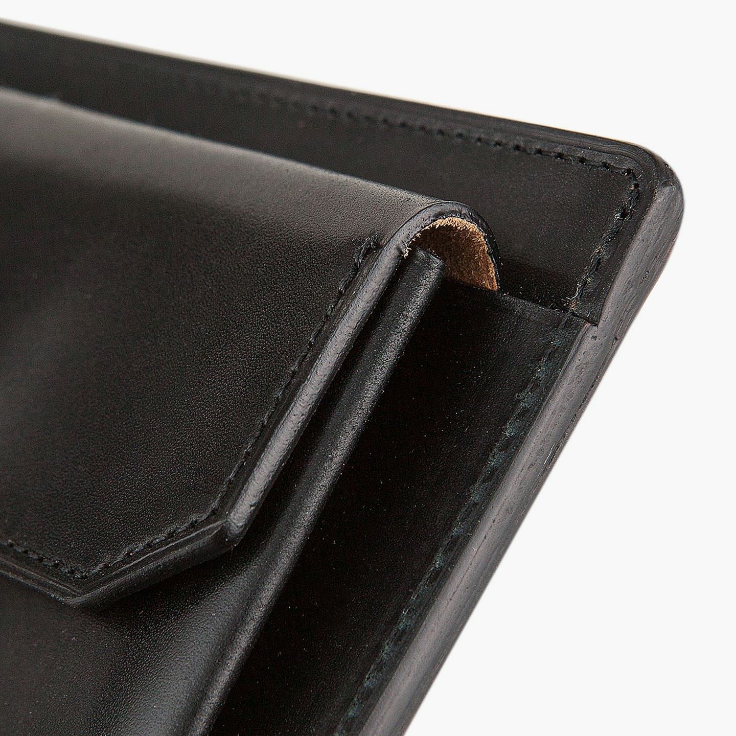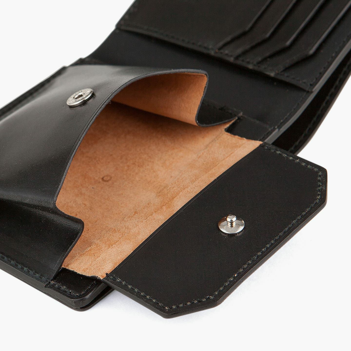 ホールド性に優れている、イタリア製ホックを装備した小銭入れ。内部は、「シェルコードバン」の床面をそのまま使用することで、クラフト感を演出。本体のマットブラックを引き立てるとともに、デザイン全体の美しいカラーリングも醸成。(床面は、表面を滑らかにしていますが、色ムラなどはそのまま使用。)