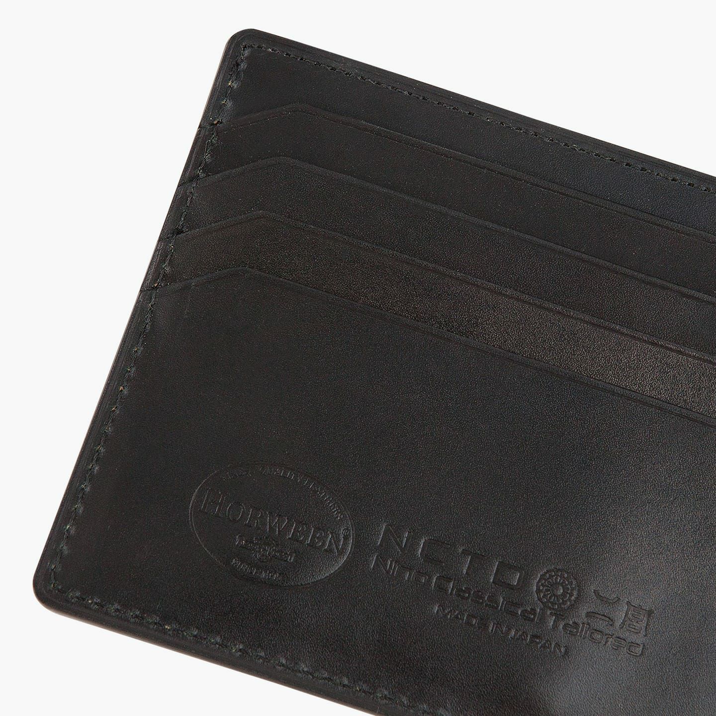 カード段下には、高品質を保証するように『ホーウィン社』と『二宮五郎商店』のダブルネームを刻印。素材の「シェルコードバン」は、使い込むほどに内部のオイルがこの上ないツヤ感を生み出し、至高の美しさを讃えるかのごとく高品位に経年変化。