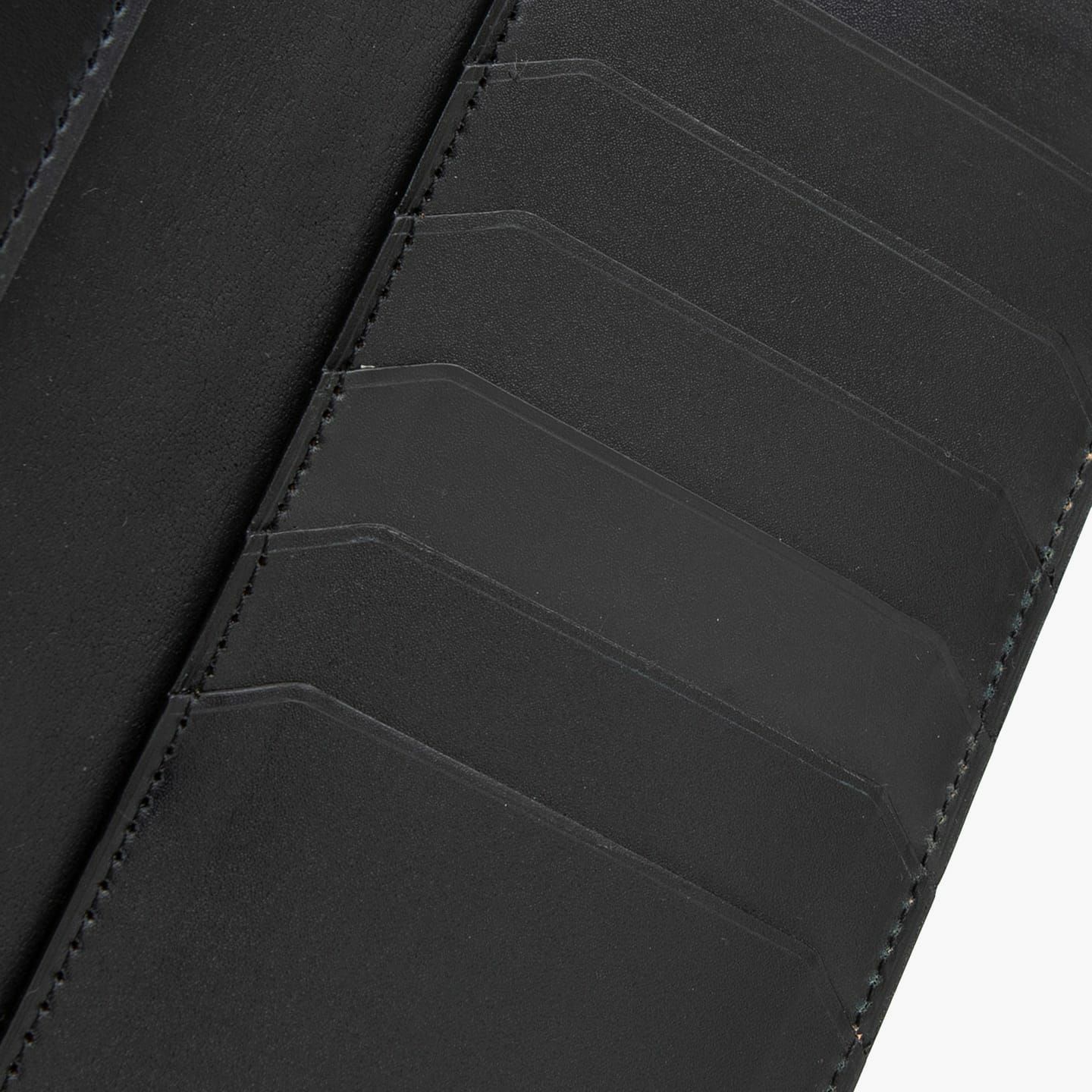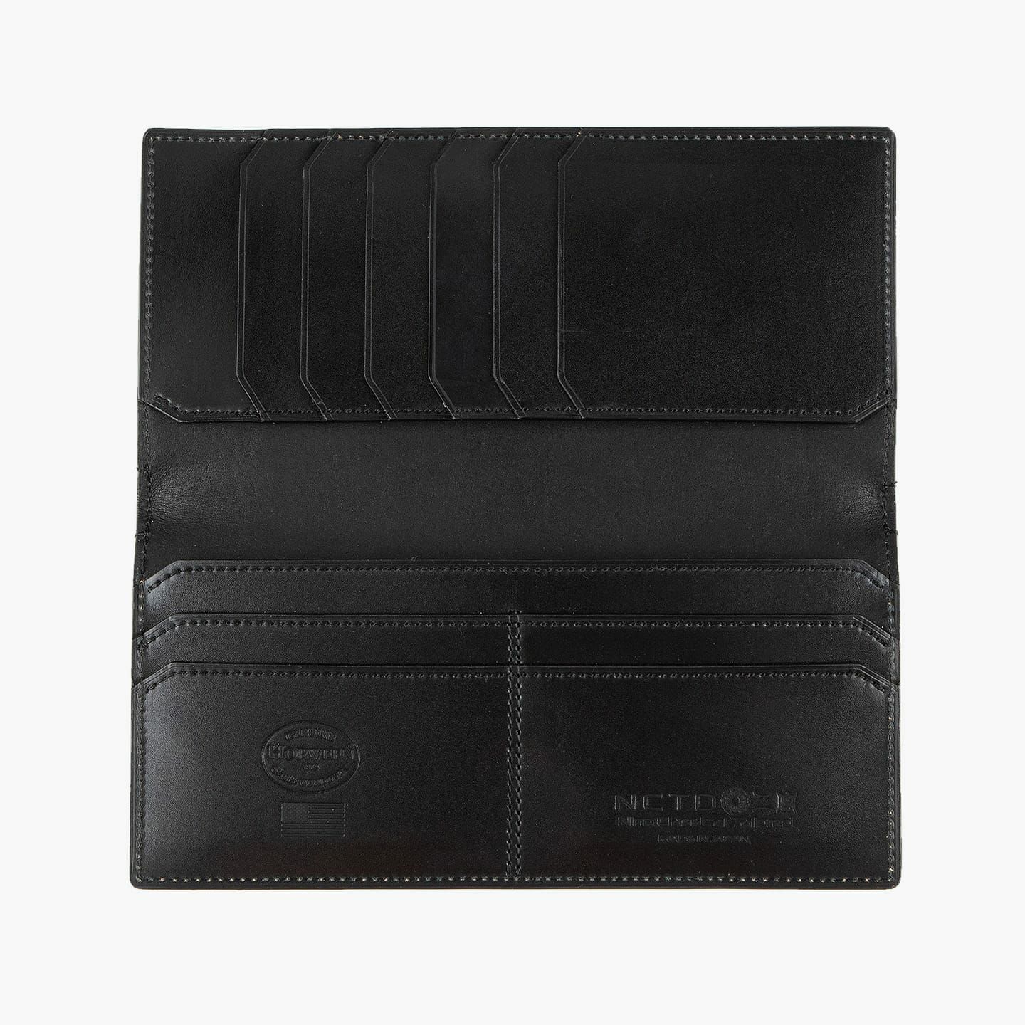 札入れ2カ所と10枚のカードポケットのみを装備した、スタイリュシュなスリムタイプ。内装中央の谷折り部分などには、外装の「シェルコードバン」と同じホーウィン社の「クロムエクセルレザー」を贅沢に使用することで、全体的な漆黒のツヤ感に美しい調和が生まれ、より一層の重厚感を創出。さらに、日本で唯一、ホーウィン社の刻印も許されており、同一面に『二宮五郎商店』の刻印とのダブルネームを実現しています。