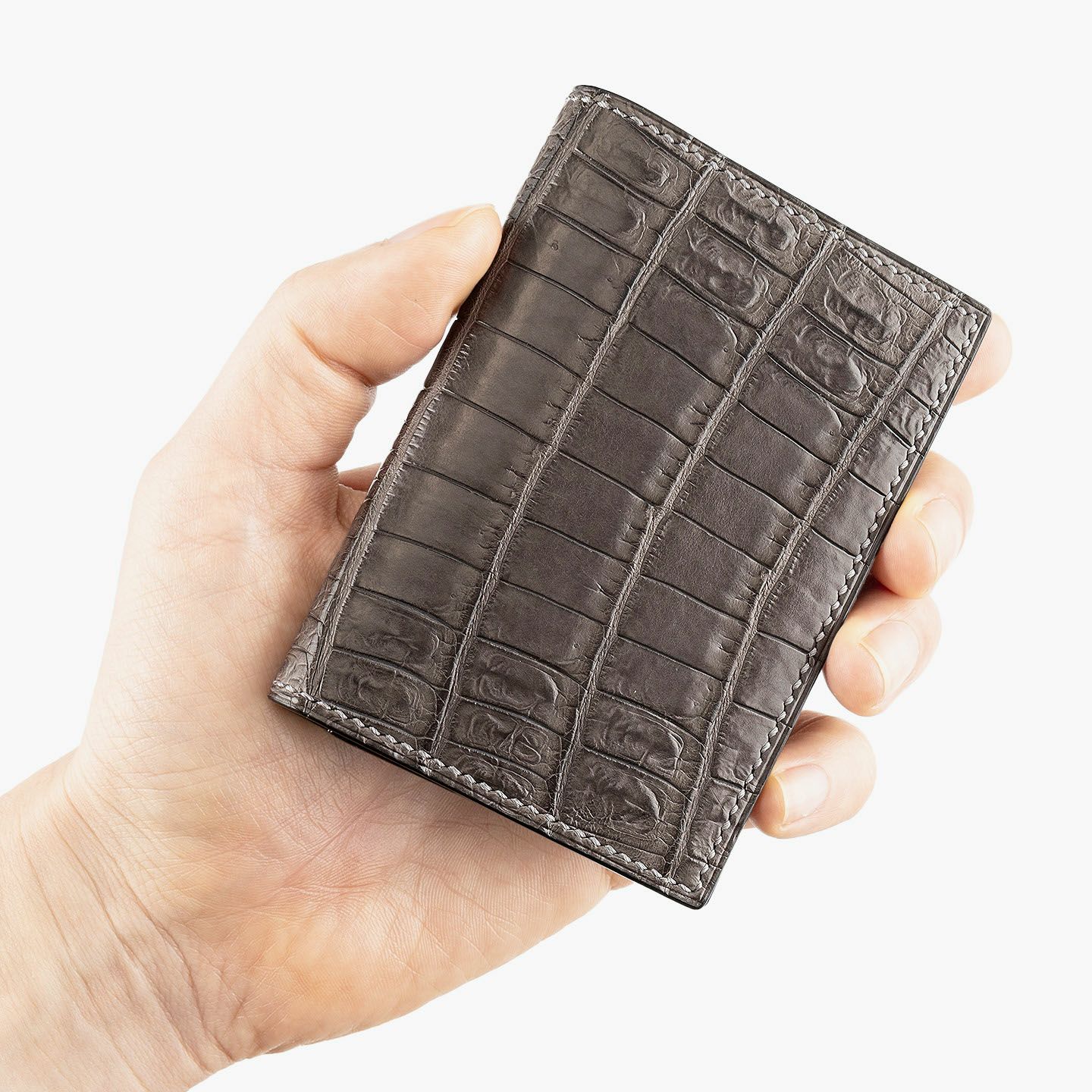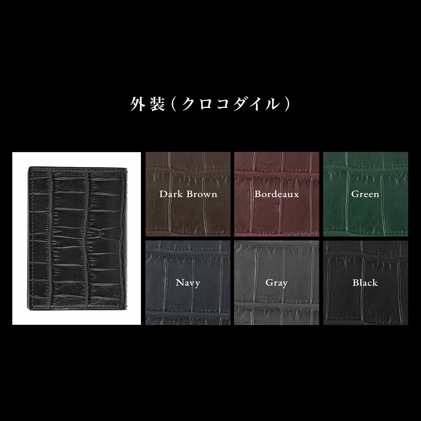 名刺を30〜40枚ほど収納できる通しマチメインポケット1つと、カードポケット2つ・アオリポケット1つを備えた名刺入れ。外装の「ナイルクロコダイル」は6色からセレクトでき、オプションでカブセ裏にある内装のアオリポケットを、外装と同じ素材・カラーに変更することも可能です。内装の「ダービー」は豊富な16色から選ぶことができ、総手縫いによる緻密なステッチの糸色、手間暇をかけている高品質なコバの色、ファスナーテープの色は、セレクトした革色に合うカラーをブランドがチョイス。さらに、ブランドロゴ刻印(箔押し)も、Silver・Goldのいずれかからセレクトでき、カラーオーダーやオプションなどとともに、自分オリジナルの1点もののような受注生産ができます。
