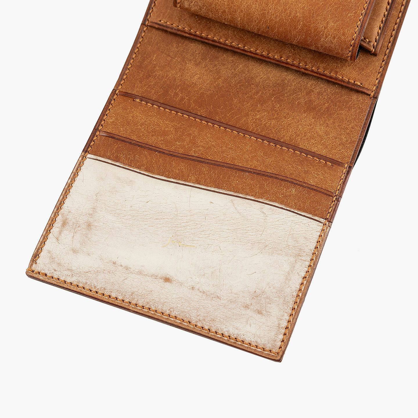外装のアクセントとして高級エキゾチックレザー「クロコダイル」を纏わせ、コンパクトなサイズ感ながら存在感を漂わせている、二つ折り財布(小銭入れ付き)“ワイスホルン 1.1”。その腑模様とは相反する外装・内装の「プエブロ」は、和紙のように表面を起毛させた独特の風合いを醸しながら、ビンテージ感あふれる美しいツヤ肌へと経年変化していく楽しみも。曲線を施したカードポケットのカットラインが、見た目のデザイン性と出し入れしやすい機能性を両立。そのカードユニットの最下段には、内装のアクセントとしてホワイトワックス仕上げを施した「ブーロ」を採用。使い込むほどに内装と同系色の色味が露出していき、「プエブロ」とは異なるエイジングへ。外装・内装それぞれ異なるアクセントが、独創的な感性を演出してくれる。