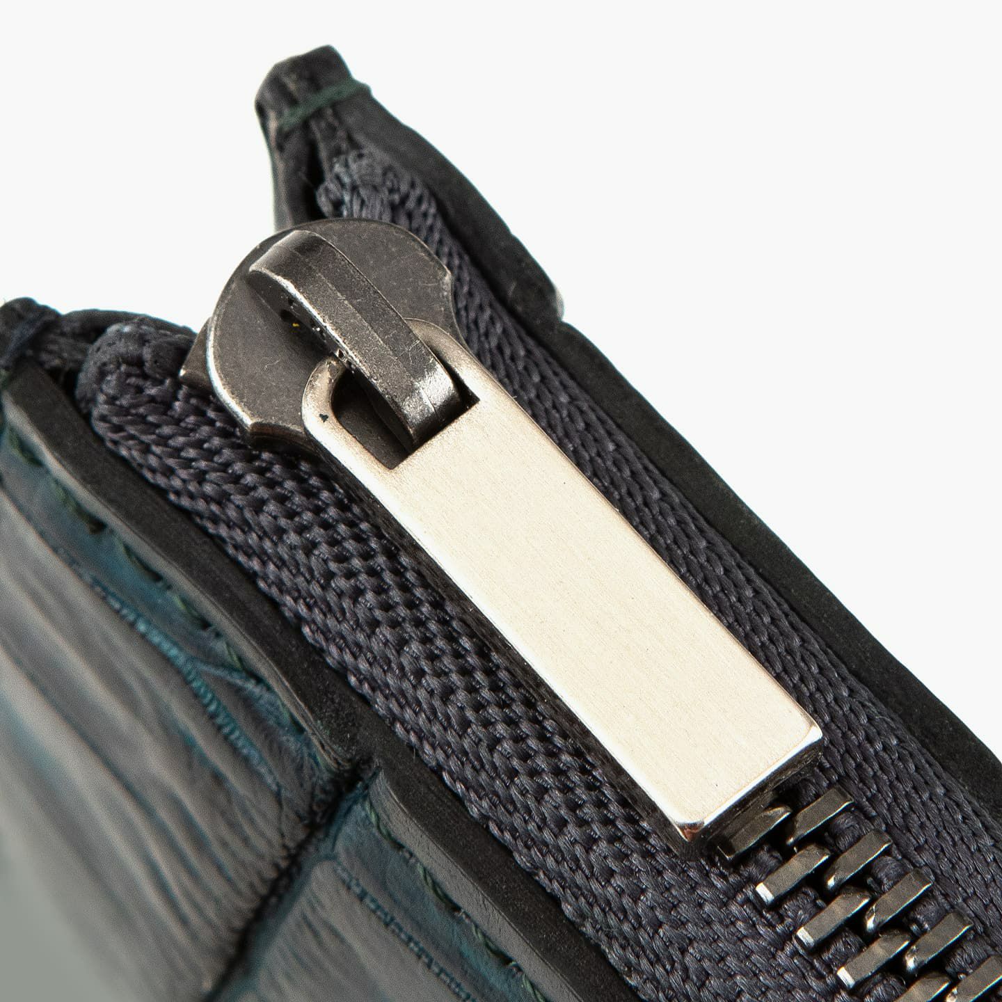 「ナイルクロコダイル」の重厚感と相性が良いクローム仕上げのファスナーは、すべての務歯に研磨が施されたYKK製を採用し、グレーのファスナーテープとともにクールさを引き立てるアクセントとして貢献。使い始めは若干の硬さを感じるかもしれませんが、次第に流れるようなスムーズなスライドになっていきます。