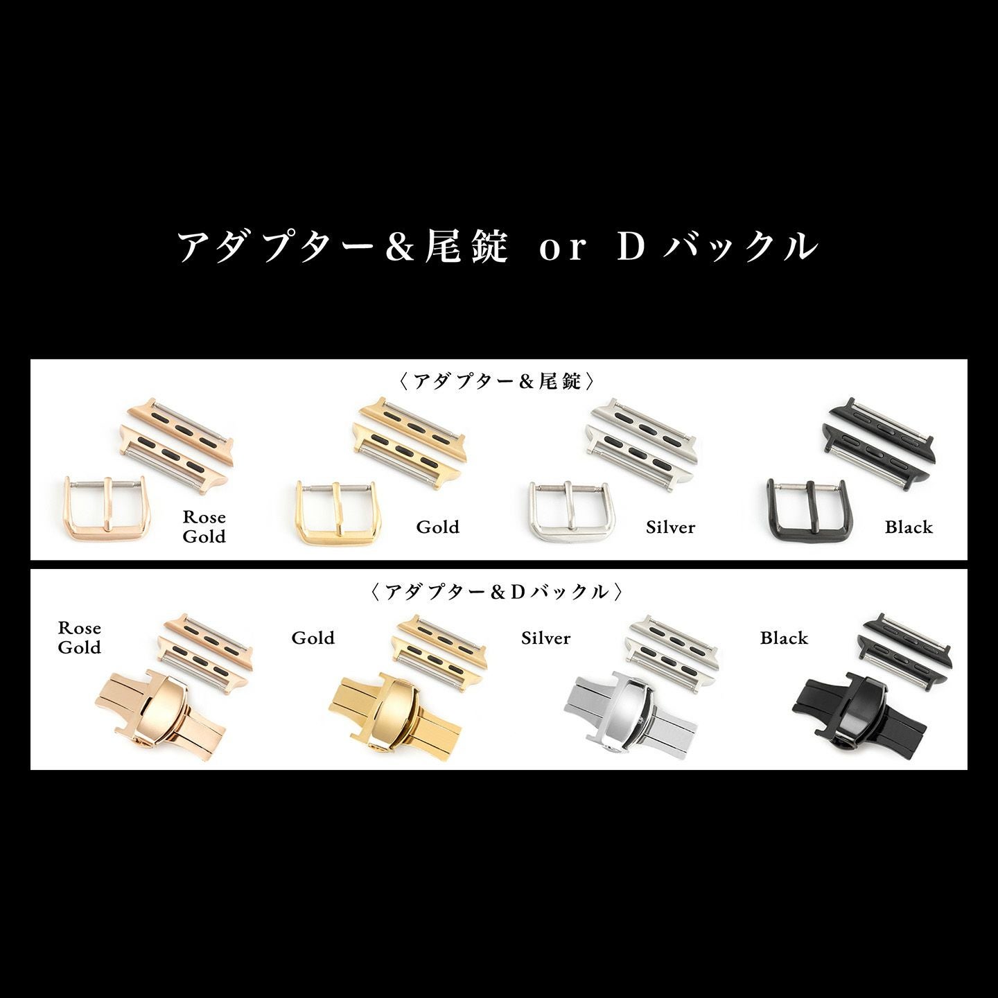 とても丈夫で美しい手縫いの芸術「クチュール・セリエ」で、2.0mmのフラットなフォルムを仕上げた、シックなデザインの時計ベルト。洗練されたアップルウォッチと合わせることで、エレガントな高級感を演出してくれます。また、手首周りサイズを6種類から選択できるとともに、「アダプター & 尾鍵」「アダプター & Dバックル」のいずれかを、Silver/Gold/Black/Rose Goldの4色から選んでオーダーできるのも魅力。さらに、表面の「クロコダイル」は6色から、裏面の「ツェルマット」は2色から、それぞれセレクトして、自分らしいカラーリングで腕周りを引き立てられます。
