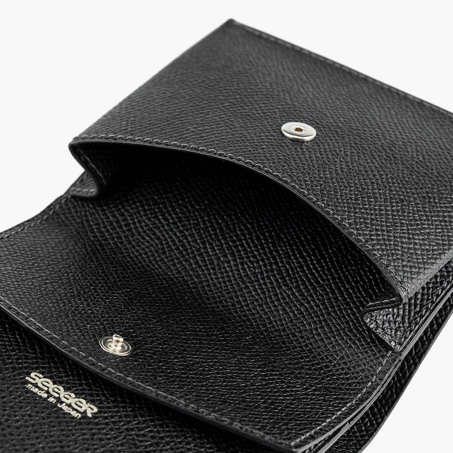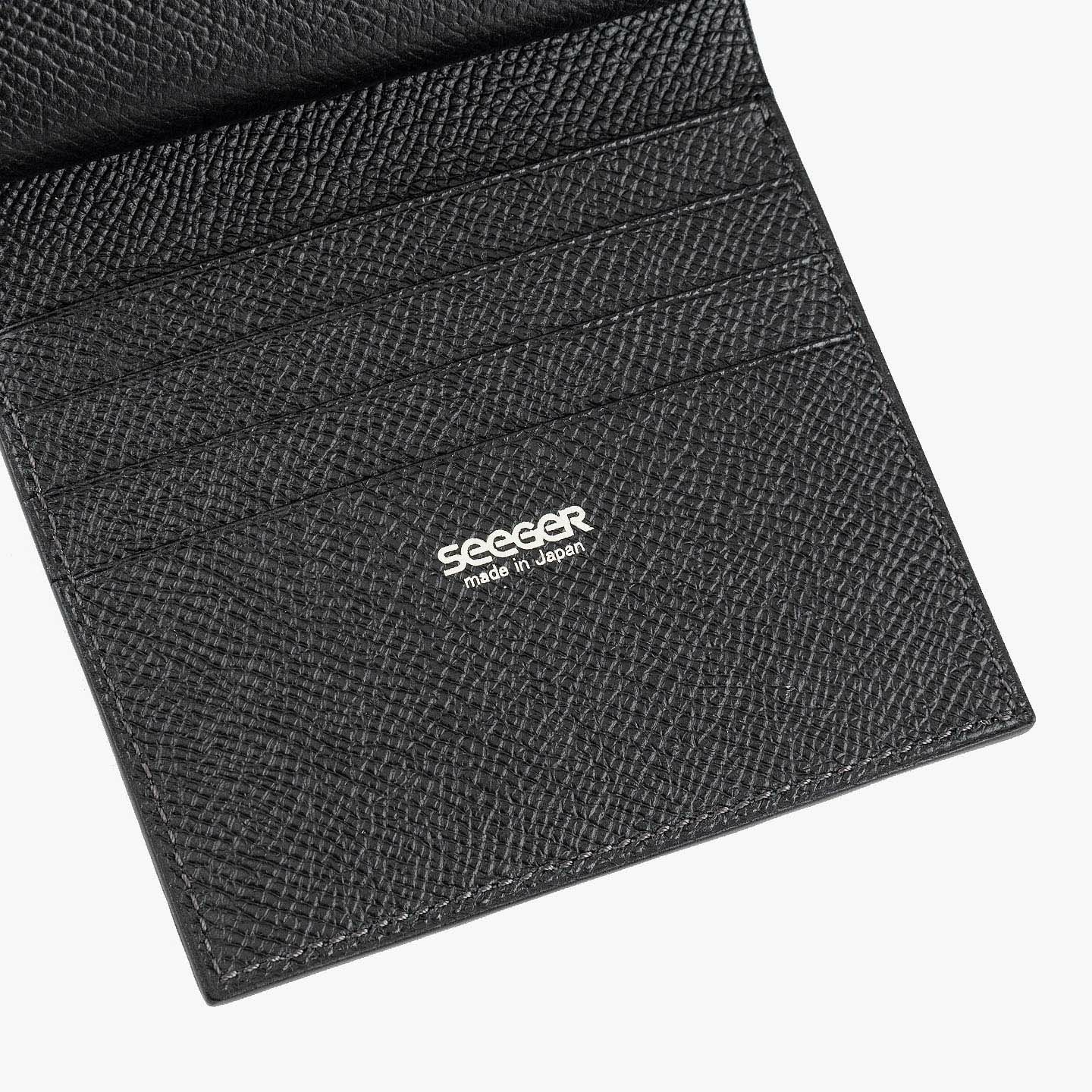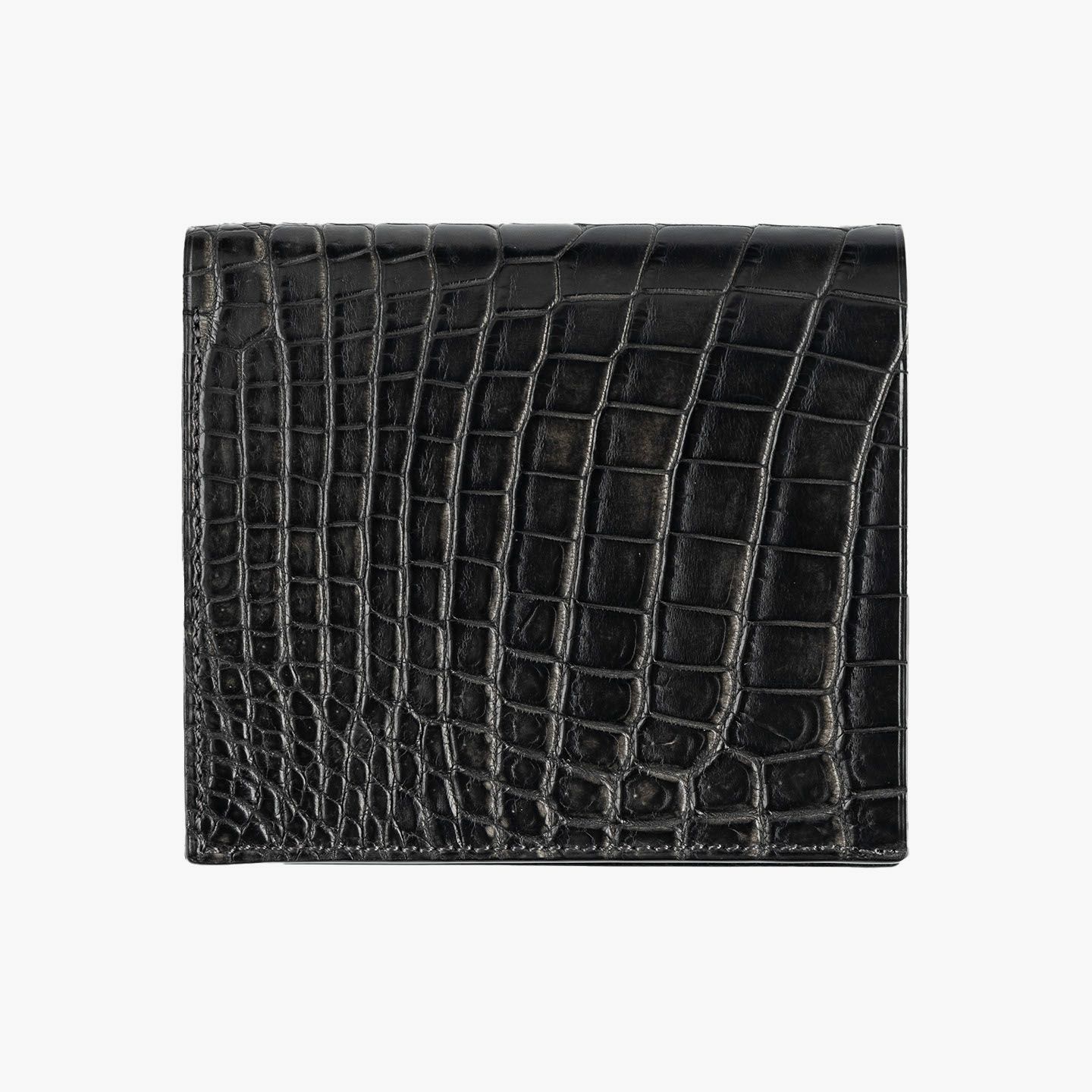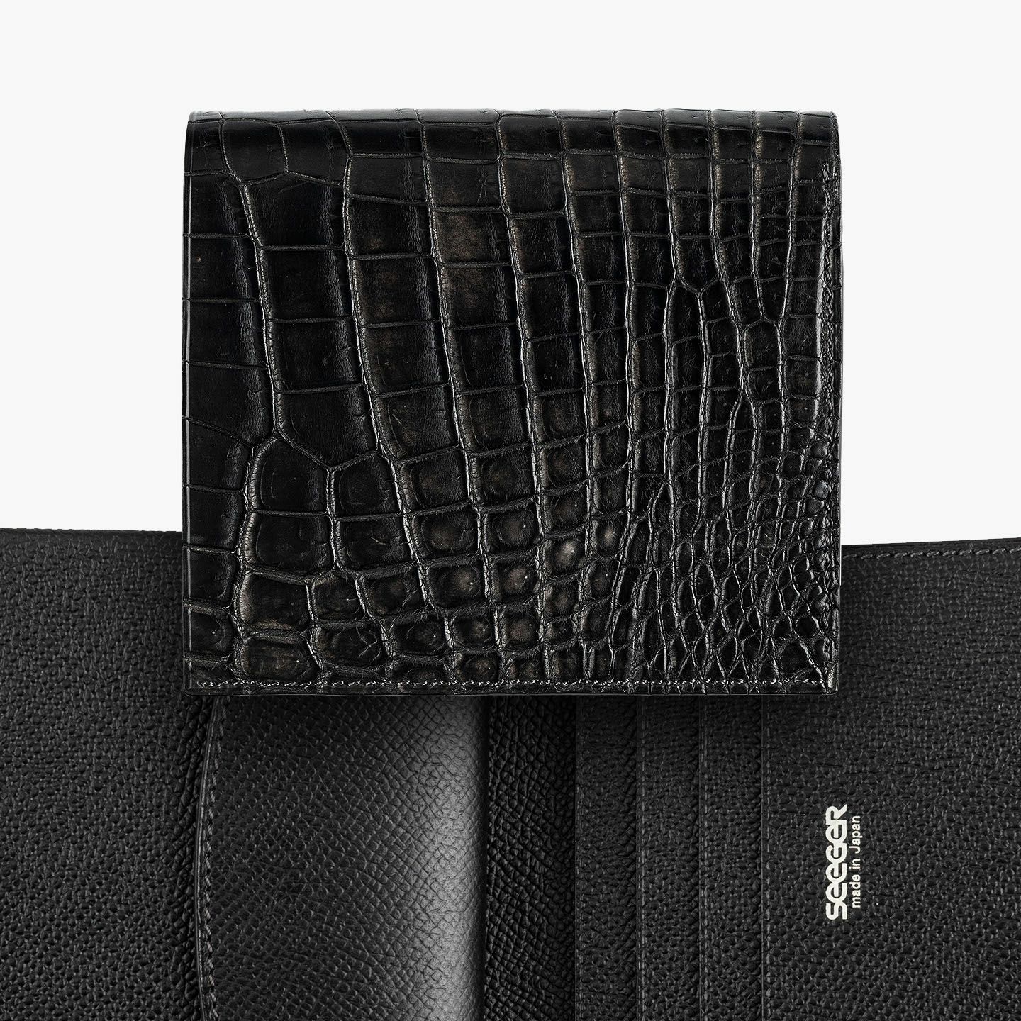 ドイツで1889年に創業し、世界中のセレブリティから愛されながらも衰退してしまうが、日本の職人たちの手で現代に蘇らせたブランド『SEEGER』の二つ折り財布“Perseus”。外装として纏わせた「墨染めクロコダイル」は、環境に配慮した“メタルフリー”で鞣し、墨汁による染色を施した贅沢なマテリアル。内装には、高級感があり小キズにも強い、型押し牛革「ボーダーハード」を採用。異なる質感・表情をブラックカラーで統一させることで、重厚感と極上感を併せ持たせながら、ややコンパクトにしたサイズ感がスマートな扱い心地へ。魅惑的な美しい表情と、スリムさを追求した佇まいが、洗練された大人のクールさを漂わせてくれる。