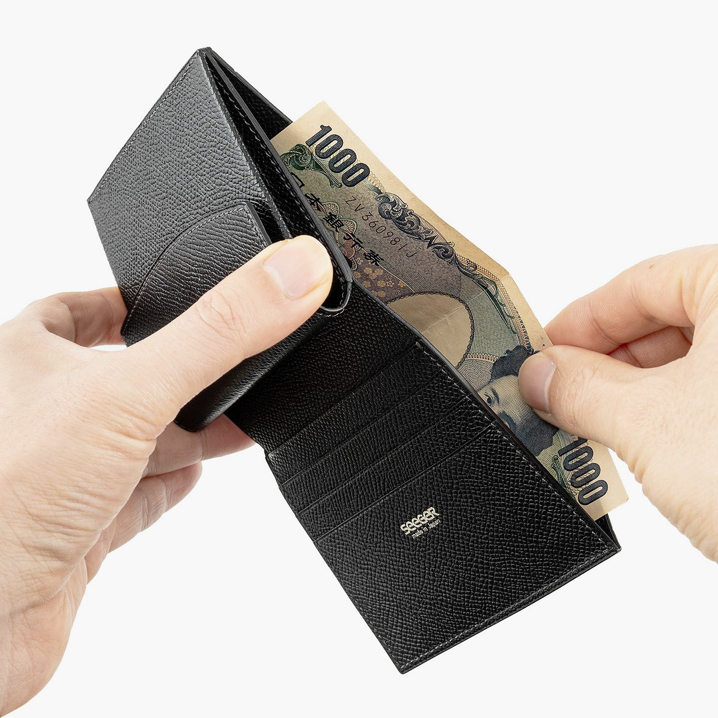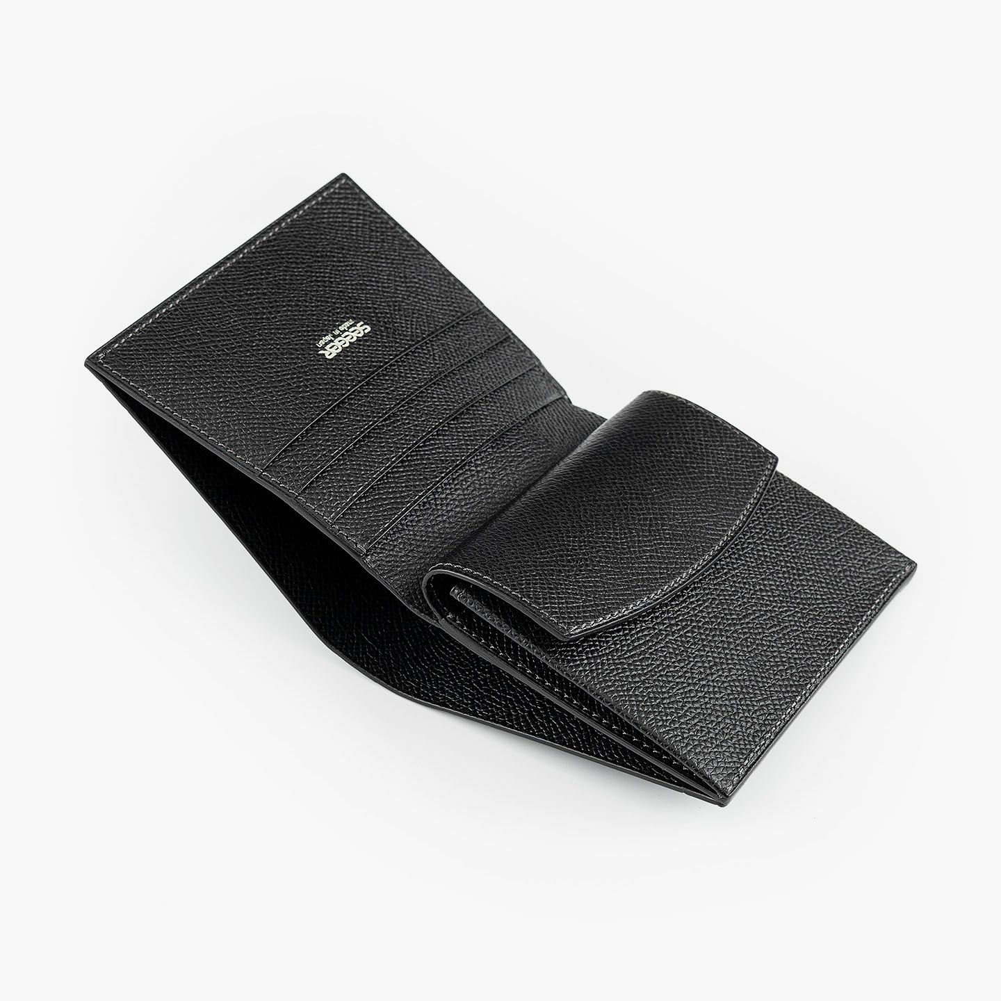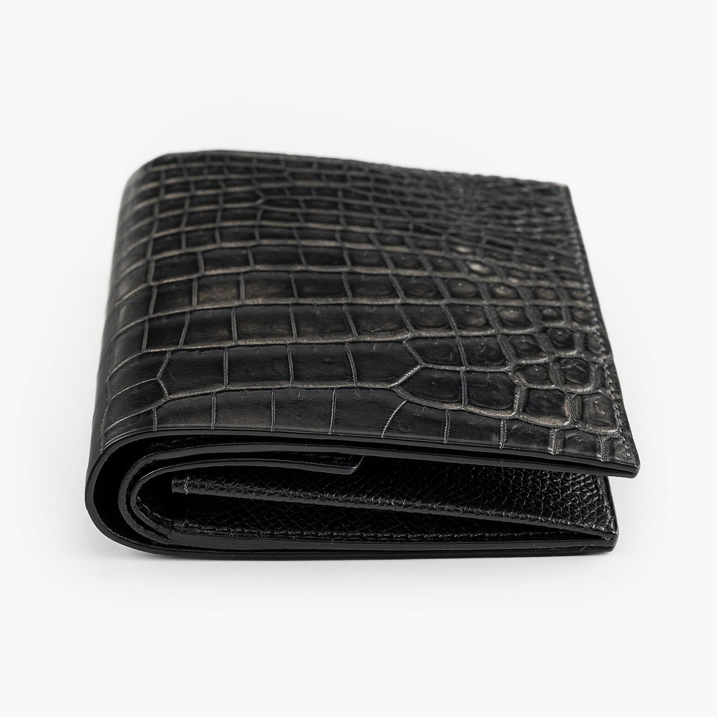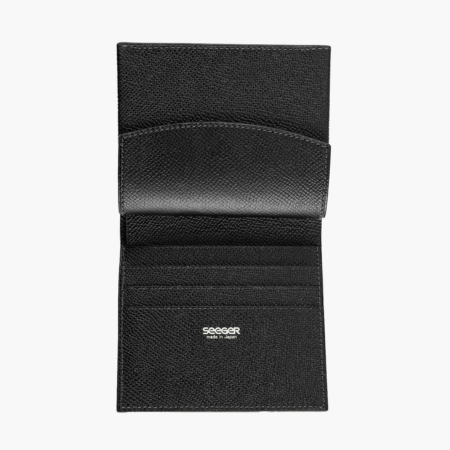 ドイツで1889年に創業し、世界中のセレブリティから愛されながらも衰退してしまうが、日本の職人たちの手で現代に蘇らせたブランド『SEEGER』の二つ折り財布“Perseus”。外装として纏わせた「墨染めクロコダイル」は、環境に配慮した“メタルフリー”で鞣し、墨汁による染色を施した贅沢なマテリアル。内装には、高級感があり小キズにも強い、型押し牛革「ボーダーハード」を採用。異なる質感・表情をブラックカラーで統一させることで、重厚感と極上感を併せ持たせながら、ややコンパクトにしたサイズ感がスマートな扱い心地へ。魅惑的な美しい表情と、スリムさを追求した佇まいが、洗練された大人のクールさを漂わせてくれる。