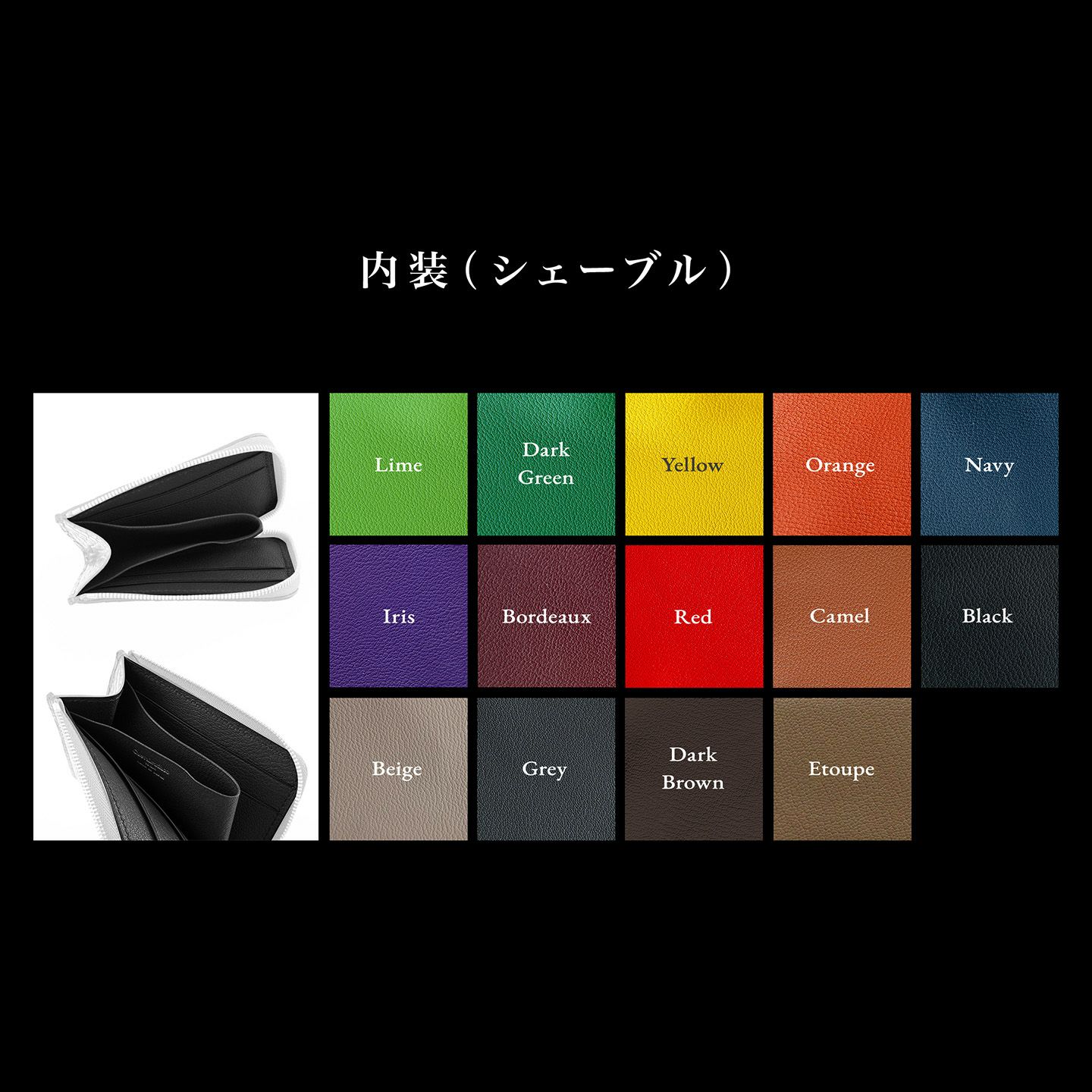 美しく鮮やかな発色と、繊維密度が高い丈夫さが魅力な、凹凸がはっきりと深いシボの高級皮革「Chervre(シェーブル)」。
