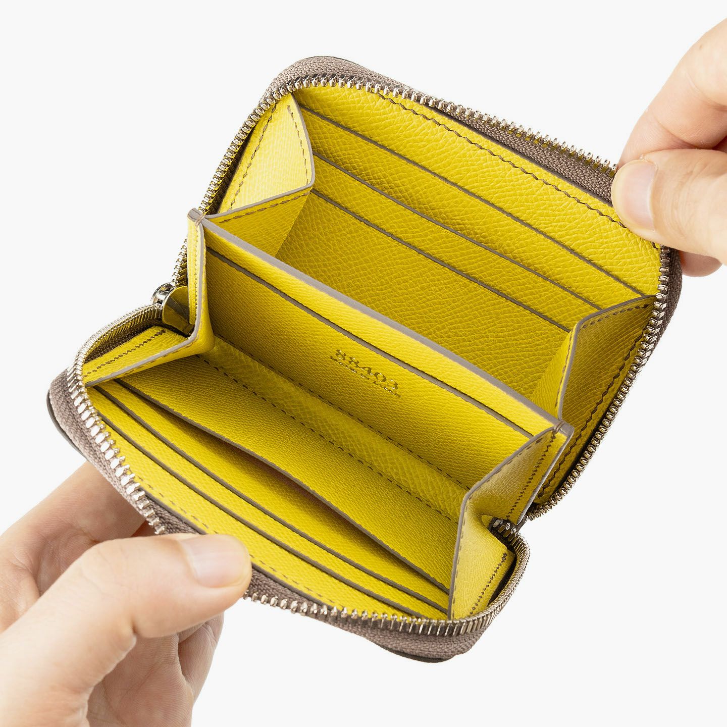 大きく開くマチで使いやすく、センターの仕切りの片側にはカードポケット1つを備え、頻繁に出し入れするカードの収納などに便利。その仕切りの両サイドに1つずつフリースペースが設けられ、紙幣(二つ折り)・小銭・レシートや計5つのカードポケットに収まり切らなかったカードなど、フレキシブルに使いこなせる設計になっています。外装・内装の「ダービー」は、それぞれ発色の良い7色からセレクトでき、日本の革小物の伝統技法「切り目磨き」のコバは、カラーオーダーの組み合わせによりブラックもしくは最適なカラーをブランドが選択。美しい総手縫いによる味わい深いステッチの糸色も、高級麻糸「MeiSi Superfine Linen Thread」の豊富な25色から選べます。さらに、ファスナーも、外装カラーと統一されたファスナーテープの色を想定しながら、Silver・Goldのいずれかからチョイス。多彩な色の組み合わせから自分で自由にコラーコーディネートでき、オリジナル品のようにセレクトオーダーできるのも魅力になっています。