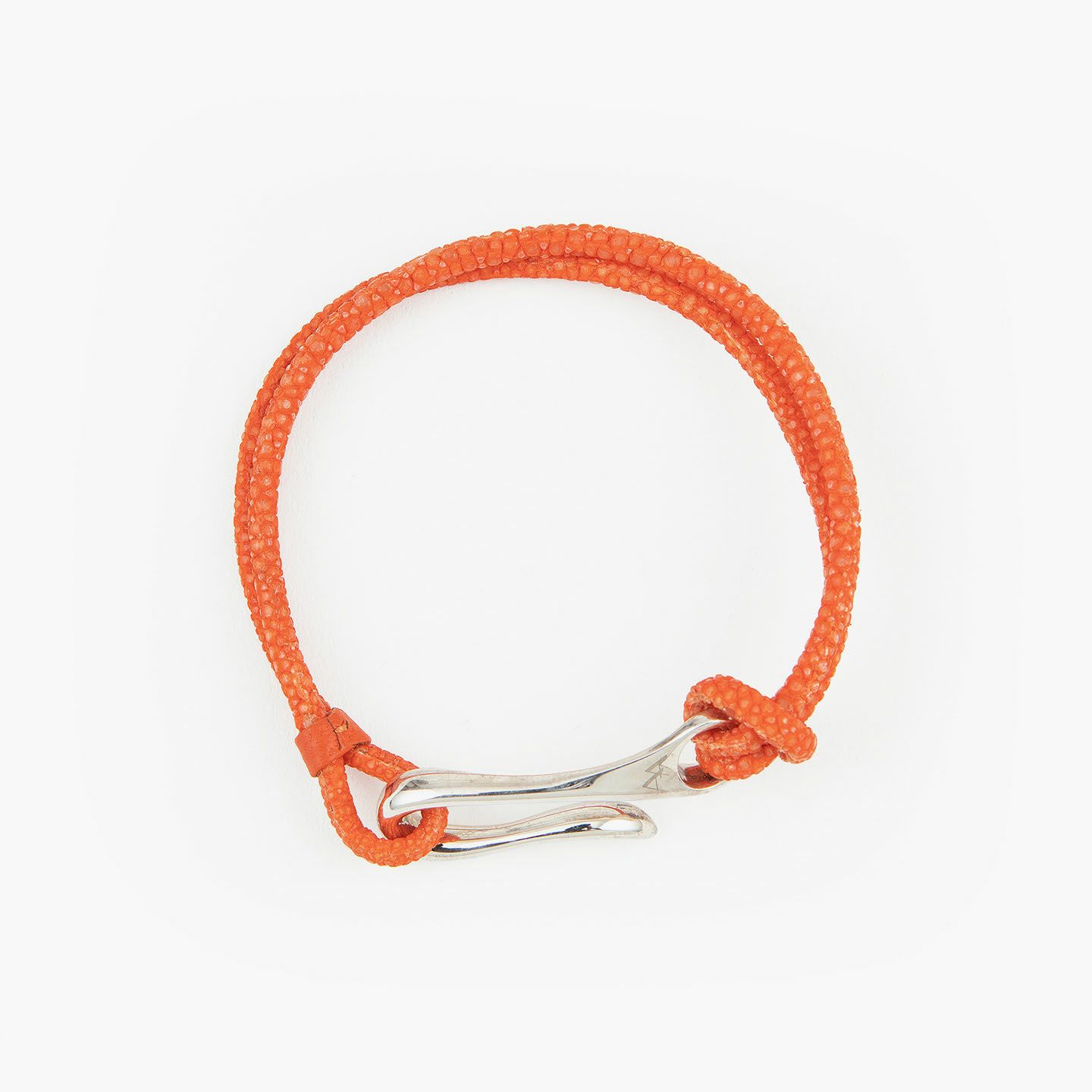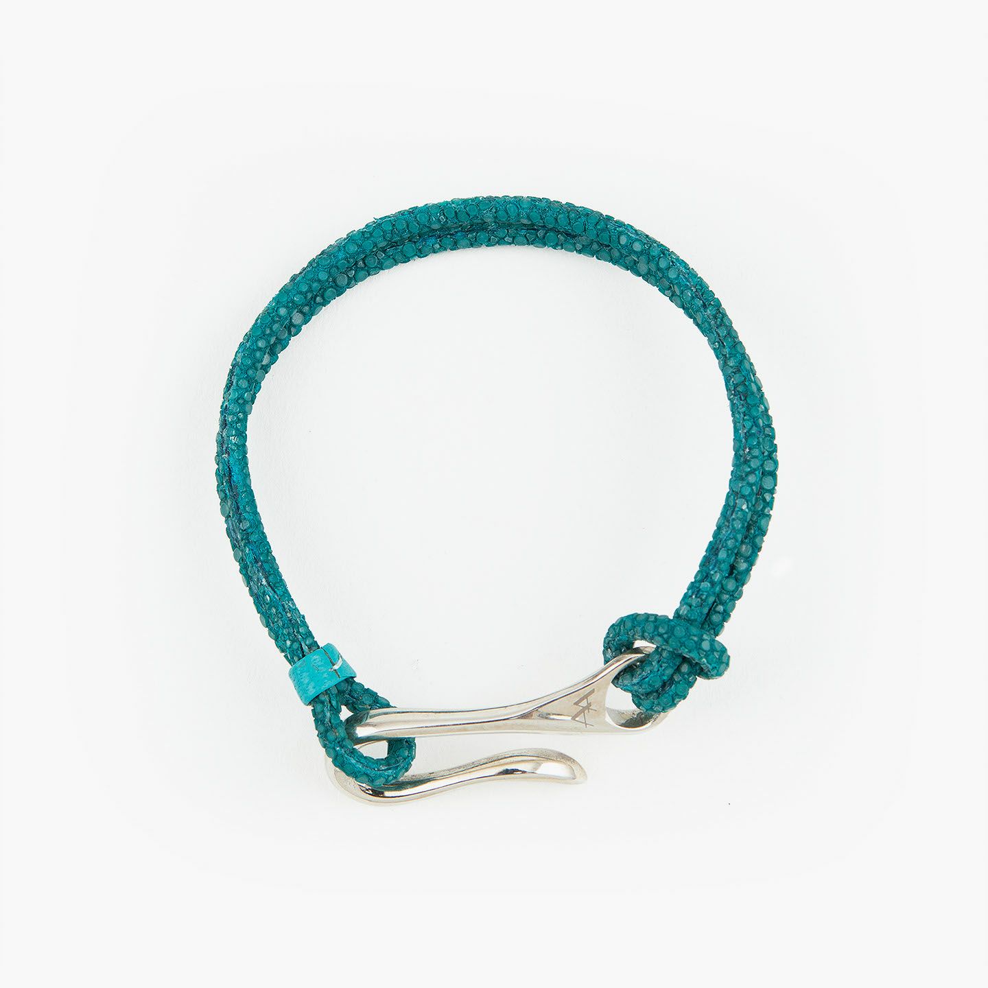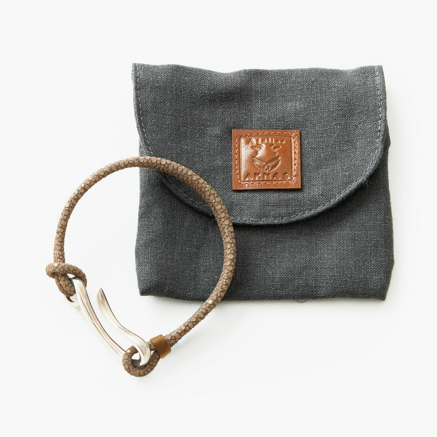 ブランドのコンセプトとして“Cuirs D'ailleurs 〜旅するレザー〜”を掲げ、他の人たちとは違ったクールで洒落た人生の旅へと導く、『Atelier AKNAS』のWロープ ブレスレット。古来より縁起が良いと重宝されて“幸運の魚”とも呼ばれるエイ革「ガルーシャ」を、贅沢にも3mmコードのダブルロープとして採用し、熟練の職人が無垢の「シルバー925」をハンドメイドで加工した、特長的なフック形状でキレイに磨かれた留め具に、そのコードを引っ掛けるだけで装着できる秀逸なアイテム。洗練されて研ぎ澄まされたフックのフォルムが、豪華客船のような美しい佇まいを感じさせ、きらめく海原の優雅な光のエスプリを抱かせてくれる。
