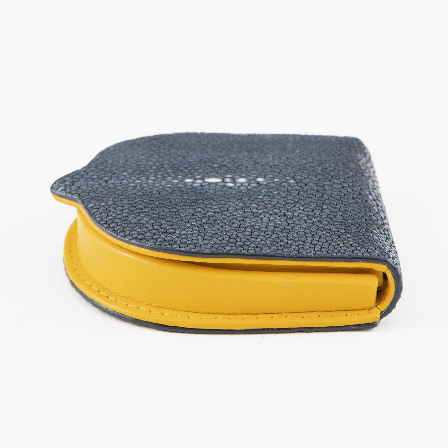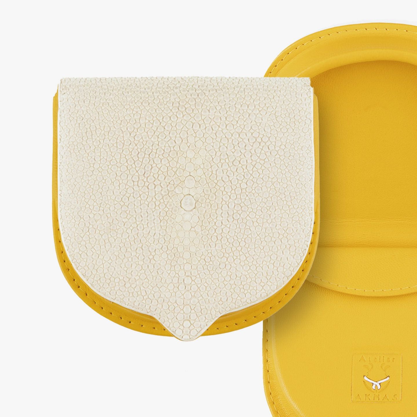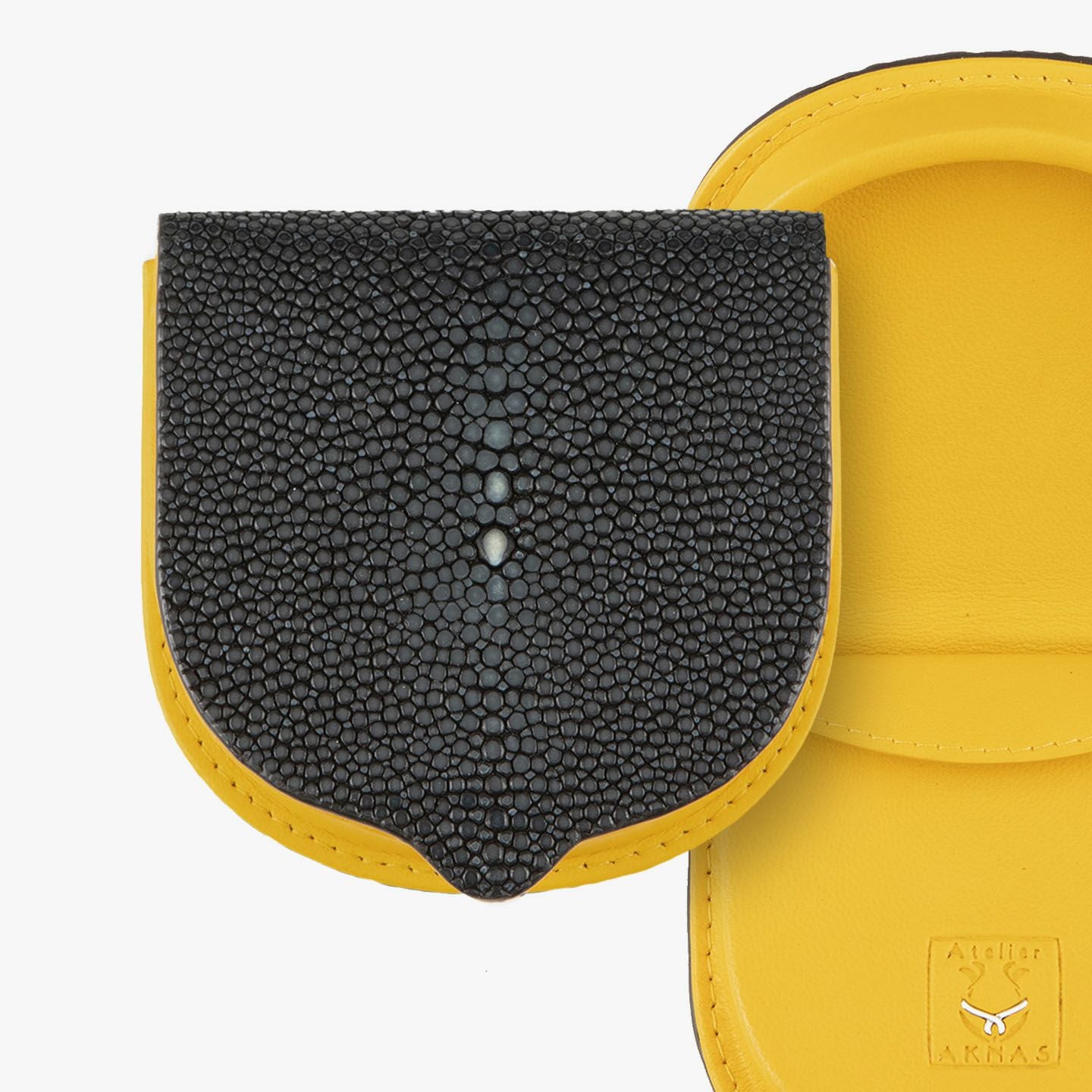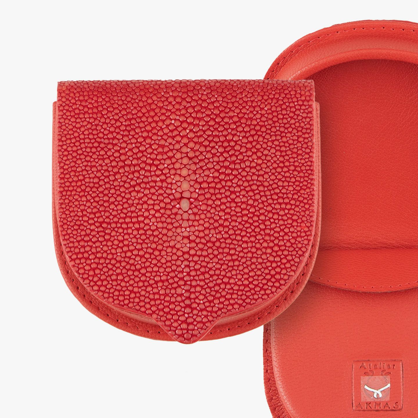 他とは違う美学のブランドとして、「いつも一緒に人生の旅の時間を刻んでいく革製品でありたい」という想いを込めている、『Atelier AKNAS』の馬蹄型コインケース。馬蹄のようなフォルムの個性的なスタイリッシュさと、コインポケット1つ・マルチポケット1つ(カブセ裏)のみを備えた構造のシンプルさによる、ひとつ上のセンスを醸すアンビバレントな融合が独創的。小さい鱗が高級感を漂わせるエイ革「ガルーシャ」と、鮮やかなカラーで上質なイタリア産「山羊革」が、異素材ならではの存在感を互いに主張しながら、古来より“ラッキーフィッシュ(幸福の魚)”と呼ばれている縁起が良さも、大人の幸福感を満たしてくれる。