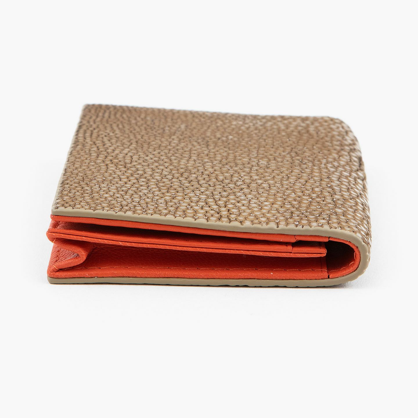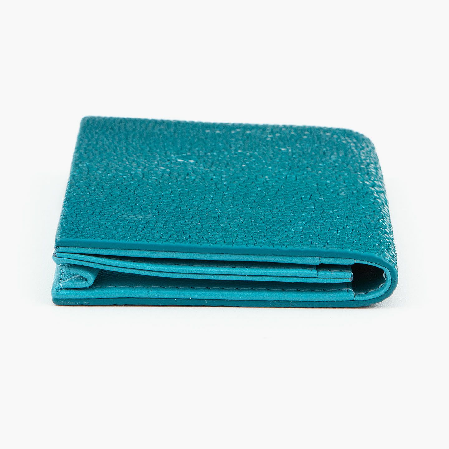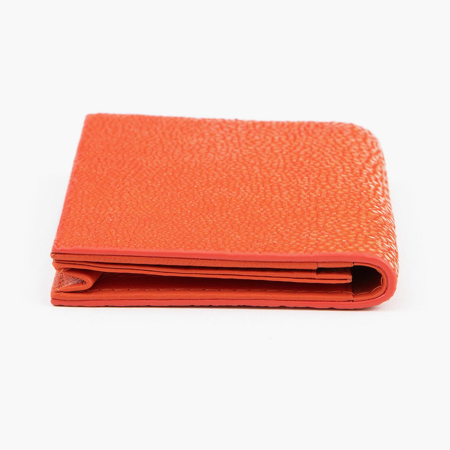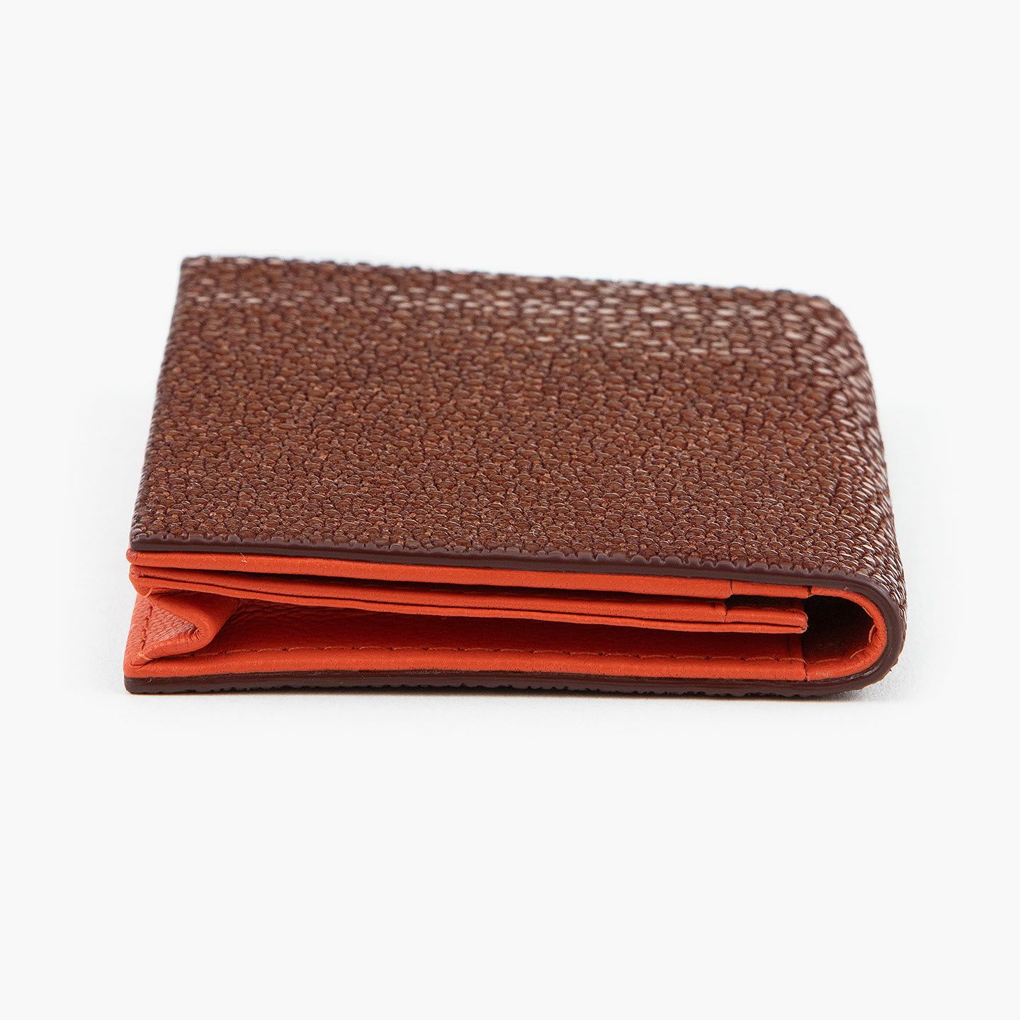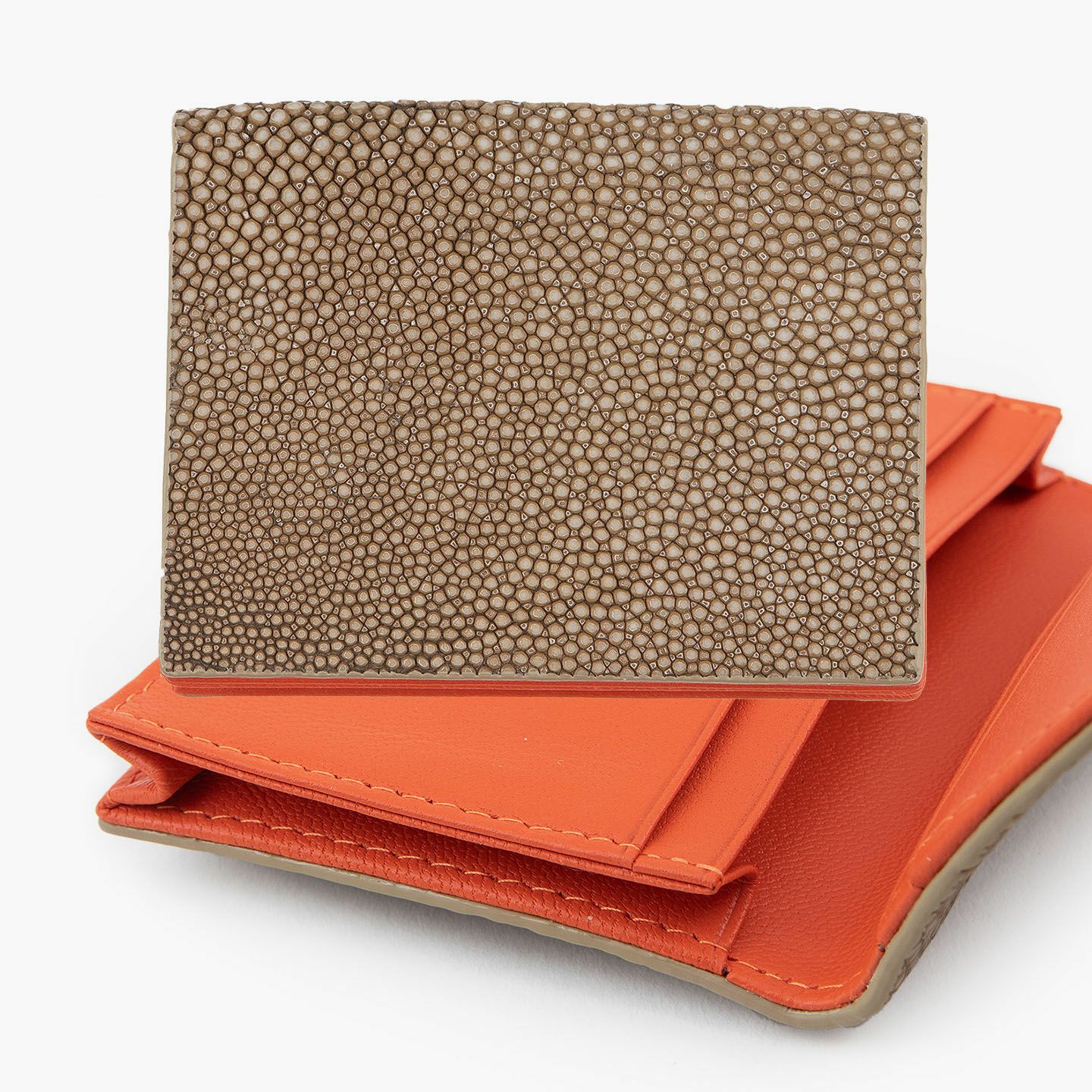 革製品としての最高のパフォーマンスを実現するために、革職人たちが飽くなき探求と努力、クリエイティビティとクオリティを追求しているブランド『Atelier AKNAS』の名刺入れ(S)。メインポケットには、紙袋のように底部までマチが付いている「通しマチ」を採用し、一般的な名刺の厚さであれば30枚ほどまで入れられるとともに、3つのサブカードポケットも備えて名刺の仕分けができ、その収納性と実用性で貢献。ガラスビーズを散りばめたような小さな鱗が美しいたエイ革「ガルーシャ」を、外装として贅沢に纏わせながら、古来より“ラッキーフィッシュ”と呼ばれてきた縁起の良さも、ビジネスシーンにもたらしてくれる。