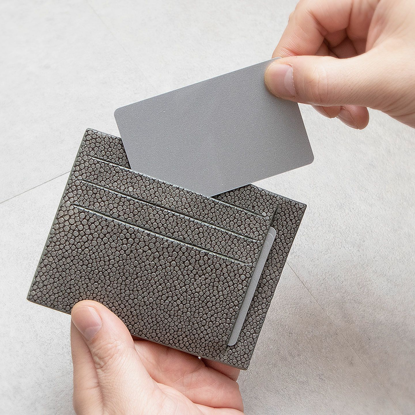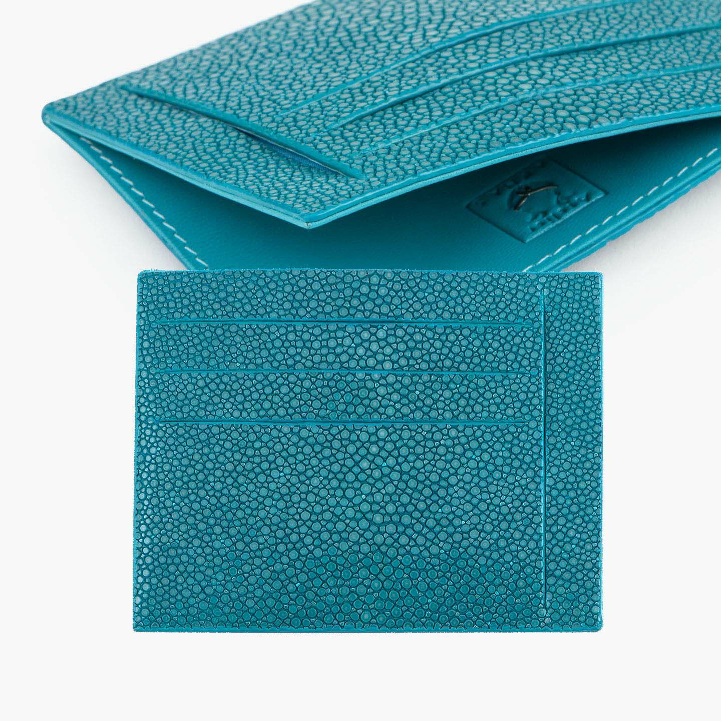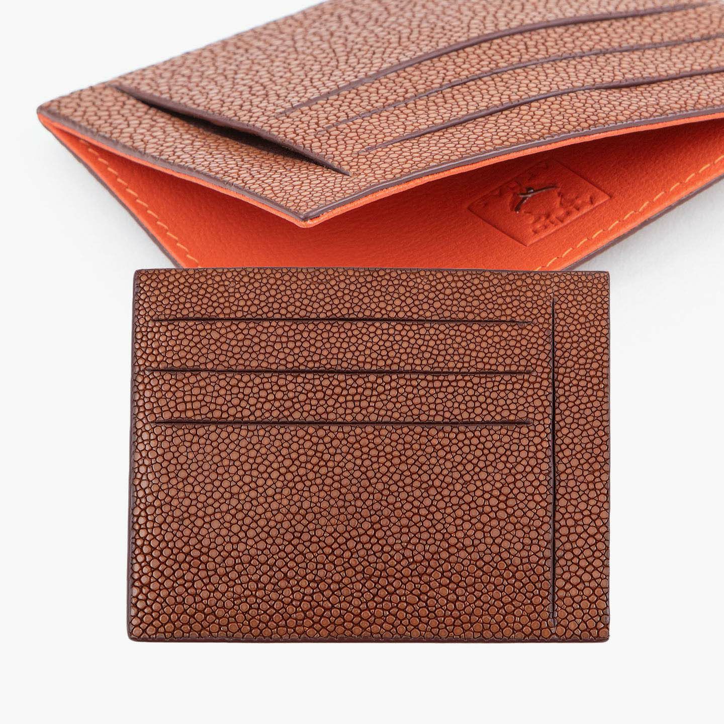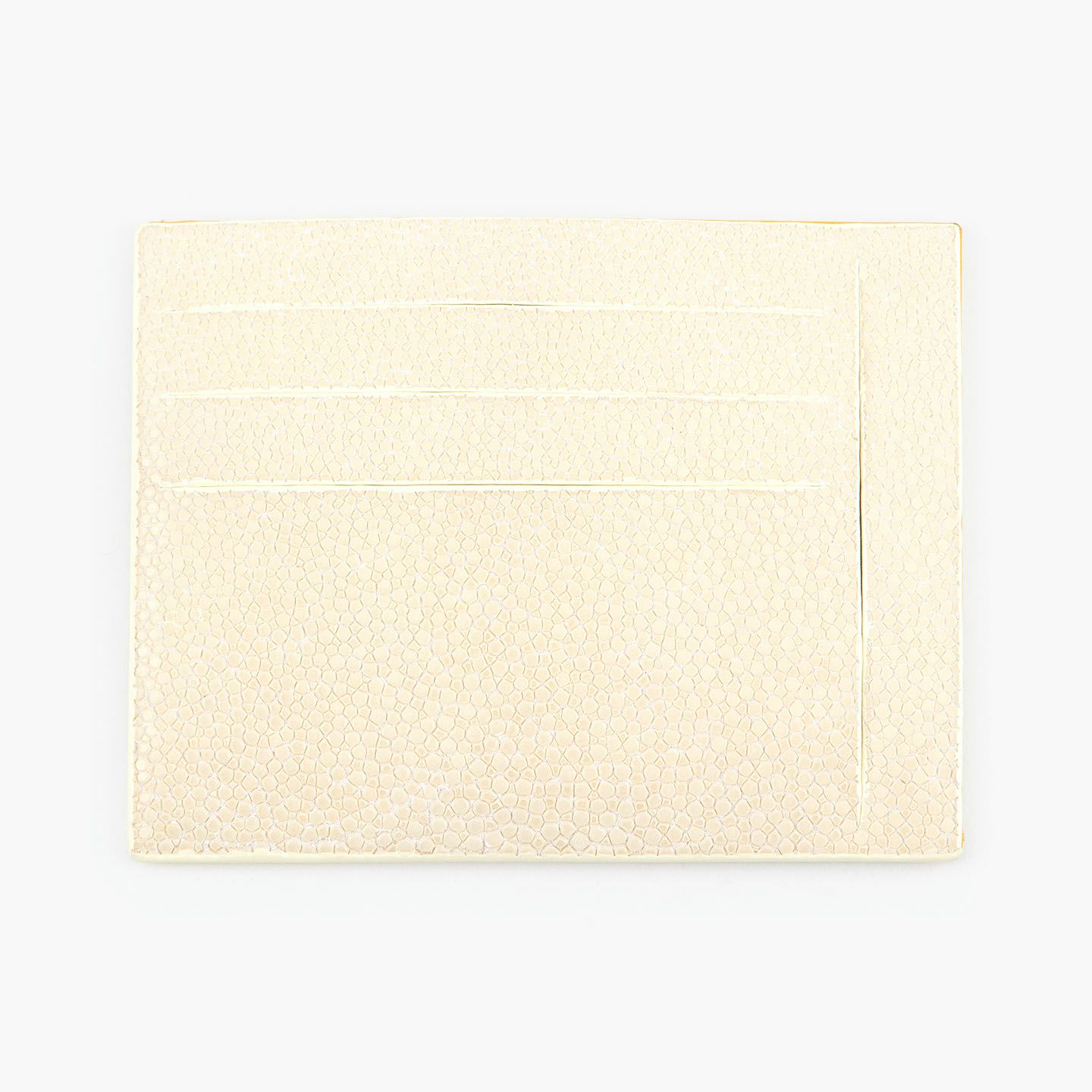 コンセプトに“Cuirs D'ailleurs 〜旅するレザー〜”を掲げ、他の人たちとは違った美学によるクールで洒落た人生の旅へと誘う、ブランド『Atelier AKNAS』のスリット札ばさみ。美しく覆っているガラスビーズを散りばめたような小さな鱗と、地中海の潮風を指先で感じるような冷んやりとした感触が魅力的な「ガルーシャ」を、外装として纏わせ贅沢感を演出。その両サイドに、無縫製の切り込みでフラットに仕立てたカードポケット各3つ(計6つ)・スリット式フリーポケット各1つ(計2つ)を備え、二つ折りの紙幣を簡単に差し込んで10枚ほど収納できる札入れとともに、金具を排したスリム&スマートな使用感をもたらしてくれる。